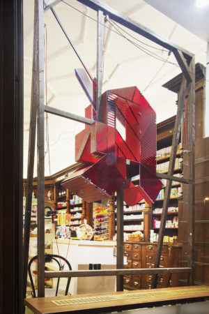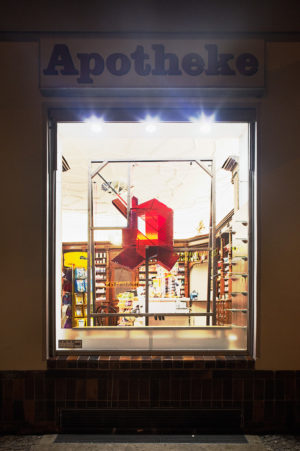 Die Installation zeigt ein Objekt, dass sich visuell zwischen dem Symbol der Apotheke und einem abstrakten Herz positioniert. Während der Passant auf dem ersten Blick das klassische Apotheken-A erkennt, entdeckt er auf dem zweiten Blick ein lebendes Organ, das rhythmisch seine Klappen bewegt und so ein gesundes, ruhig schlagendes Herz nachempfindet. Das Herz, der Motor des Körpers, als Symbol für Gesundheit und Leben, welche die Apotheke als ganzheitliche Einrichtung hier im Kietz gewährleisten möchte.