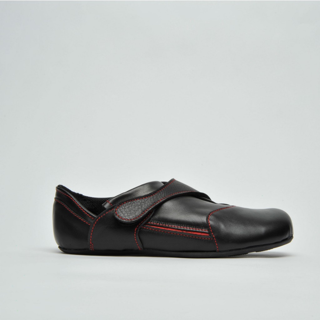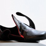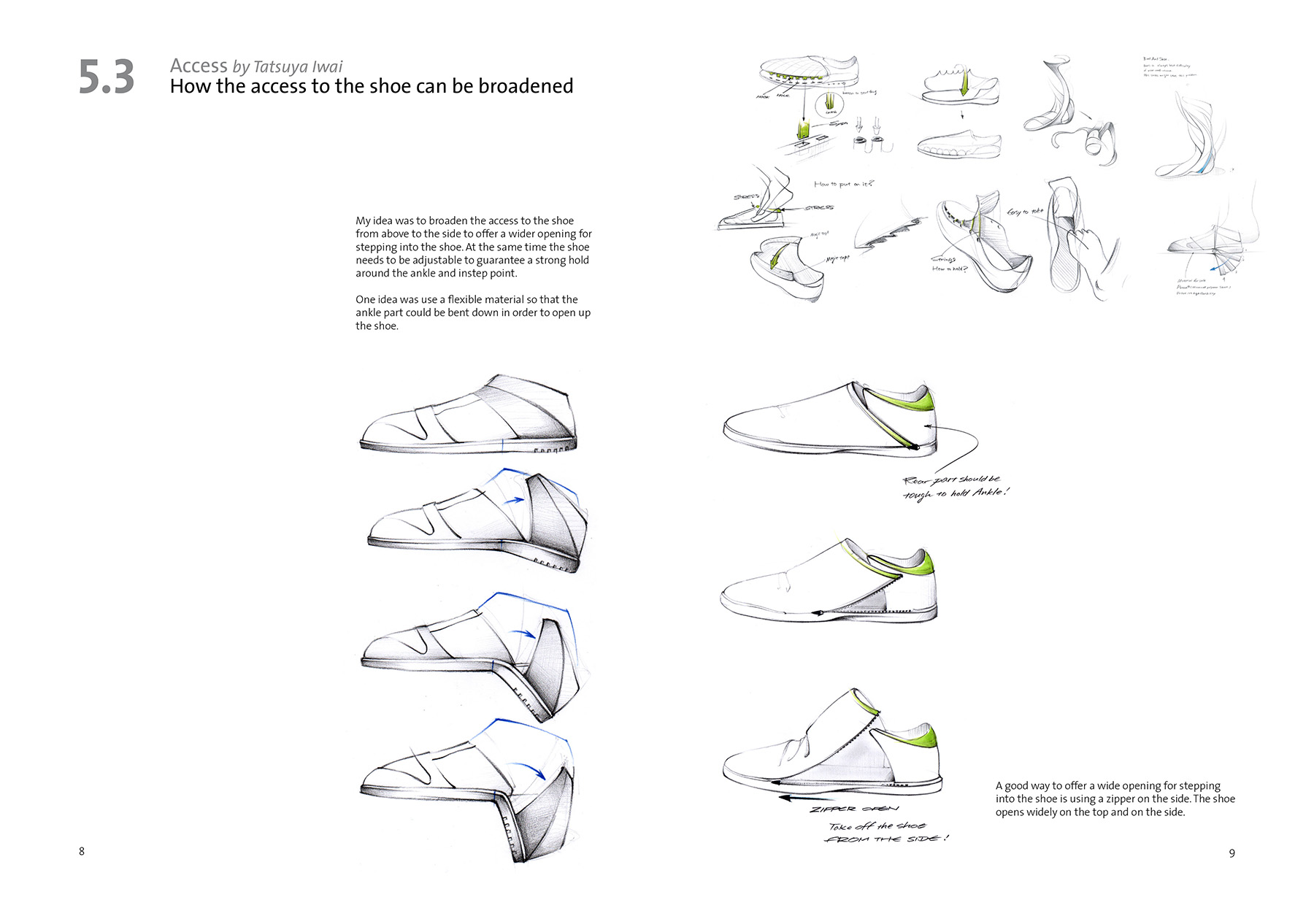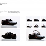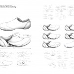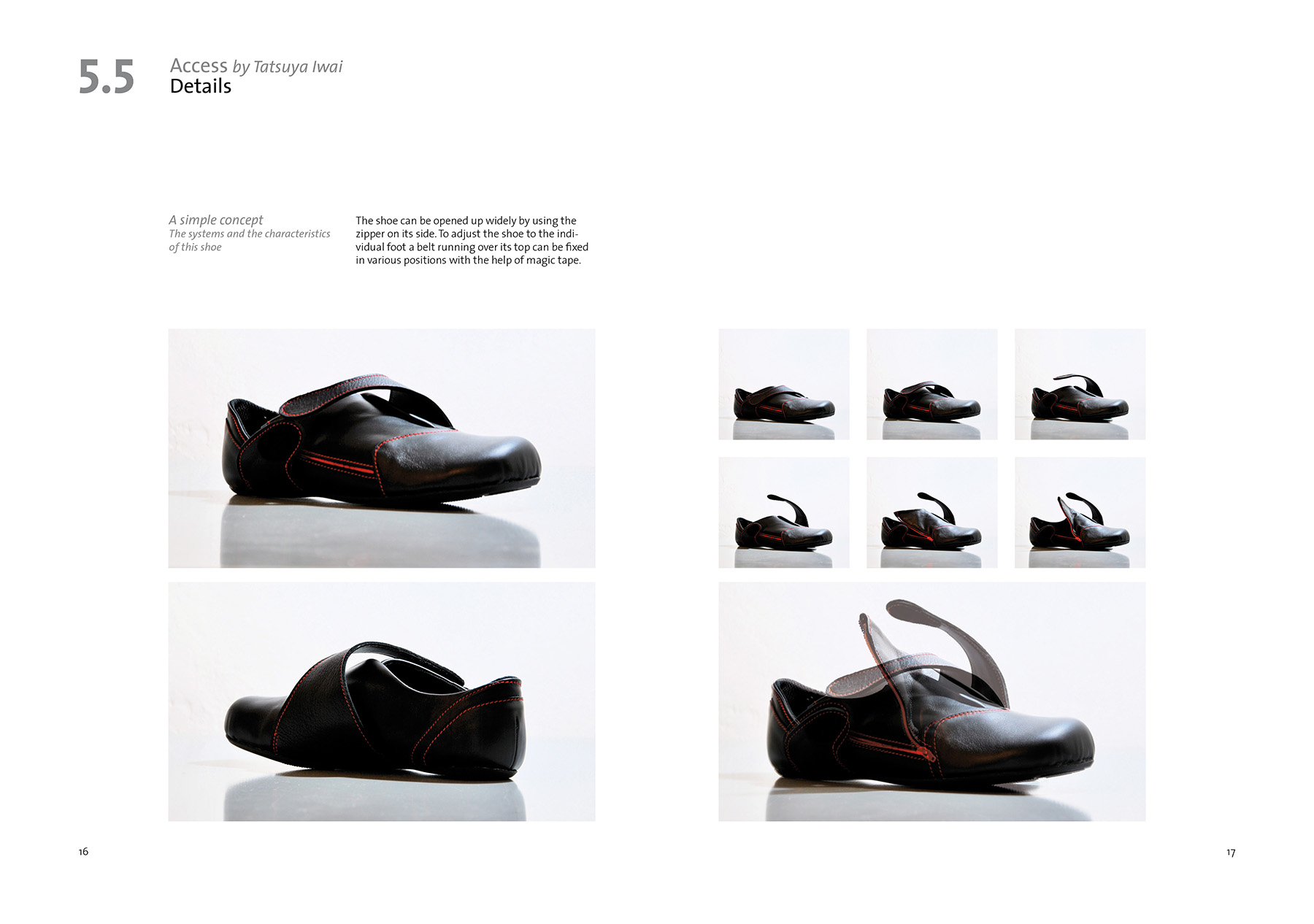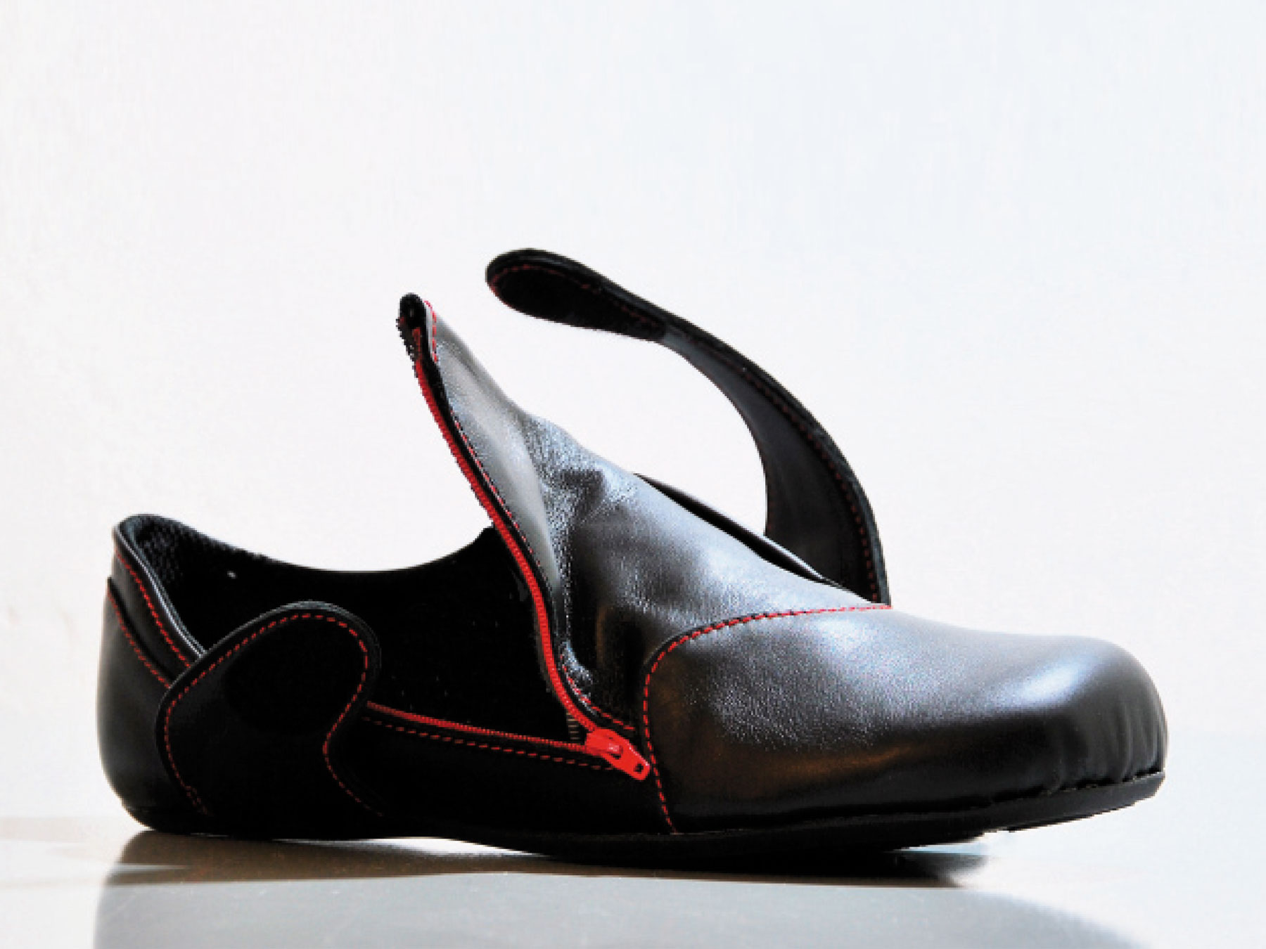 We often have to take on and off our shoes during daily life which can be inconvenient in some situations. My idea was to broaden the access to the shoe from above to the side to offer a wider opening for stepping into the shoe. At the same time the shoe needs to be adjustable to guarantee a strong hold around the ankle and instep point. The shoe can be opened up widely by using the zipper on its side. To adjust the shoe to the individual foot a belt running over its top can be fixed in various positions with the help of magic tape.