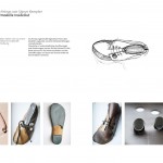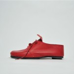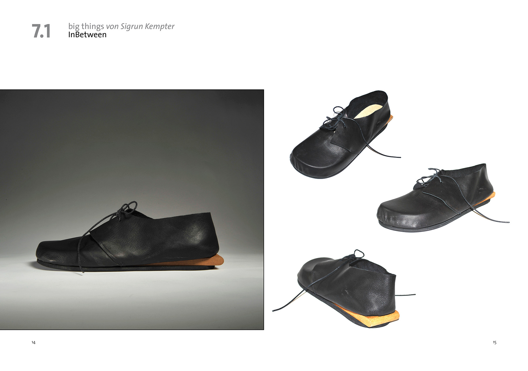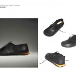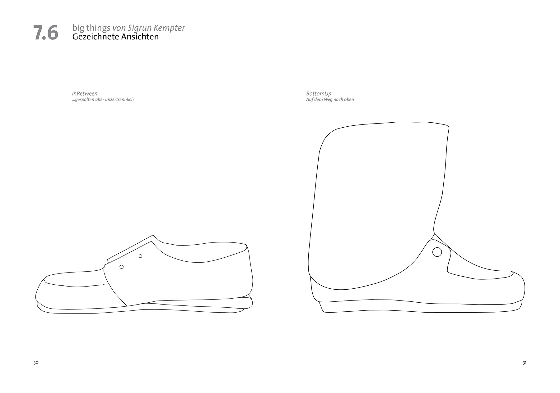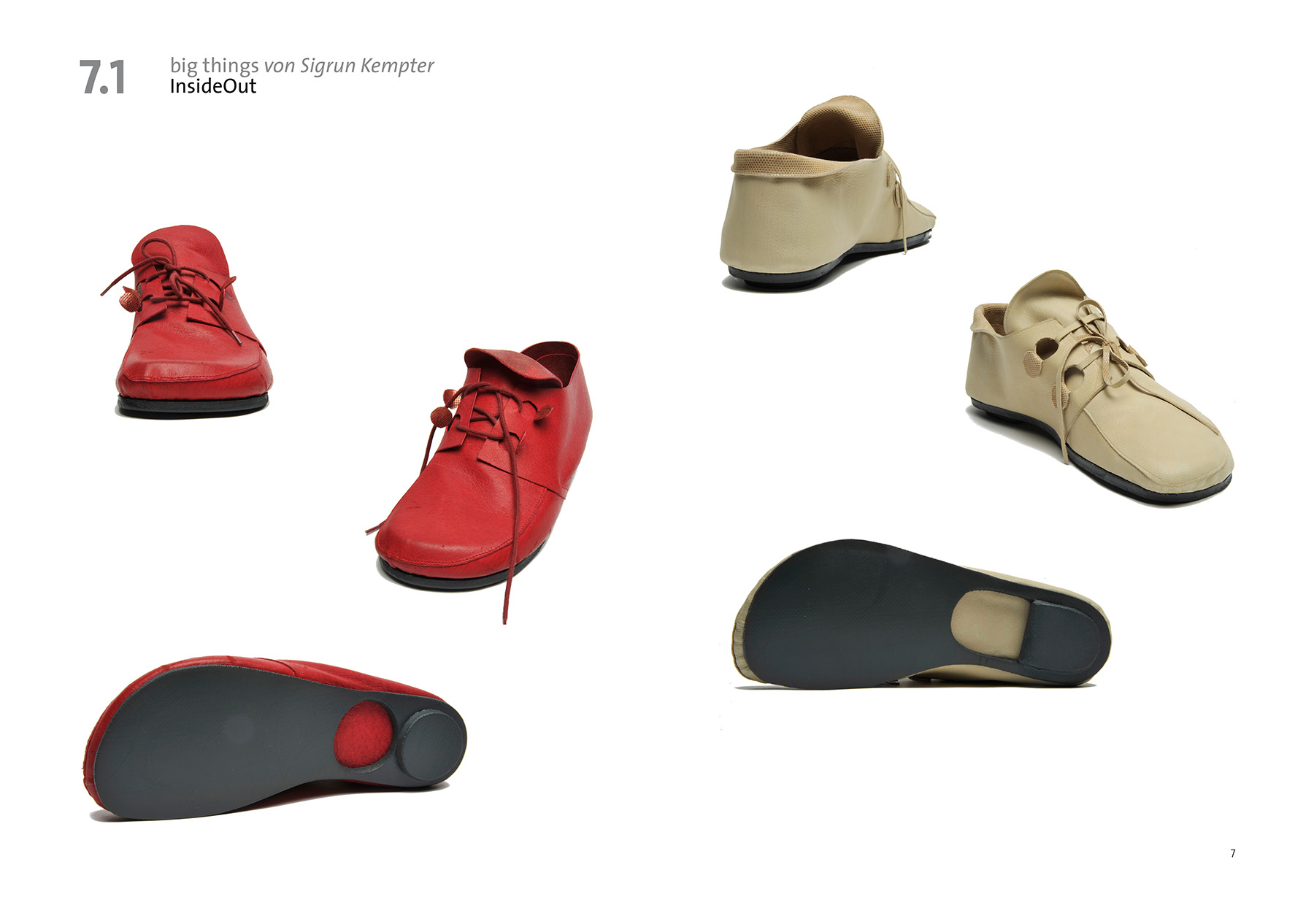 Übertriebene Details sind deutlicher zu erkennen und werden bewußter wahrgenommen. Bei diesen beiden Modellen klappen sich an mehreren Stellen Teile des Schuhs nach außen und zeigen die glanzvolle Innenseite. Die vergrößerten Ösenlöcher wirken wie geöffnete Luken. Durch das Aufklappen und sichtbar werden des Schuhinneren entsteht eine gewisse Intimität. Die Zunge schiebt sich nach vorn und reicht über die Spitze des Schuhs hinaus. Diese Bewegung verleiht dem Schuh eine dynamische Kontur.