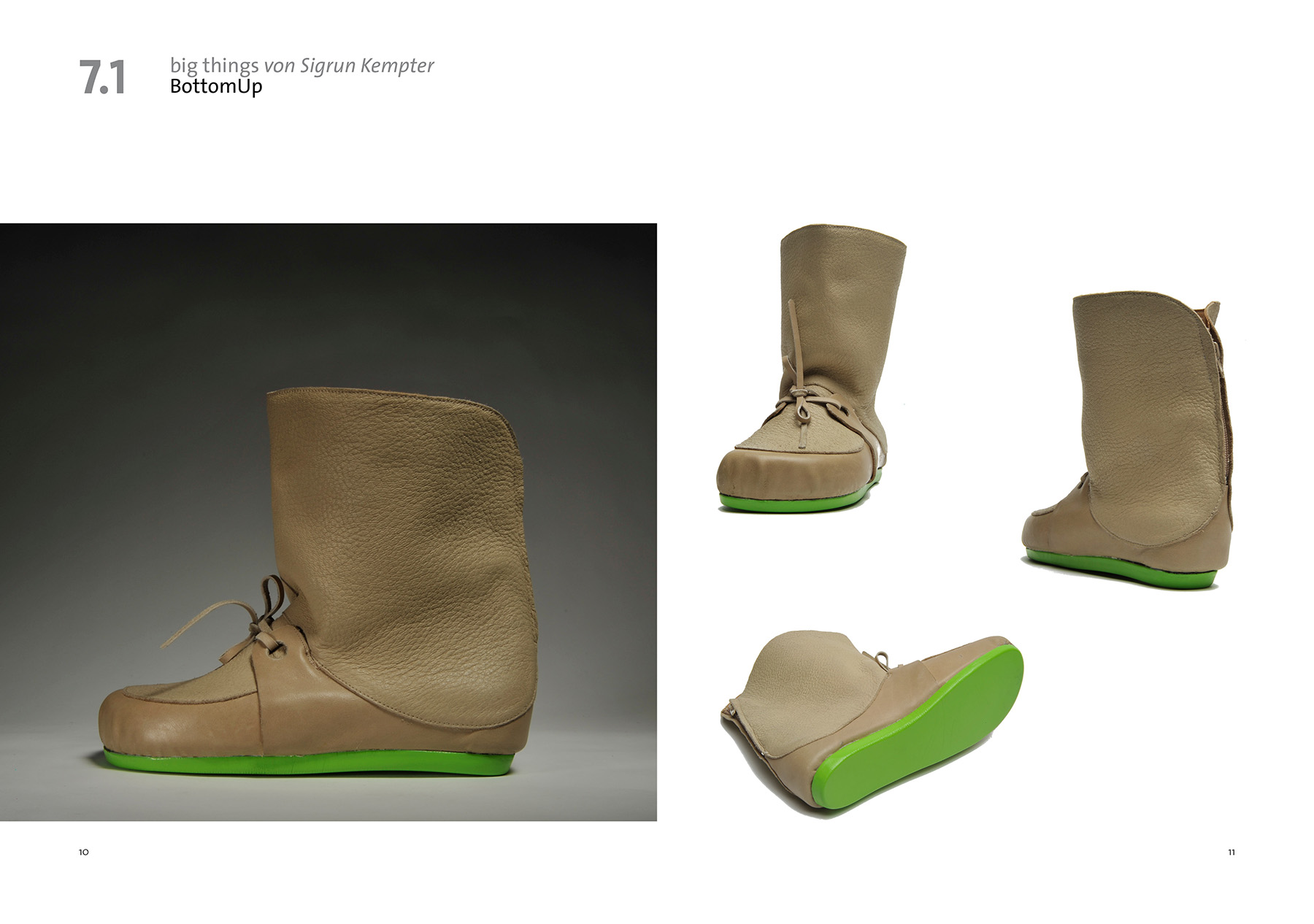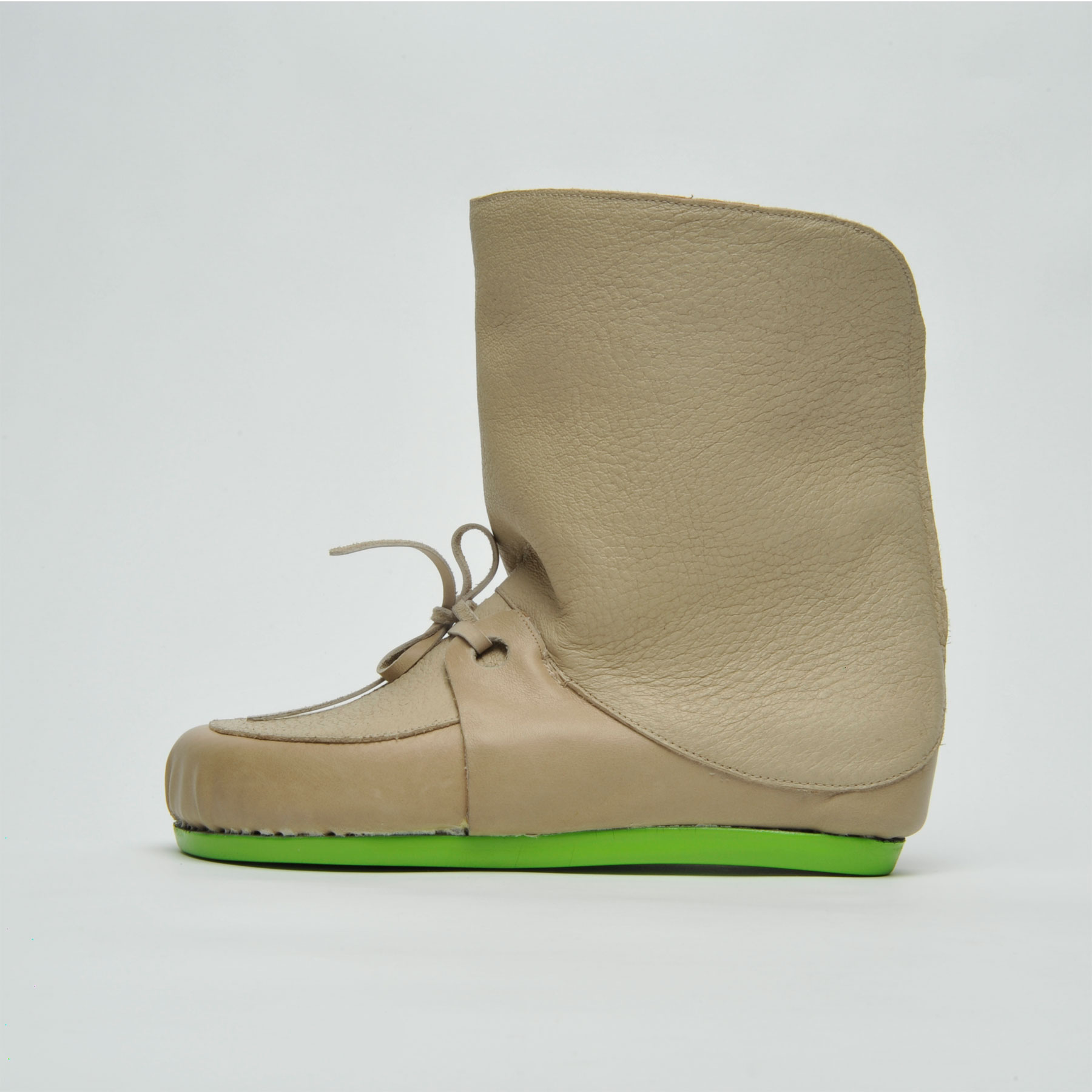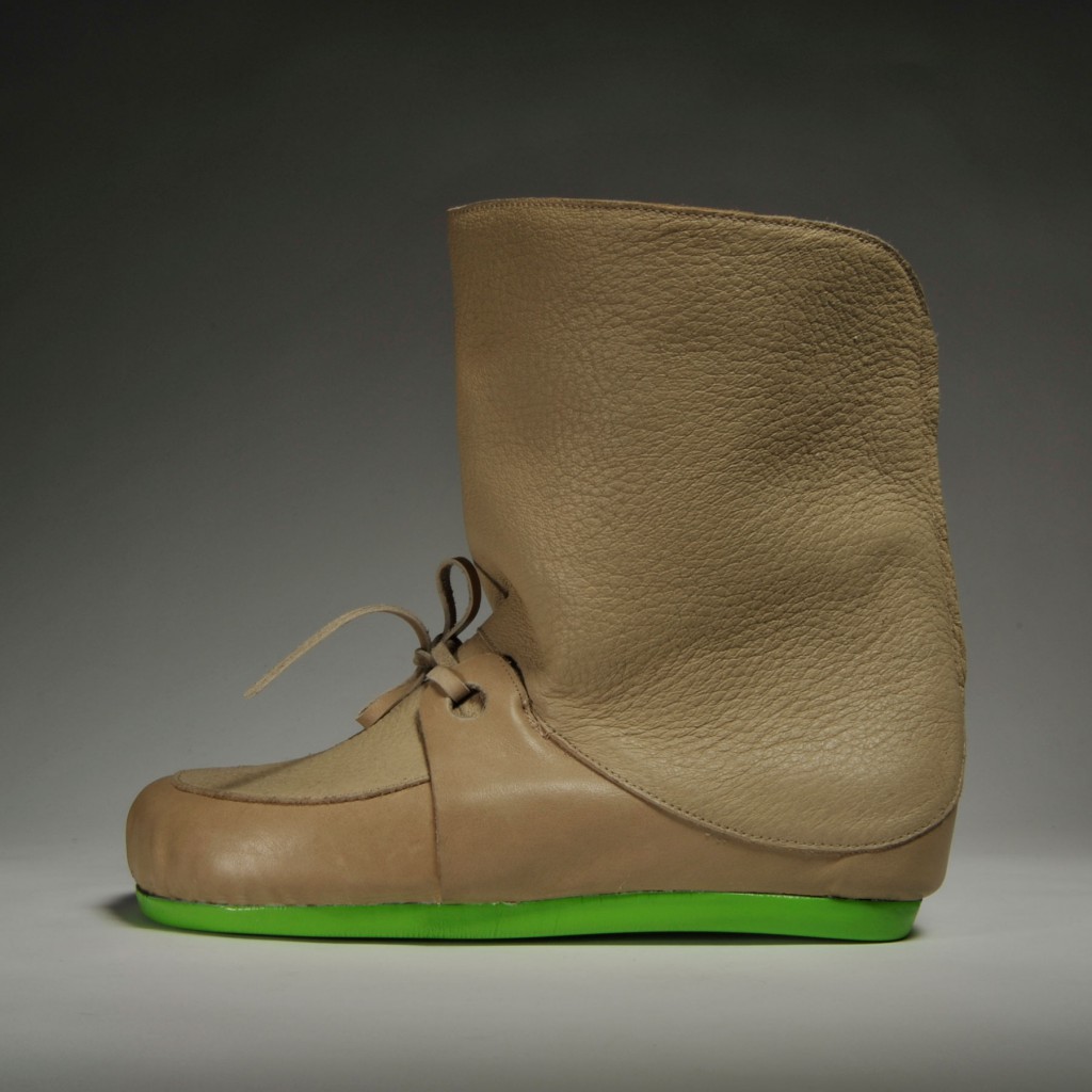 Bei dem Modell BottomUp wächst die Zunge über ihre natürliche Form hinaus, sie umschließt das Bein und bildet den Schaft. Der Halbschuh wird zum Stiefel.