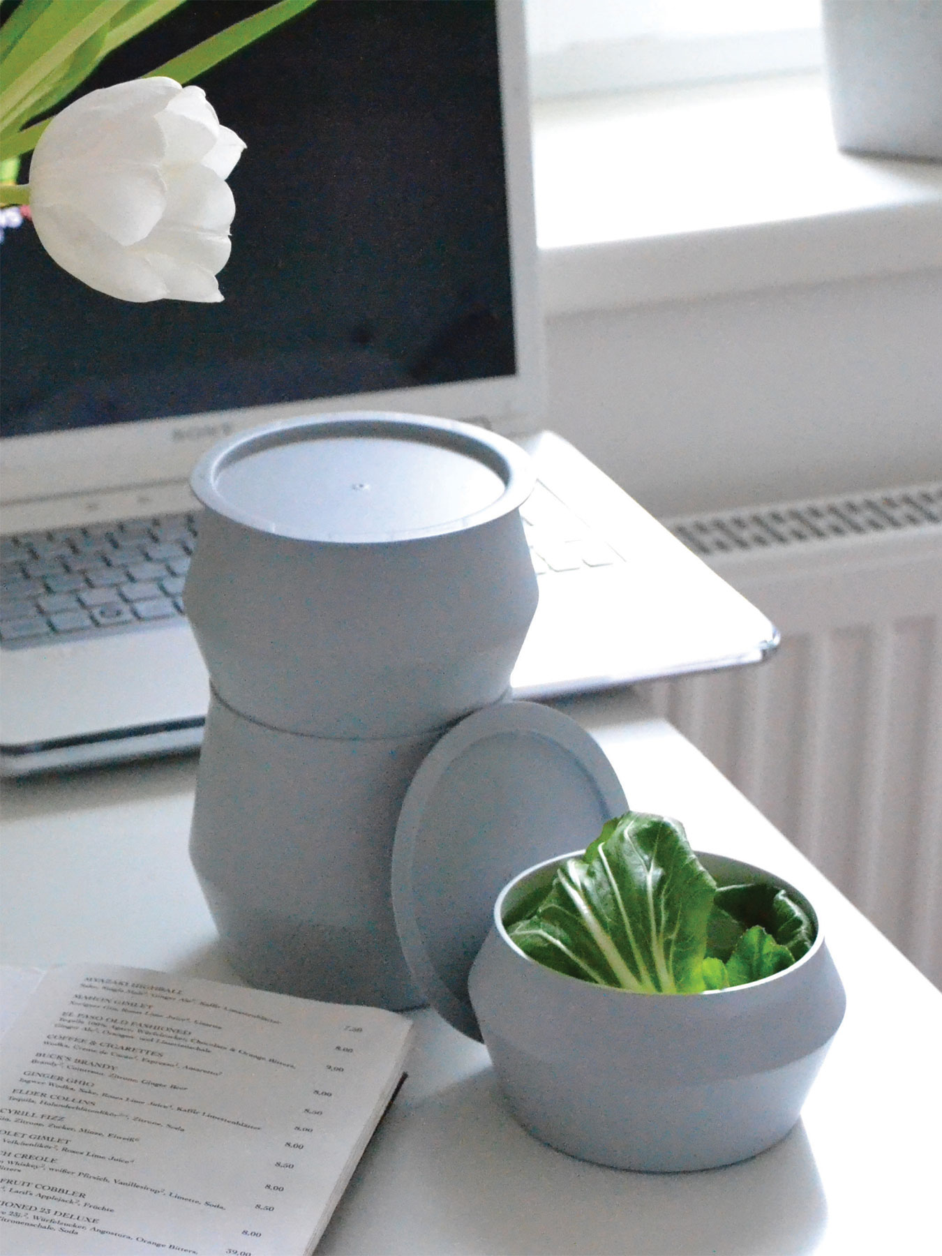 bin ermöglicht das mobile und dennoch kultivierte Essen unterwegs. Durch seine Ästhetik kann es zu Hause als sichtbares Aufbewahrungsbehältnis offen im Raum platziert werden.