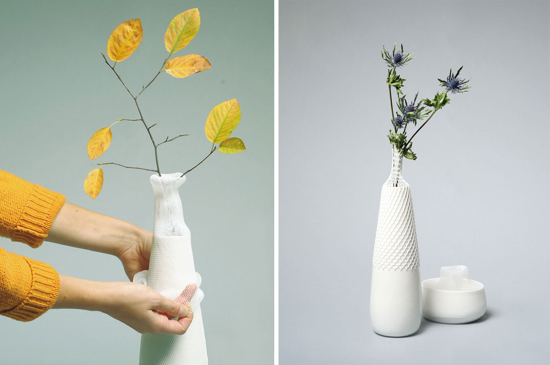 Ergebnis der Auseinandersetzung ist das Vasen-Duo Légumes. Gefangen, bewahrt, geschützt, verbunden. Unser edeles Porzellan verbindet sich mit dem sonst unscheinbaren Verpackungsnetz aus dem Supermarkt ohne seinen Wert einzubüßen. Im Gegenteil, neben der visuellen Erfahrung beginnt ein poetisches Spiel zwischen den Gegensätzen. Zweig und Vase verbinden sich. Das Netz legt sich wie eine schützende Haut um die sich gegenseitig vervollständigenden Elemente. Es entsteht eine Spannung zwischen innen und außen, eine Verbindung zwischen Raum und Vase, Vase und Blume. Die Form der Vasen wird durch die Spannung des Netzes visuell erfahrbar, Kanten werden weicher, und die Form bekommt eine weitere Dimension.