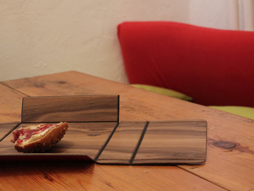 Die Einteilige Lunchbox kann individuell aus unterschiedlichen Materialsandwichen bestehen, das Material wird durch V-förmige Einfräsungen zum Scharnier und ermöglicht so den Klappeffekt.