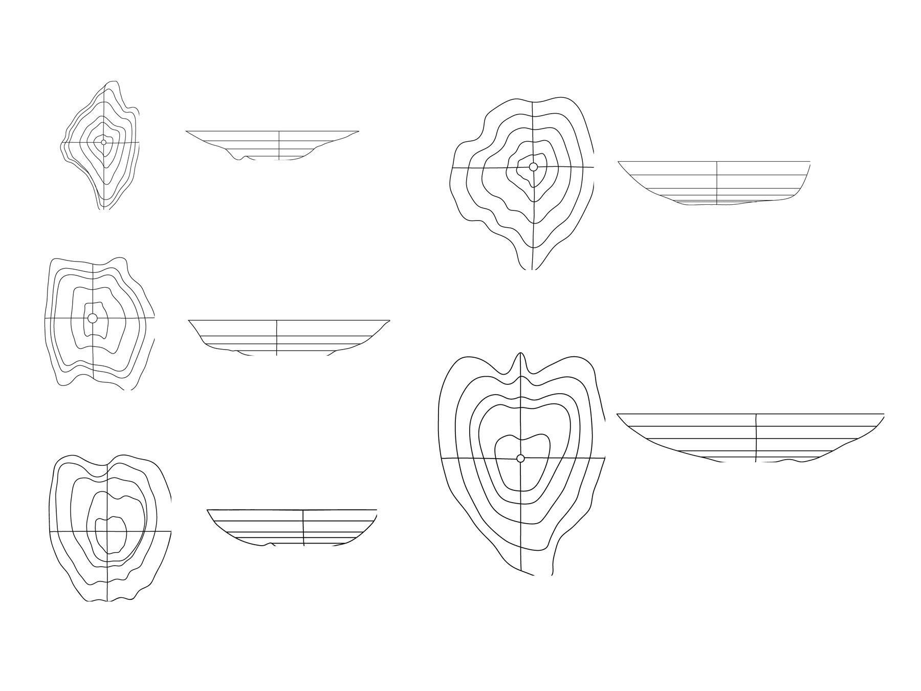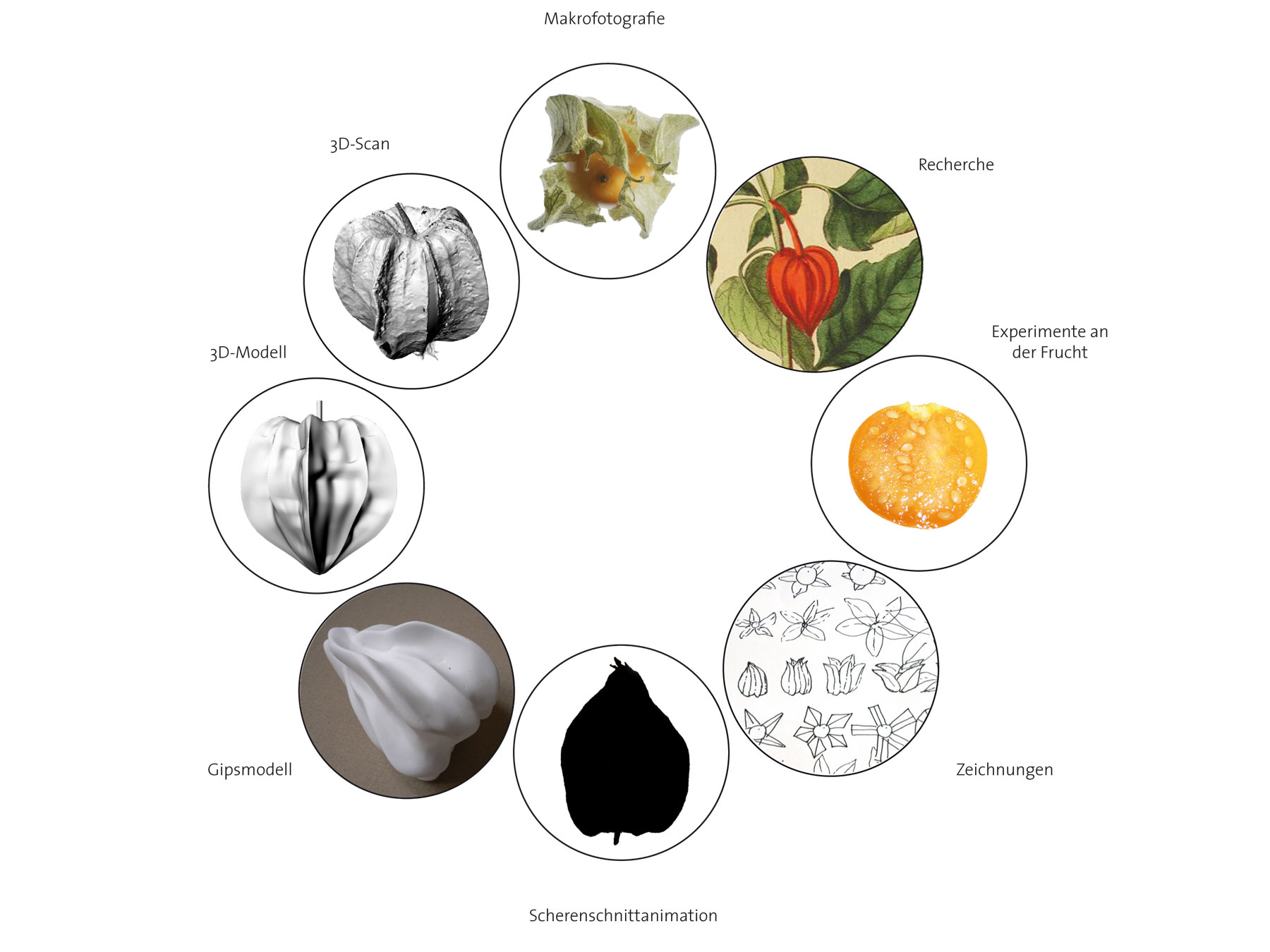 Beim Untersuchen der Makroaufnahmen einer Physalis bemerkte ich die interessanten Umrisse und fokussierte im weiteren Verlauf der Studie mein Augenmerk auf dieses Detail. Schrittweise gelang ich zu einem Schalenaufbau, bei dem ein Längsschnitt die Aufsicht auf die Schale darstellt und sich noch mehrere Mal in der Form wiederholt.