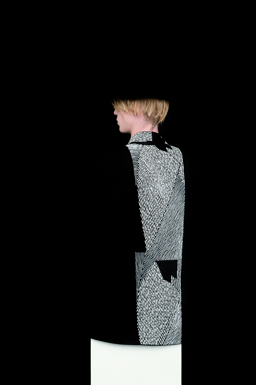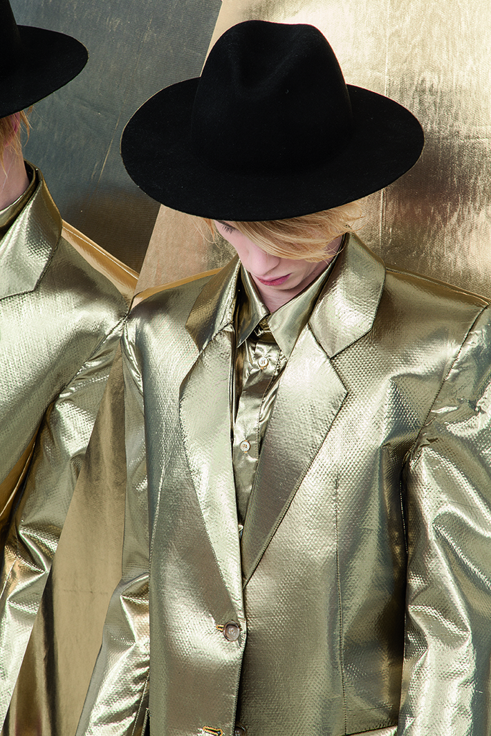 In den letzten Outfits drängt der nackte Körper osmotisch durch die Schale und hinterfragt die Stärke und Beständigkeit des Anzuges und seines Trägers.