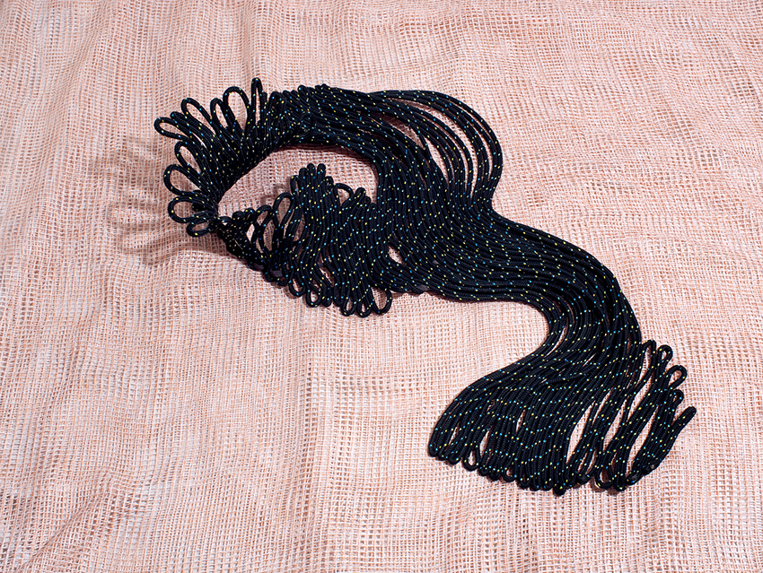Printed One and Printed Two are the results of an exploration into the possibilities of appropriating the principles of this type of 3D printing in fashion manufacturing. The outer surfaces of the dresses are produced in a hand making process whereby a continuous strand of rope is draped across the body form. By selecting and sometimes changing the direction of the rope certain parts of the body are high-lighted and emphasis curves, muscles and or bone structures.