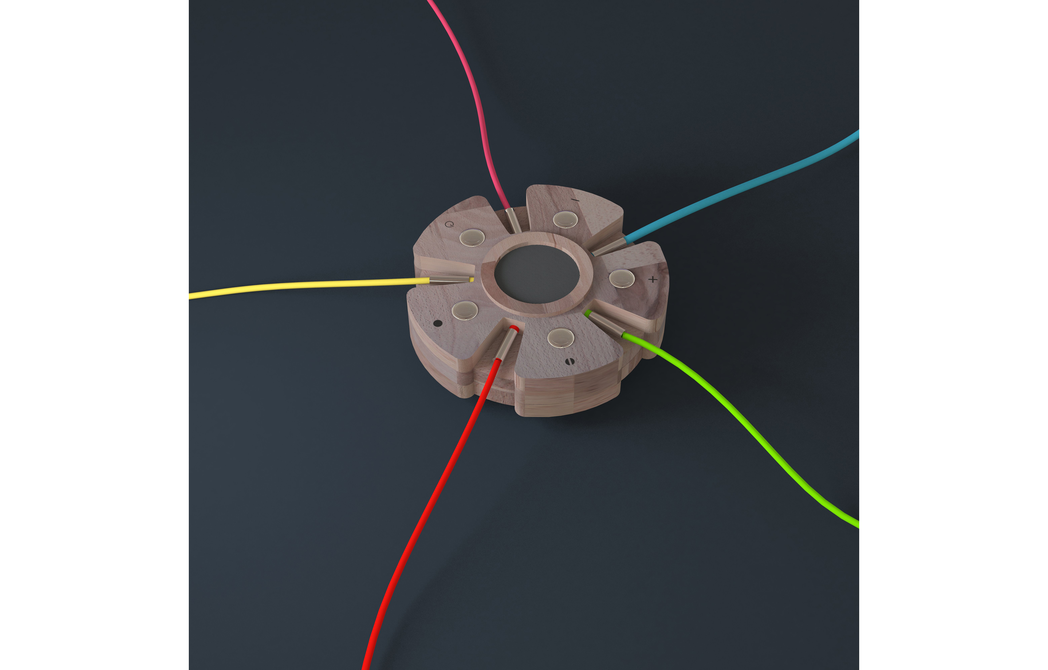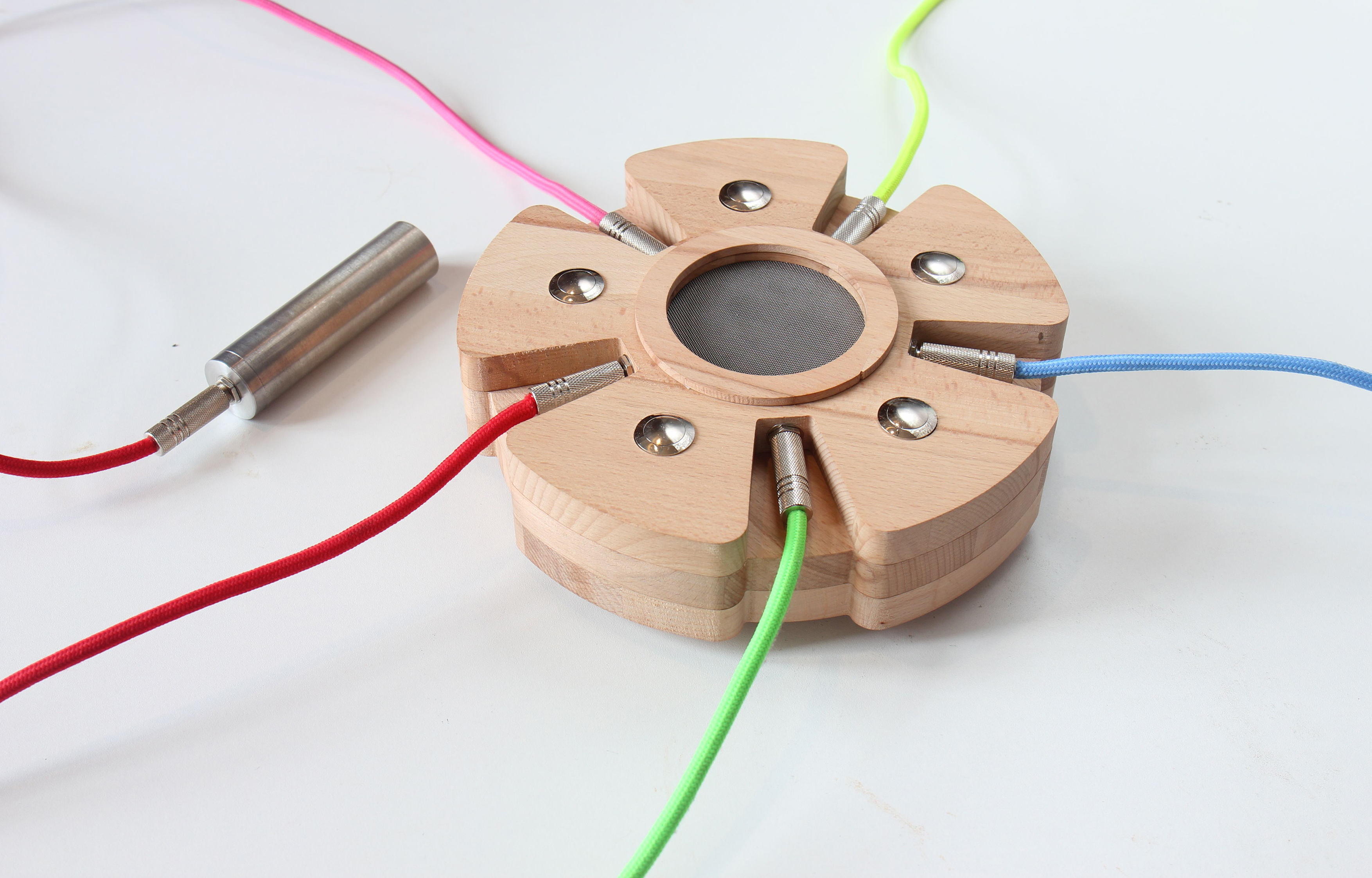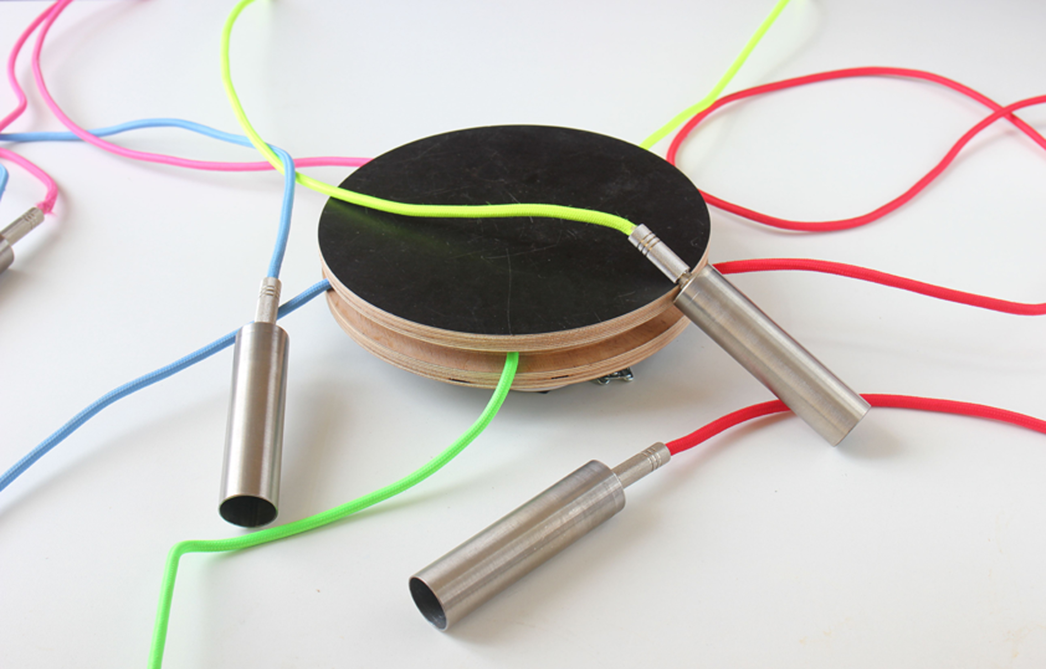 Bei meinem Gerät hält jeder der fünf Mitspieler einen elektrisch leitenden Griff und ist so durch ein Kabel mit der Konsole in der Mitte verbunden. Berühren sich zwei Spieler, wird ein messbarer Stromkreis geschlossen. So erkennt das Gerät jeden Hautkontakt und kann durch Regeln und ein akustisches Feedback verschiedenste Körperkontaktspiele auf der Basis von Rhythmus und Musik umsetzen.