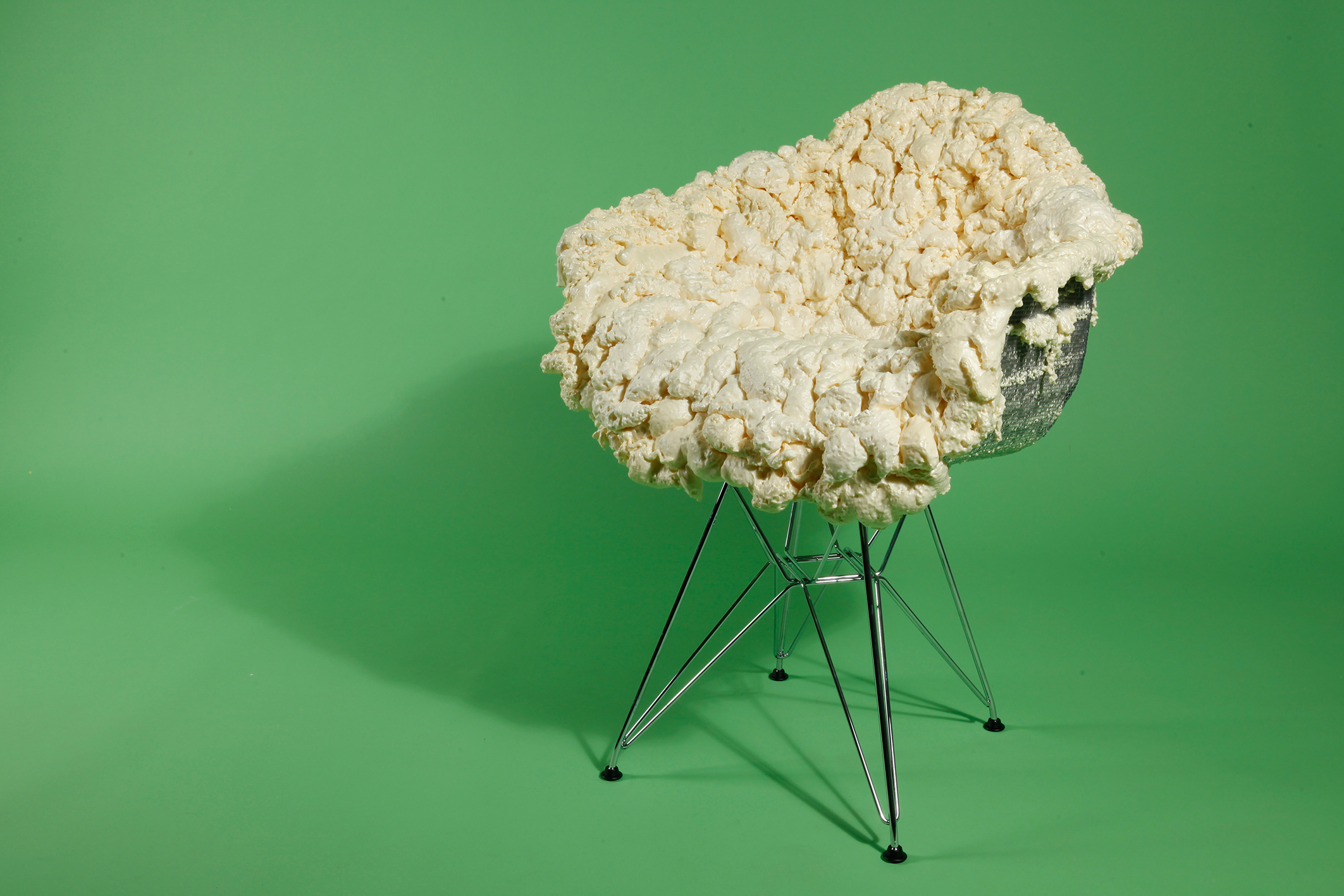 Polyurethan Bauschaum ist ein günstiger, sprühfertiger Baustoff, der in fast jeder Wohnung zu finden ist, meist aber unsichtbar als gefälliger Diener zum Türzargen halten oder Fugen verdichten. Chemisch unterscheidet er sich wenig von den weiter verbreiteten Polyurethanen in Sitzpolstern und Matratzen, ästhetisch liegen Welten dazwischen. Nur durch eine grobe Stützform definiert, kann sich der Schaum unkontrolliert und frei ausbreiten. Die entstehenden Strukturen sind hoch komplex, industriell nicht reproduzierbar und weisen eine gewisse Sitzqualität auf.