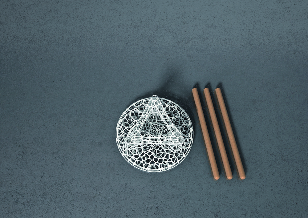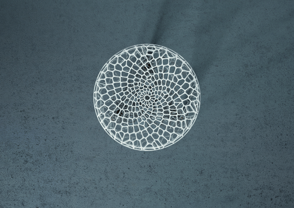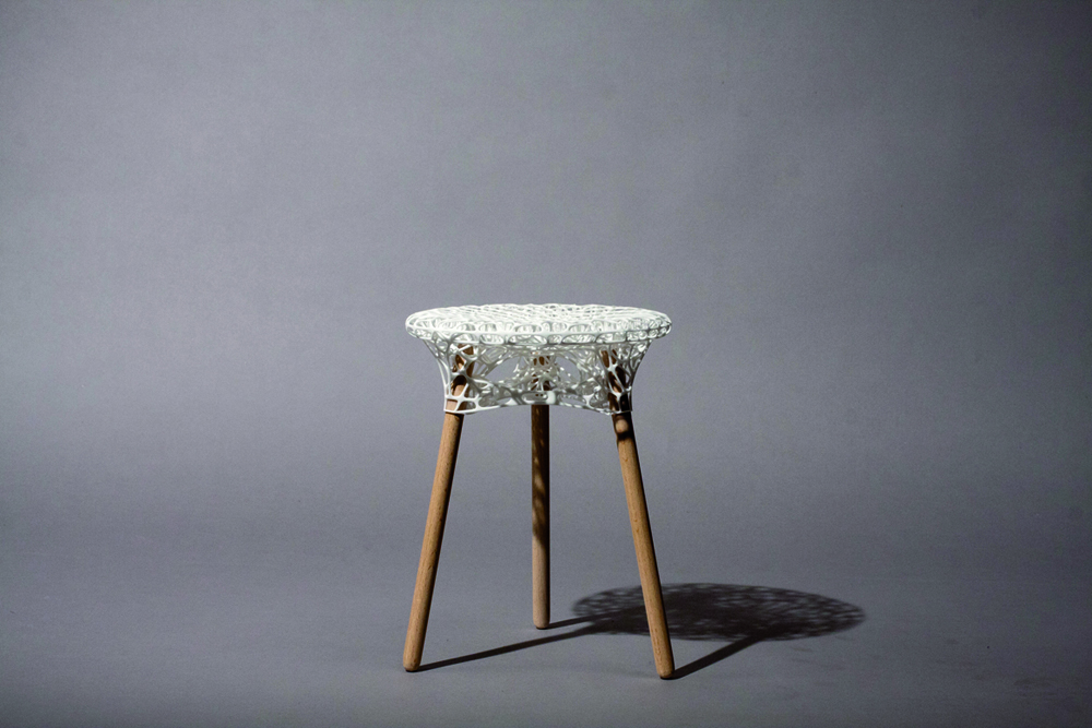 Aufbauend auf dem Voronoi-Algorithmus ist die Sitzfläche des Hockers dem Kräfteverlauf der aufkommenden Lasten entsprechend gestaltet. Die scheinbar unregelmäßigen Zellstrukturen verdichten sich optimal an höher belasteten Regionen und verlaufen frei von großen Zellstrukturen mit geringer Belastung bis hin zur regelmäßigen Gestaltung der oberen Sitzfläche. Dadurch entsteht ein besonders materialeffizienter und mit lediglich 800gr Gewicht, sehr leichter und dennoch eleganter Dreibein-Hocker im selektiven Lasersinter Verfahren.