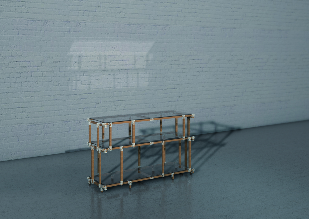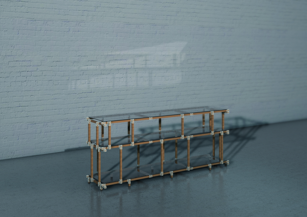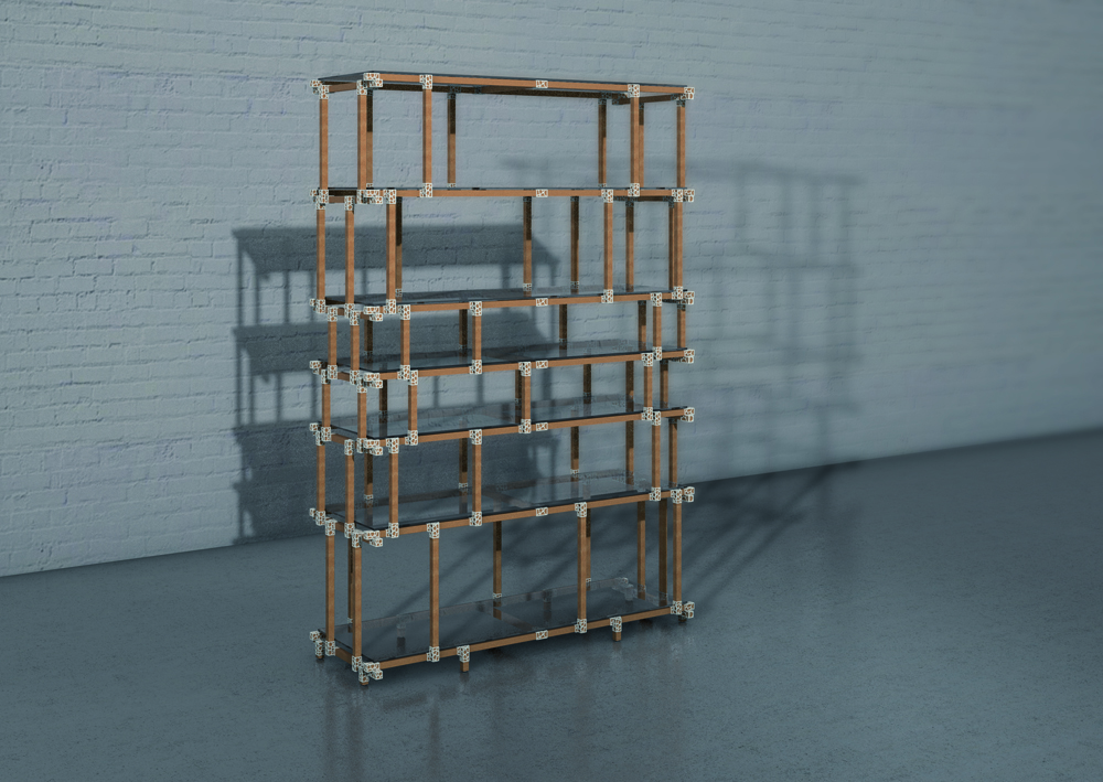 Das Regal ist gewollt schlicht und filigran gehalten. Es wird einfach gesteckt und kommt ohne zusätzliche Versteifung und Verschraubungen aus. Die hierfür entworfenen Verbinder folgen der gleiche Idee des Voronoi Algorithmus wie beim Hocker.