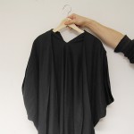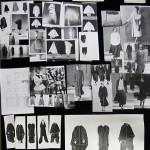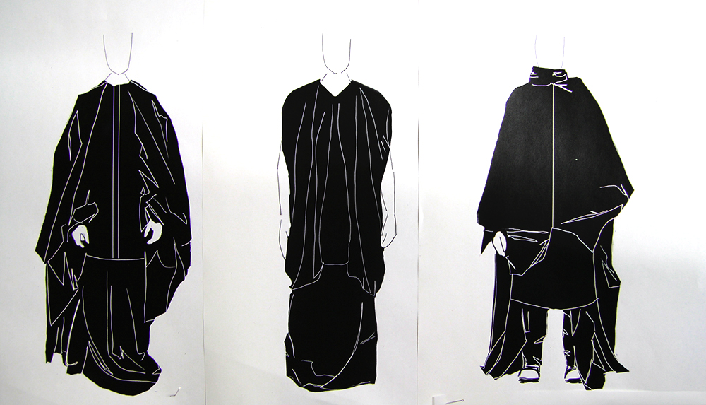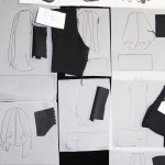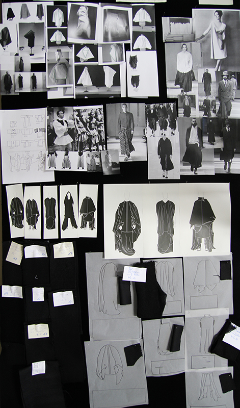 Mein Grundansatz über den ich während meiner Recherche gestolpert bin sind fünf Teile aus einer Kollektion von Issey Miyake. Er hat mit 2D-Kleidungsstücken gearbeitet die auf dem Boden auslegbar sind, drei Einschnitte haben und achtundzwanzig Druckknöpfe. Durch die Einschnitte und die Druckknöpfe wird der Stoff zum Kleid. Weil ich es so faszinierend finde, habe ich mich daran orientiert. Am Anfang war sogar das Ziel, eine Kollektion zu machen, die genauso flach am Bode liegen kann. Aber dann habe ich festgestellt, dass ich meinen eigenen Weg gehen muss. Also habe ich mich gegen die „Issey Miyake-Variante“ entschieden. Ich arbeite jetzt mit Rechtecken, die so wenig wie möglich, aber so viel wie nötig Einschnitte bekommen und danach an der Puppe drapiert werden.