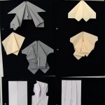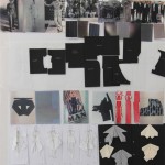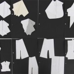 Von mir aus gibt es immer diesen rebel-Gedanken. Ich mag ungern Sachen die es schon gibt. Deswegen habe ich mir so gedacht, wenn ich jetzt unbedingt was Neues machen muss, dann mache ich etwas, was ‚Nicht-Bekleidung’ ist, also ‚not clothes’. Und dann habe ich mich gefragt, was sind dann ‚clothes’ und wie werden die gemacht? Und egal, ob man Schnitt konstruiert oder drapiert an der Puppe, am Ende hast du, wenn du den Schnitt ausgeschnitten hast die ‚Outlines’ und es bleibt etwas übrig. Die negativen Schnittformen werden dann weggeschmissen. Ich habe mir dann gedacht, okay they are not pattern, so they are turning into ‚not-clothes’. Das heißt, ich arbeite nur mit den festen Formen. Ich fange mit Papier an. Außen gibt es die rechten Winkel und innen die Outline. Durch drapieren und falten entstehen dann ‚not clothes’.