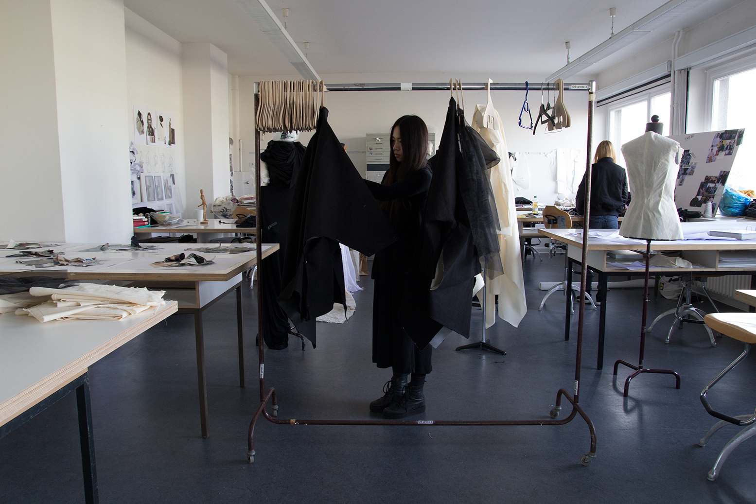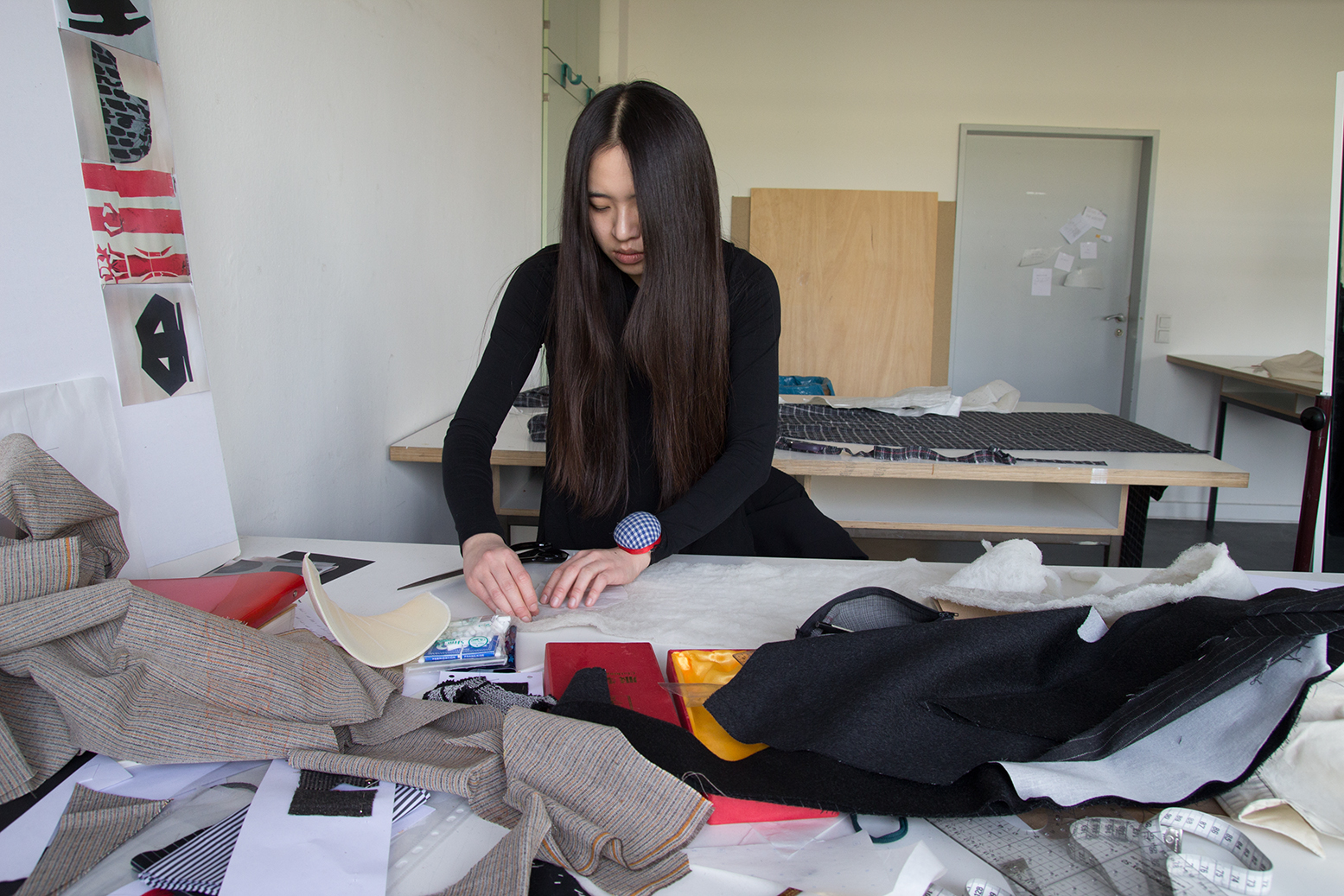 Einerseits geht es darum, diesen rebel-Wunsch zu realisieren, andererseits wollte ich immer etwas mit Schnittentwicklung machen. Deswegen versuche ich jetzt eine Art zweidimensionales draping zu entwickeln, etwas, dass bisher noch nicht wirklich gemacht wurde, eine Zwischenform von Schnittkonstruktion und Drapieren. Bei der Schnittkonstruktion werden die Maße gebraucht und beim draping reicht die Puppe aus. Ich versuche jetzt die Maße zu berücksichtigen, ohne die Linien zu rechnen. Auf einer zweidimensionalen Ebene, wie auf Papier, drapiert ich diese dann.