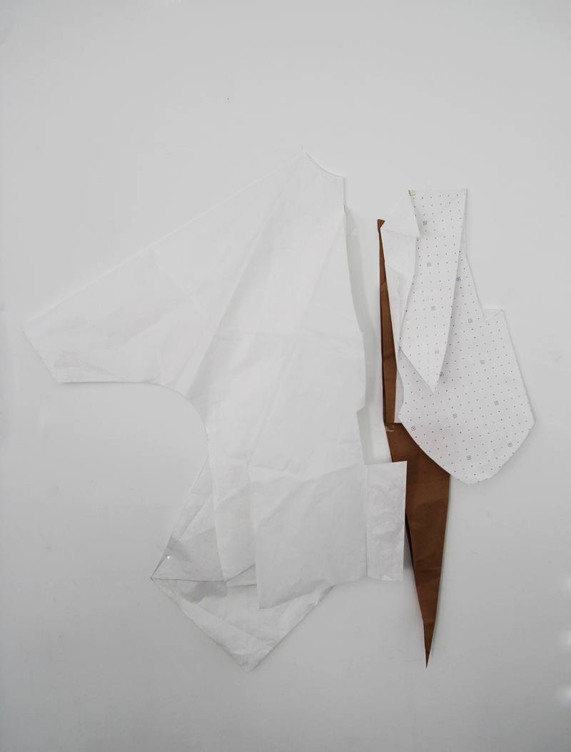 Von mir aus gibt es immer diesen rebel-Gedanken. Ich mag ungern Sachen die es schon gibt. Deswegen habe ich mir so gedacht, wenn ich jetzt unbedingt was Neues machen muss, dann mache ich etwas, was ‚Nicht-Bekleidung’ ist, also ‚not clothes’. Und dann habe ich mich gefragt, was sind dann ‚clothes’ und wie werden die gemacht? Und egal, ob man Schnitt konstruiert oder drapiert an der Puppe, am Ende hast du, wenn du den Schnitt ausgeschnitten hast die ‚Outlines’ und es bleibt etwas übrig. Die negativen Schnittformen werden dann weggeschmissen. Ich habe mir dann gedacht, okay they are not pattern, so they are turning into ‚not-clothes’. Das heißt, ich arbeite nur mit den festen Formen. Ich fange mit Papier an. Außen gibt es die rechten Winkel und innen die Outline. Durch drapieren und falten entstehen dann ‚not clothes’.