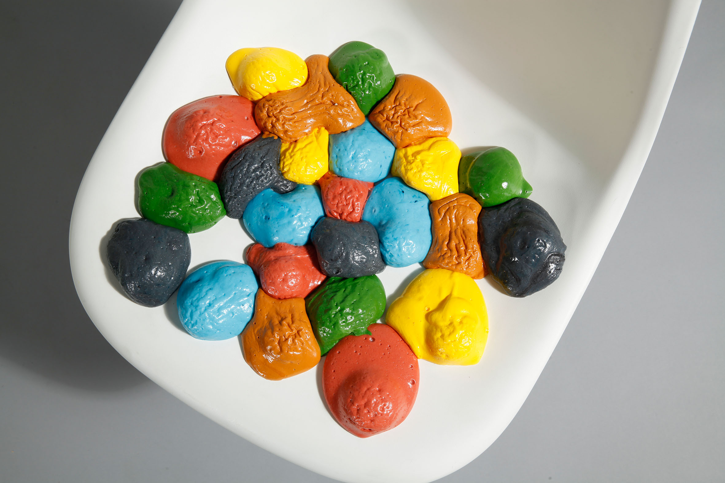 Polyurethan-Integralschaum ist allgegenwärtig. Als U-Bahn-Sitz, Kantenpolster oder Armlehne. Immer ist Form und Oberfläche klar definiert und der Schaum darf sie lediglich ausfüllen. Ohne solche Einschränkungen entstehen bei der etwa zehn-minütigen Reaktion der zwei Polyurethankomponenten Strukturen mit eigenem Charakter. Aus einer unüberschaubaren Kombination aus Temperatur, Oberflächenspannung, Schwerkraft, etc. entsteht eine einzigartige Geometrie. Dieser Anti-industrielle Prozess befällt das streng konstruierte Massenprodukt DSR wie ein Schimmelpilz. Dieser Zersetzungsprozess steht wie in der Natur als Ausgangspunkt für etwas unbekanntes Neues.