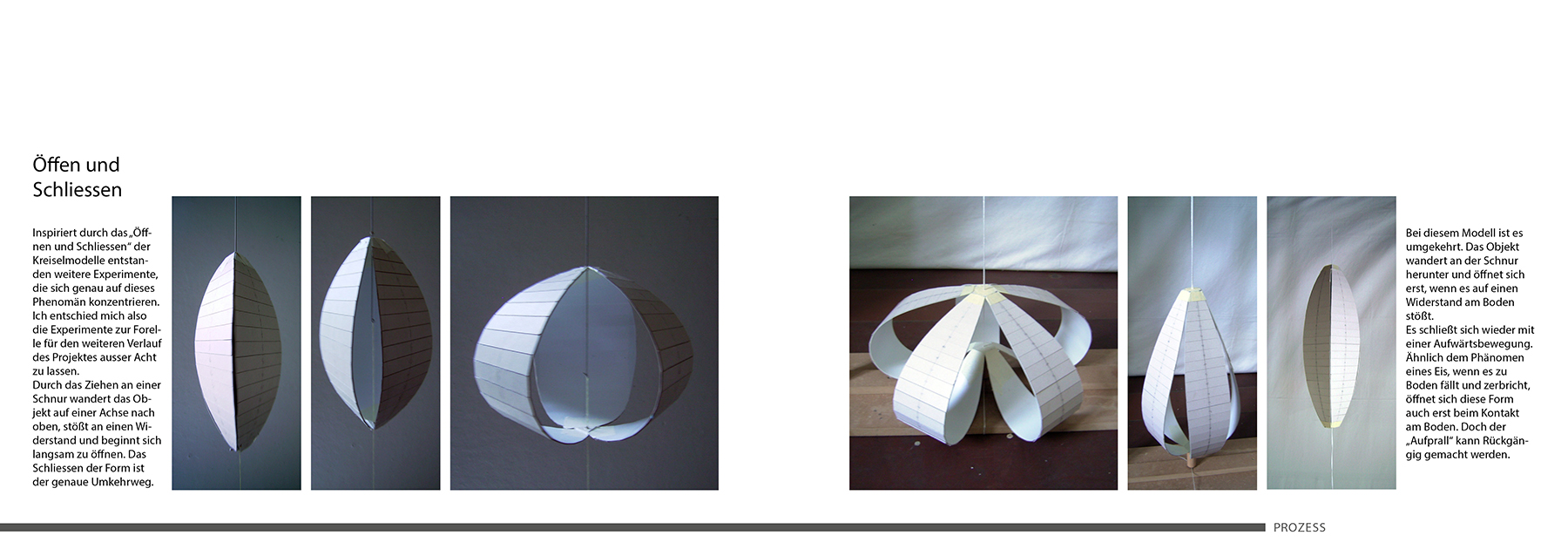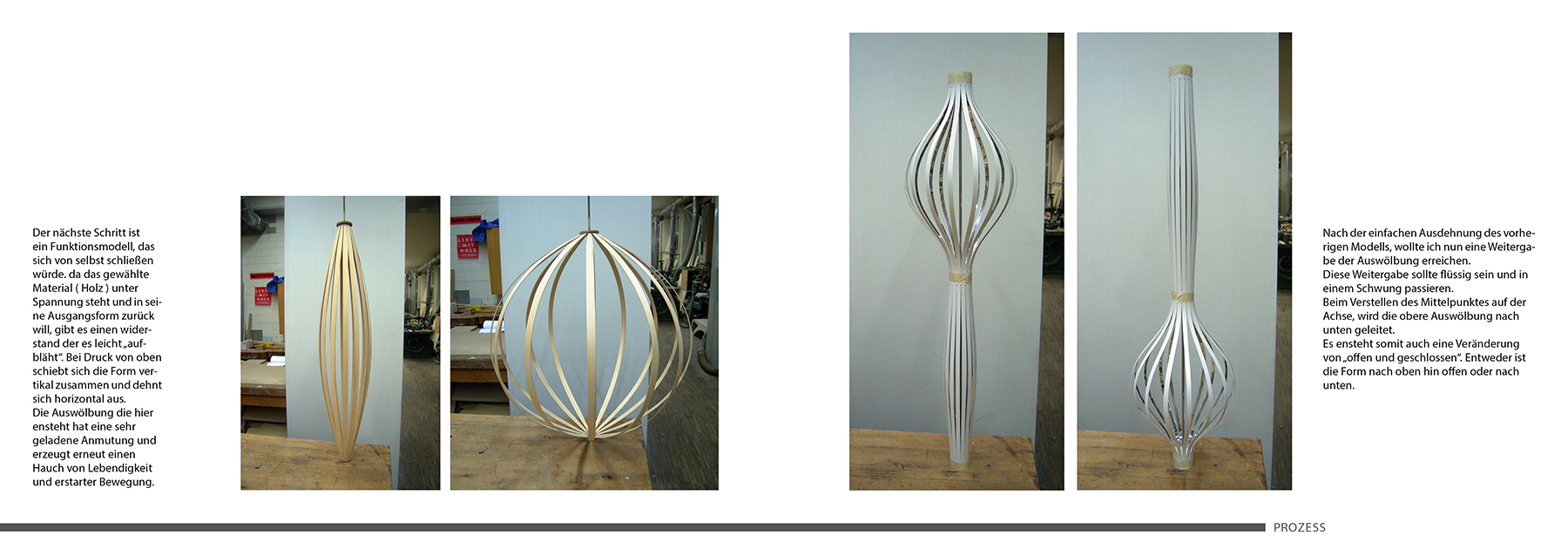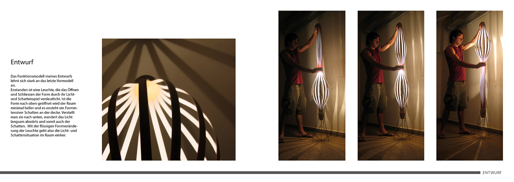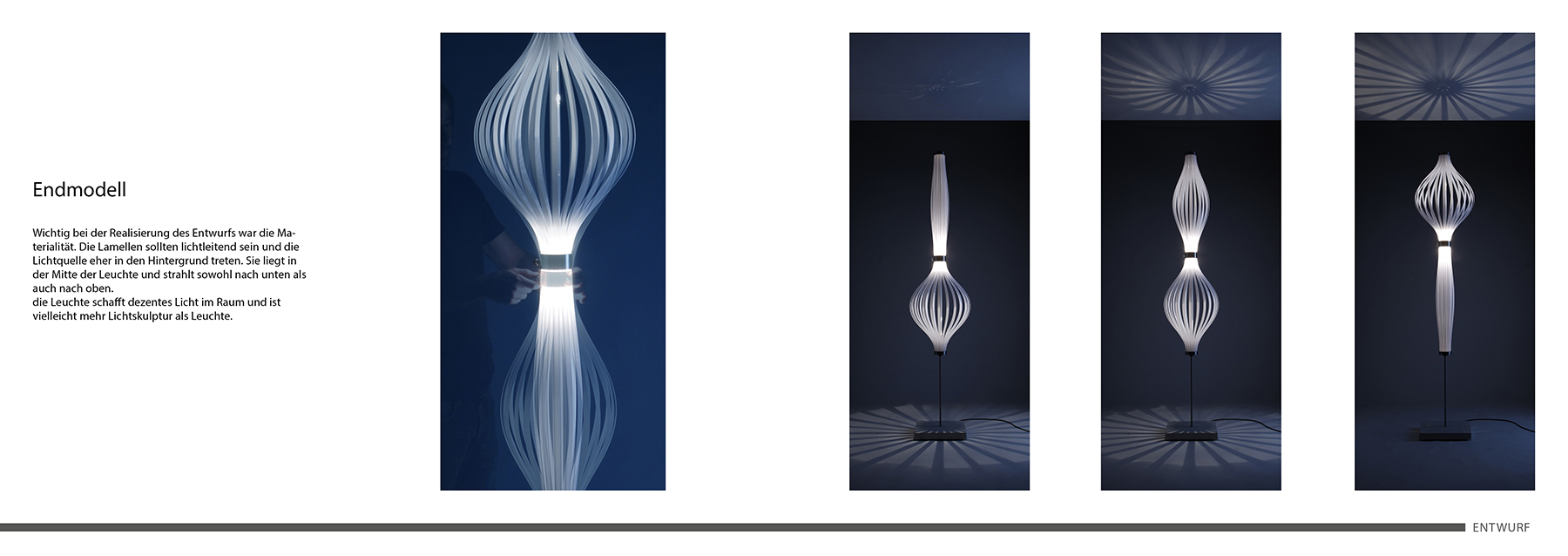 Ausgehend von der Bewegung eines Kreisels entstand eine Leuchte, welche die Fliehkraft der Rotation visualisiert. Je schneller sich der Kreisel dreht, desto extremer ist seine Ausdehnung. Dieses Prinzip wurde auf die Leuchte übertragen. Hierbei entsteht die Möglichkeit der Interaktion mit der Leuchte. Ihre Form und Lichtwirkung können durch eine Manipulation der Form verändert werden. Es entsteht ein Schattenspiel, welches sich durch das Öffnen und Schliessen der Form verändert.