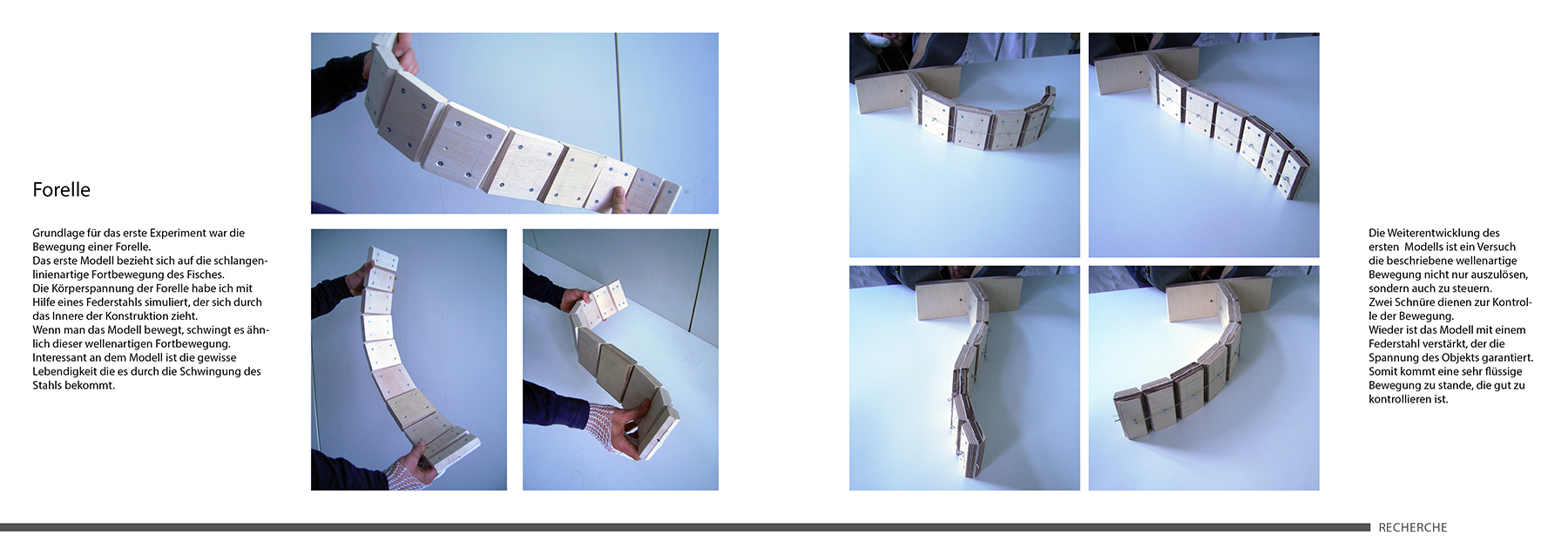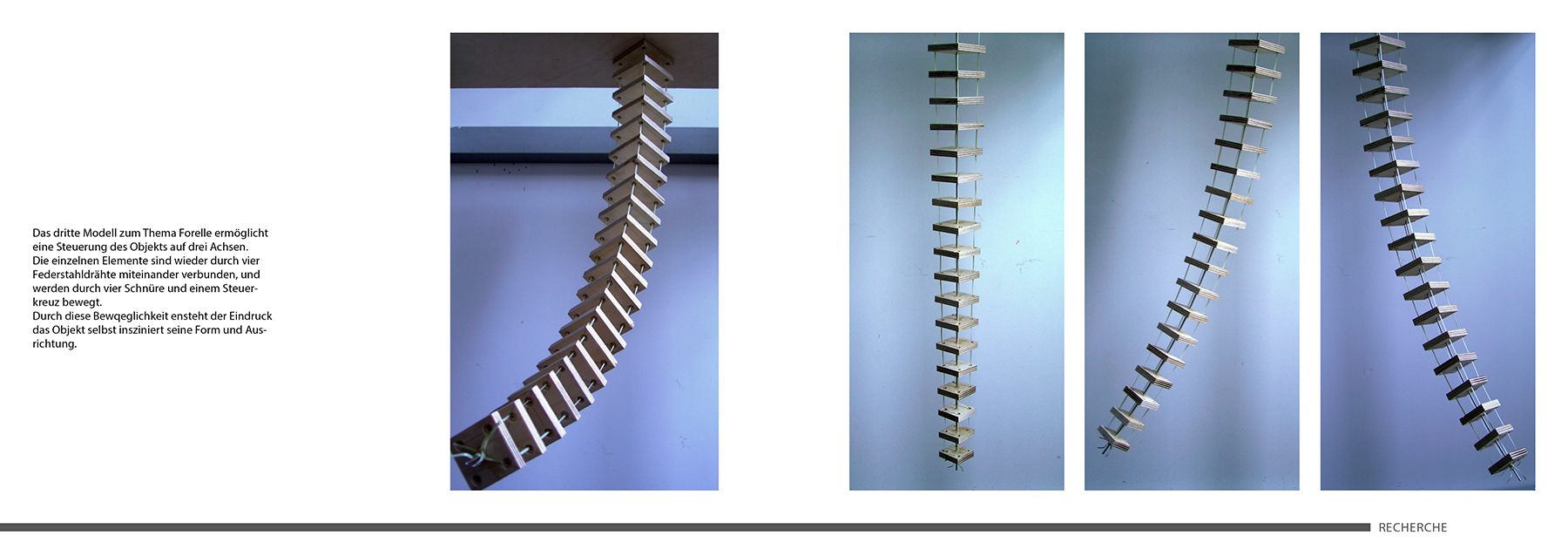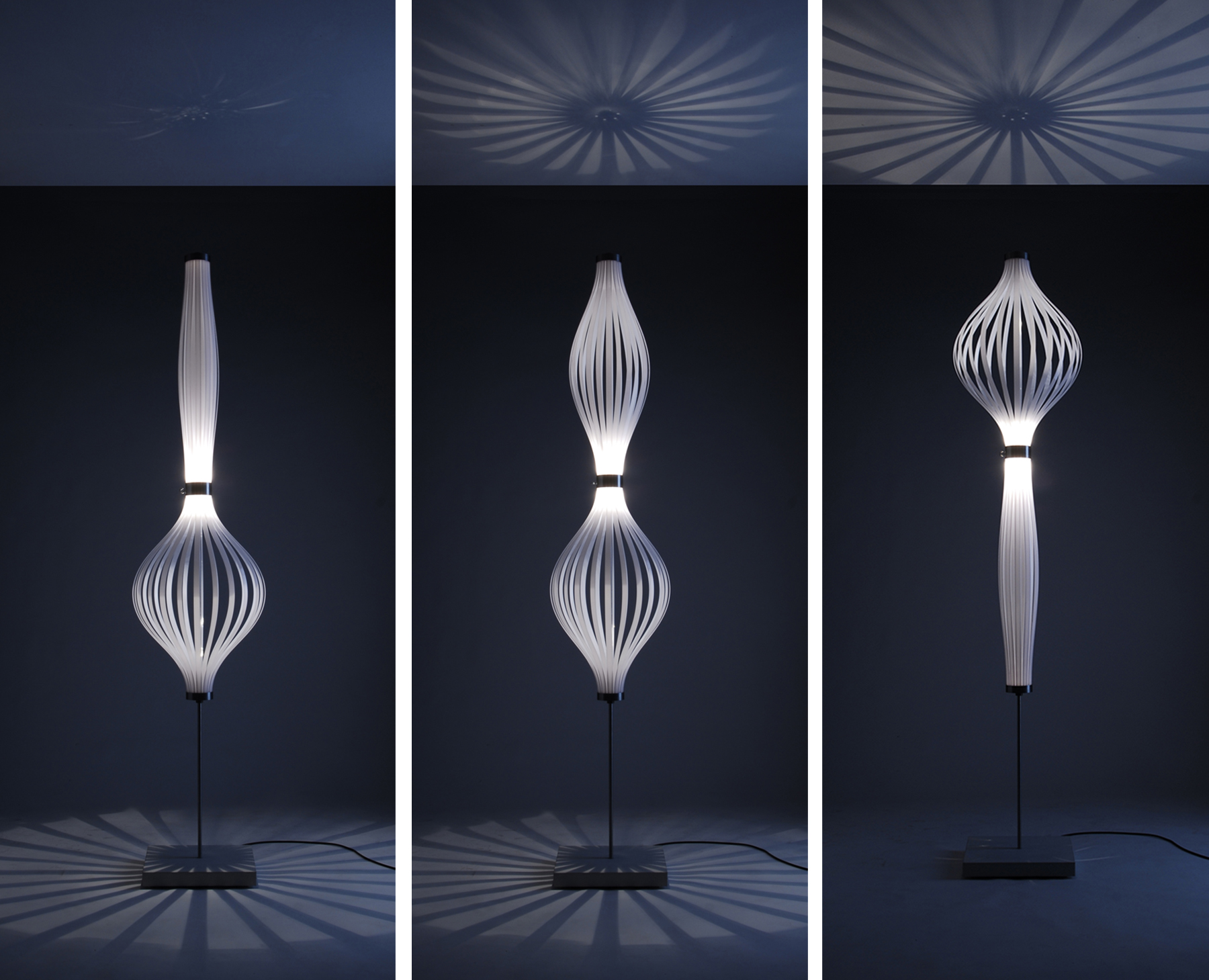 Ausgehend von der Bewegung eines Kreisels entstand eine Leuchte, welche die Fliehkraft der Rotation visualisiert. Je schneller sich der Kreisel dreht, desto extremer ist seine Ausdehnung. Dieses Prinzip wurde auf die Leuchte übertragen. Hierbei entsteht die Möglichkeit der Interaktion mit der Leuchte. Ihre Form und Lichtwirkung können durch eine Manipulation der Form verändert werden. Es entsteht ein Schattenspiel, welches sich durch das Öffnen und Schliessen der Form verändert.
