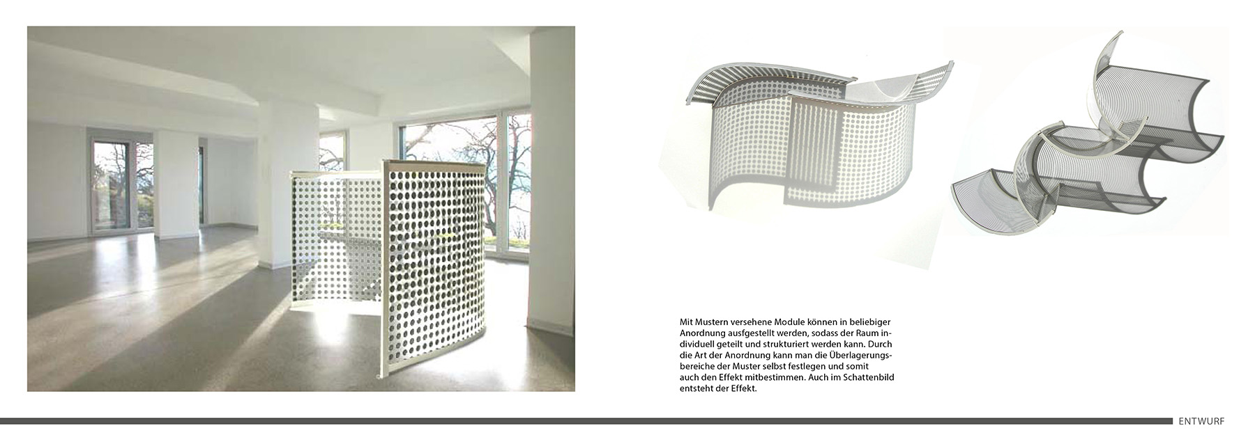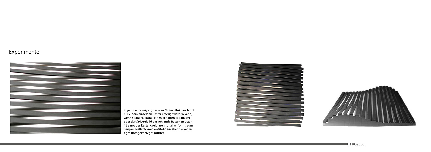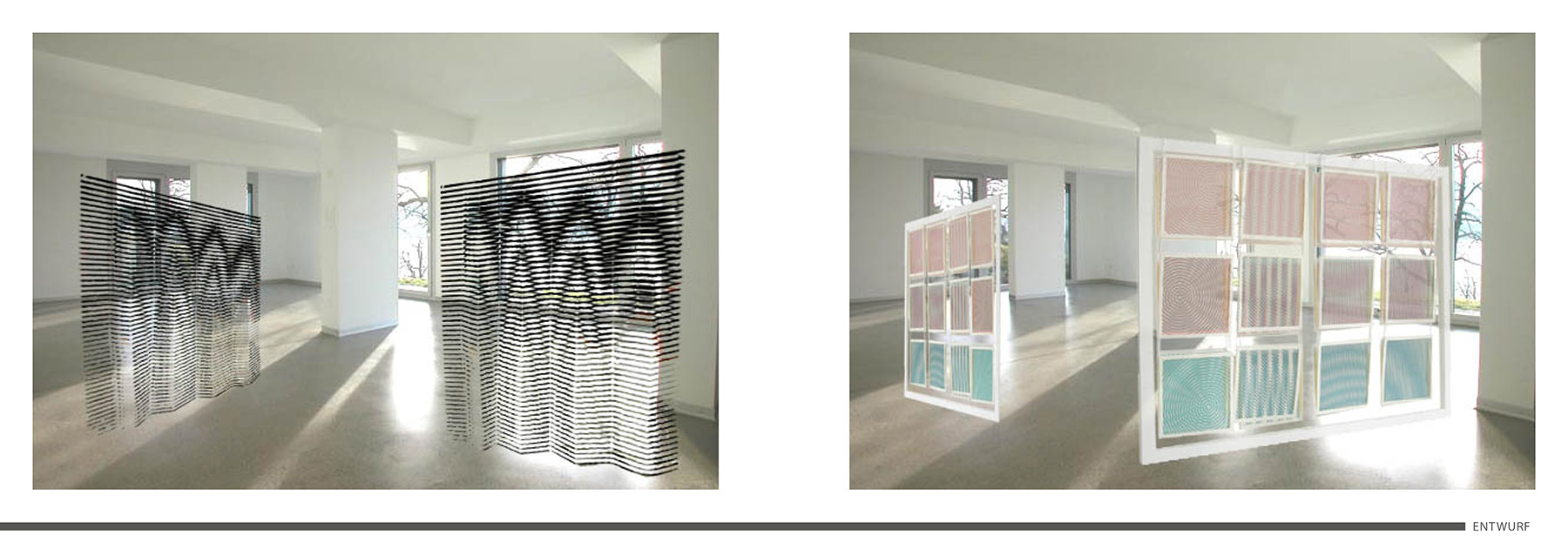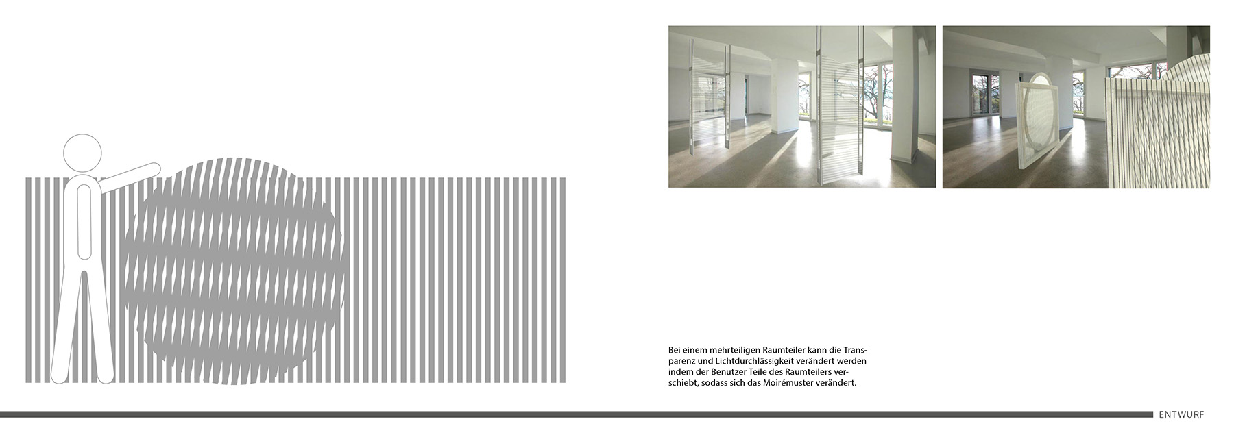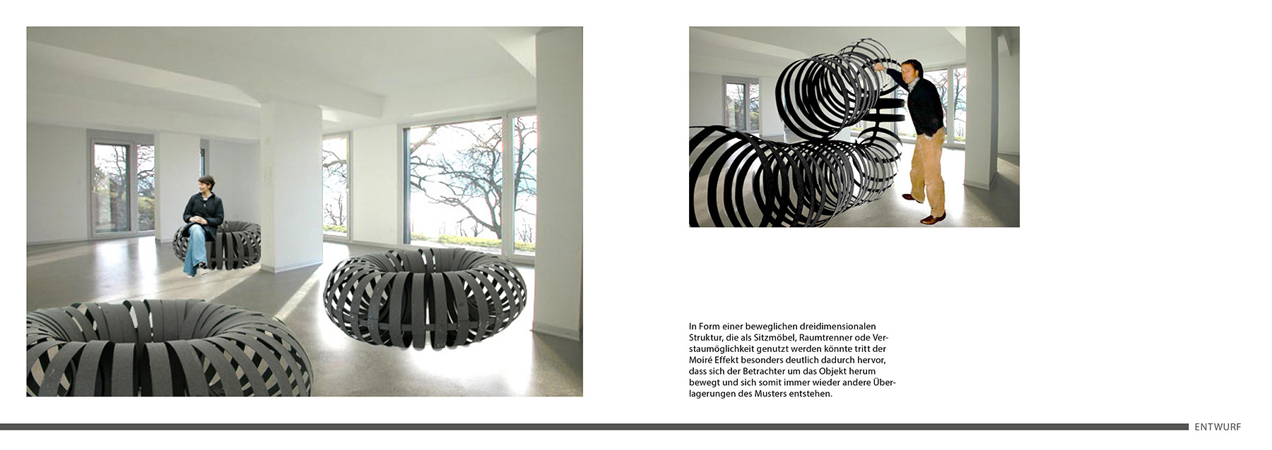 In Form einer beweglichen dreidimensionalen Struktur, die als Sitzmöbel oderRaumtrenner genutzt wird, tritt der Moiré Effekt besonders deutlich dadurch hervor, dass sich der Betrachter um das Objekt herum bewegt und sich somit immer wieder andere Überlagerungen des Musters entstehen. Bei einem mehrteiligen Raumteiler kann die Transparenz und Lichtdurchlässigkeit verändert werden indem der Benutzer Teile des Raumteilers verschiebt, sodass sich das Moirémuster verändert.
