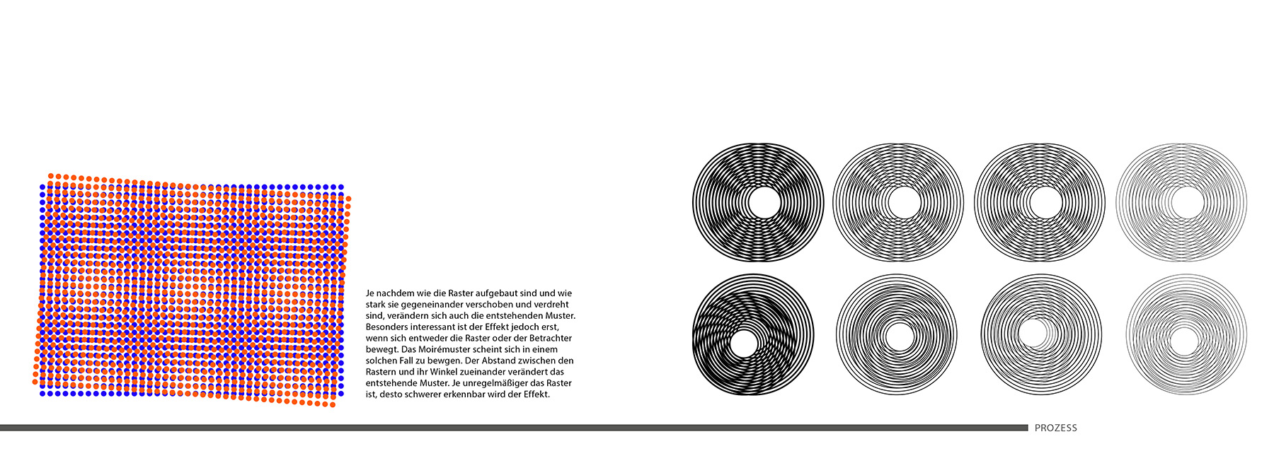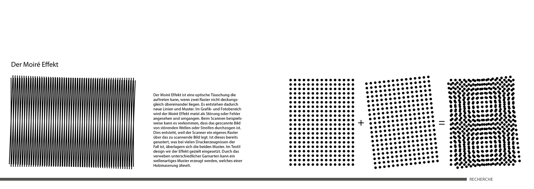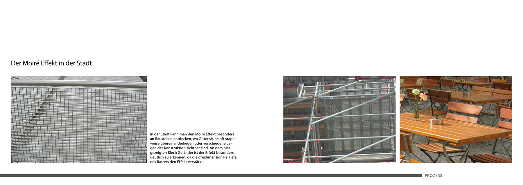 Der Moiré Effekt ist eine optische Täuschung die auftreten kann, wenn zwei Raster nicht deckungsgleich übereinander liegen. Je nachdem wie die Raster aufgebaut sind und wie stark sie gegeneinander verschoben und verdreht sind, verändern sich auch die entstehenden verschiedene Muster. Besonders interessant ist der Effekt jedoch erst, wenn sich entweder die Raster oder der Betrachter bewegt. Das Moirémuster scheint sich in einem solchen Fall zu bewegen. Der Abstand zwischen den Rastern und ihr Winkel zueinander verändert das entstehende Muster. Je unregelmäßiger das Raster ist, desto schwerer erkennbar wird der Effekt.