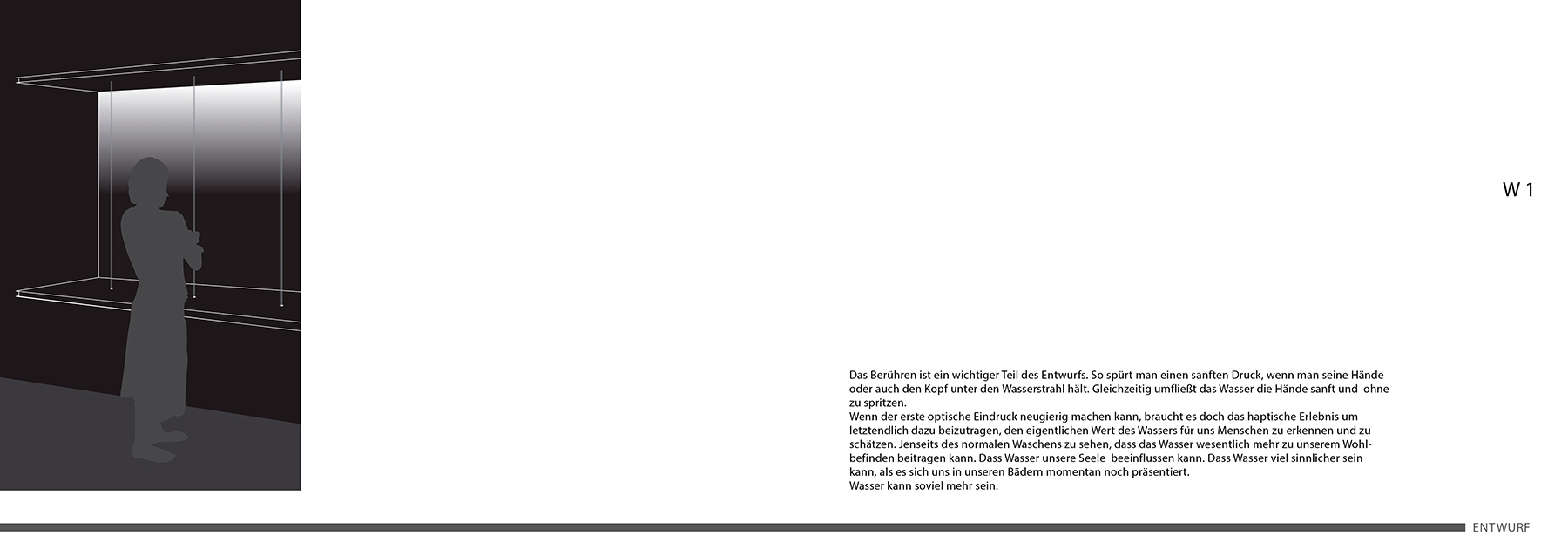 Der Wasserstrahl steht bei dieser Waschstelle deutlich im Vordergrund. Es ist befreit von herkömmlichen Installationsvorrichtungen und als architektonisches Element auf. Austritt und Ablauf werden in die Architektur integriert.