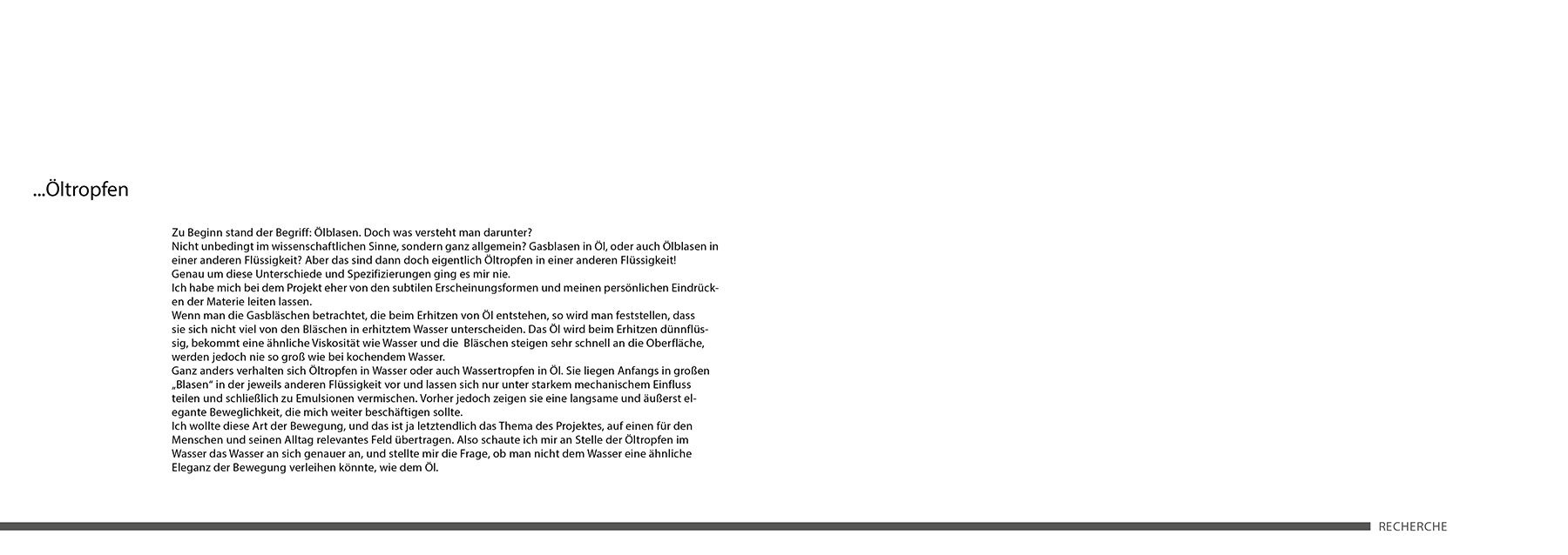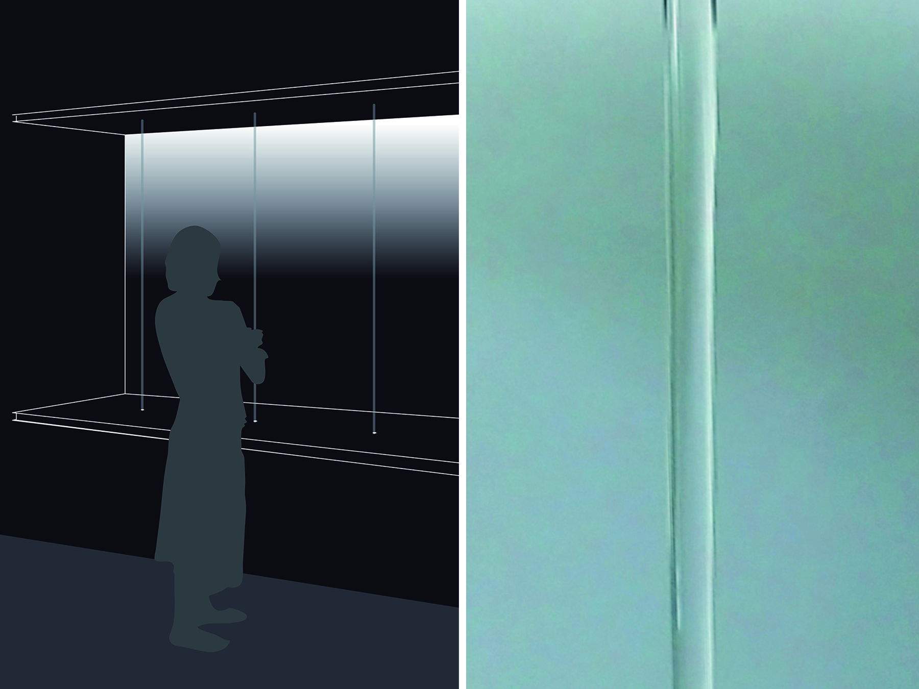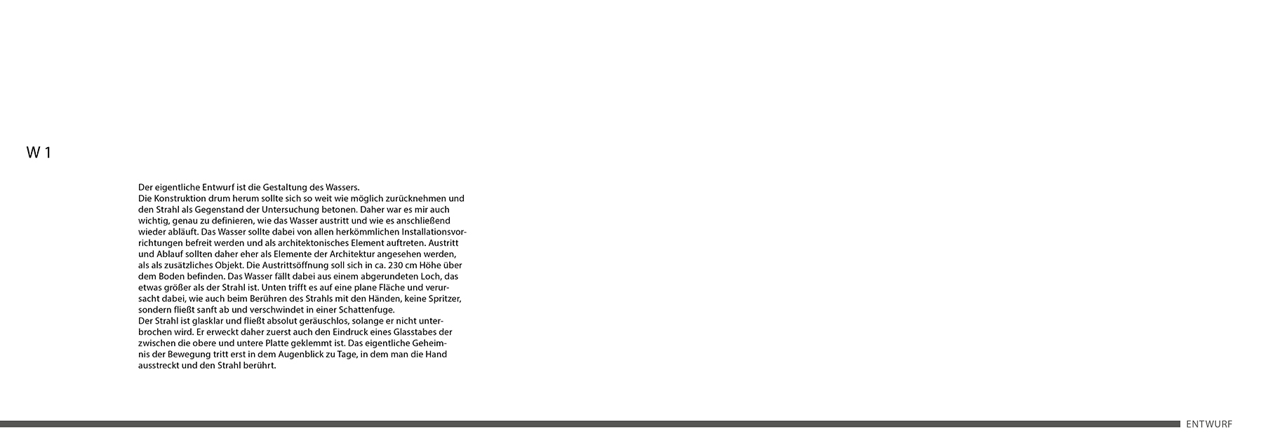 In ca. 230 cm Höhe über dem Boden tritt das Wasser aus einer runden Öffnung. Unten trifft es auf eine plane Fläche und verursacht dabei keine Spritzer, sondern fließt sanft ab und verschwindet in einer Schattenfuge. Der Strahl ist glasklar und fließt absolut geräuschlos, solange er nicht unterbrochen wird. Er erweckt den Eindruck eines Glasstabes der zwischen die obere und untere Platte geklemmt ist.