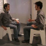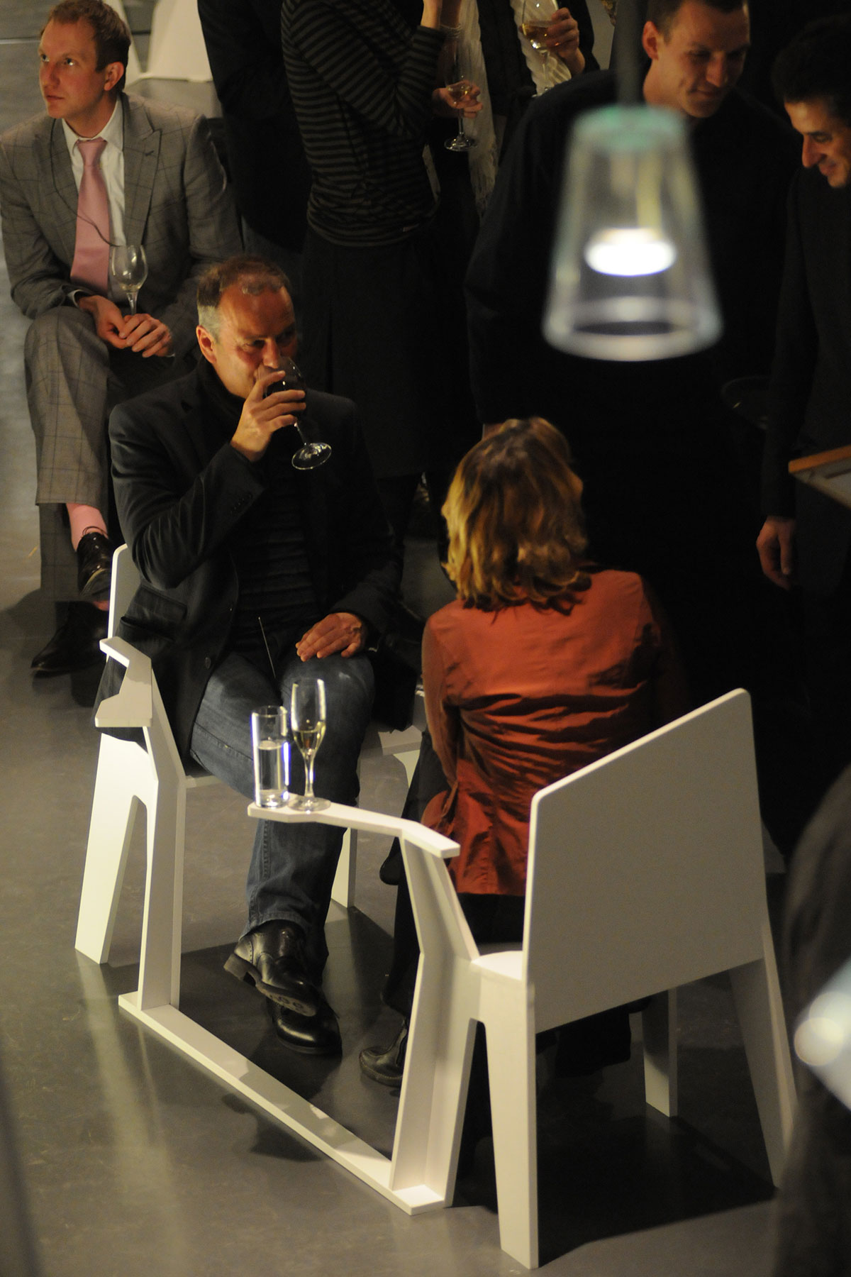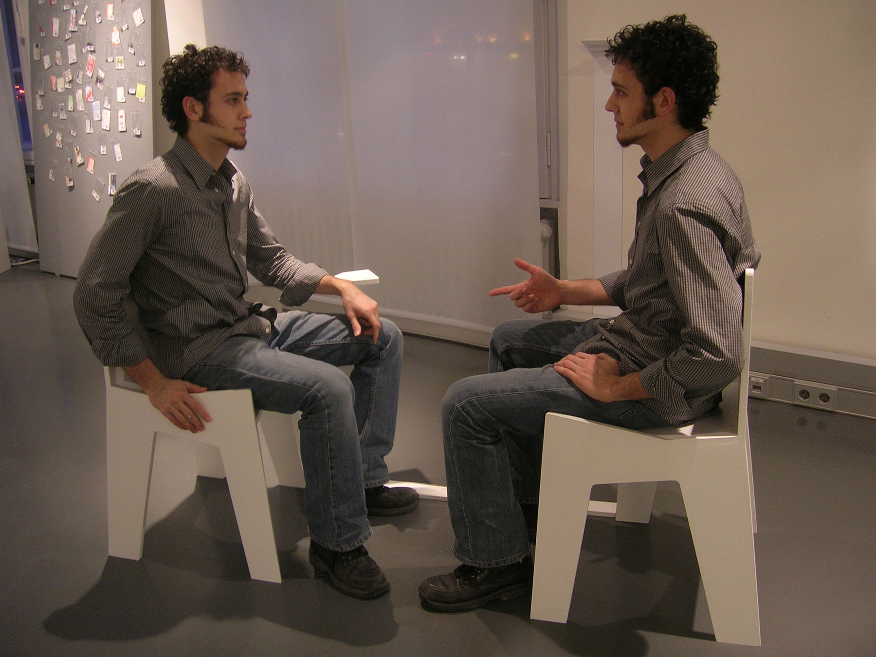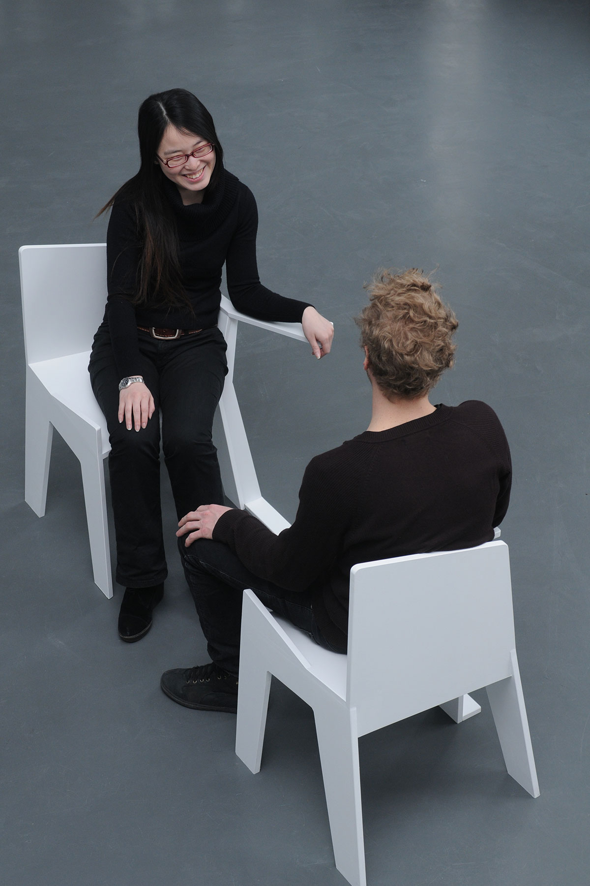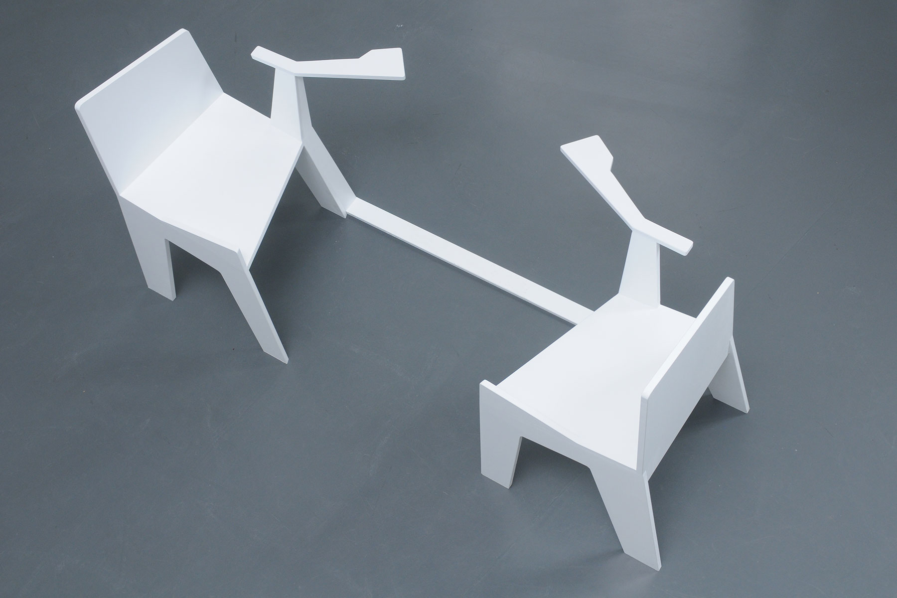 Der experimentelle Aufbau der beiden ungewöhnlichen Sitze, zwingt die Sitzenden zu gespiegelten Handlungen: Die einseitig vorhandene Armlehne ermöglicht es nur, an einer bestimmten Position etwas abzulegen. Stellt der eine also sein Glas ab, so wird es der andere ihm gleich tun, nur eben seitenverkehrt. Die zur einen Seite abfallende Sitzfläche lässt es nur zu, das eine bestimmte Bein über das andere zu schlagen, ohne dabei aus der Balance zu kommen, so dass auch diese Handlung vom Gegenüber in gleicher Weise vollzogen werden muss. Durch die räumliche Nähe und den Anstoß zu gespiegelten Bewegungen werden die Sitzenden mit ihrem Gegenüber konfrontiert – es gibt kein Ausweichen. Pflicht zur Konversation oder die Möglichkeit sich selbst in seinem Gegenüber zu erkennen?