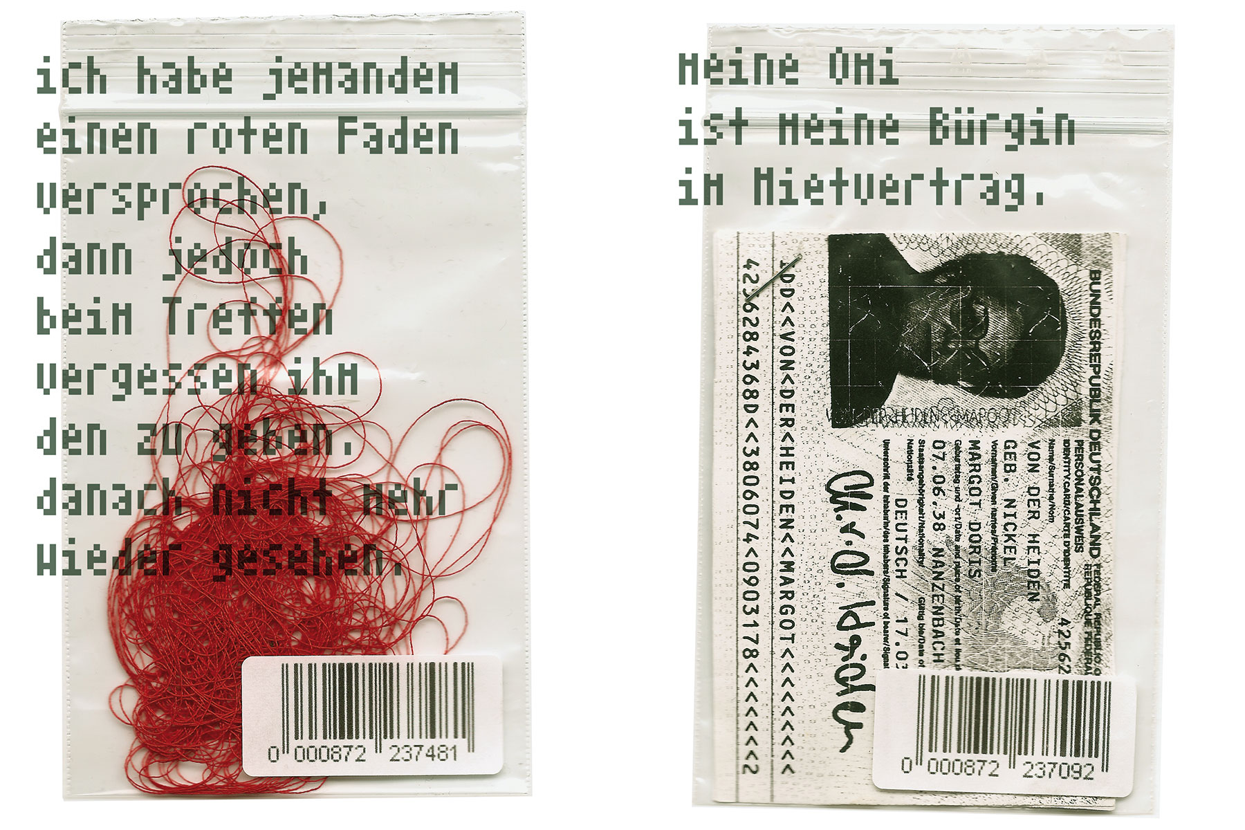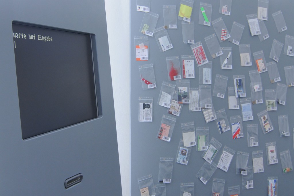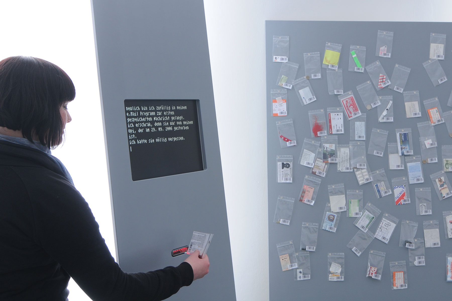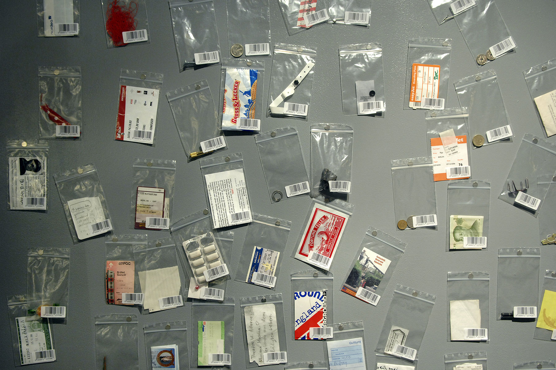 Eine Sammlung kleiner scheinbar wahllos zusammengestellter Objekte ist an eine Wand geheftet. Wie Fundstücke einer kriminologischen Spurensicherung sind diese Objekte eingetütete Erinnerungen, die vom Betrachter näher untersucht werden dürfen. Mit Hilfe eines Barcode-Scanners lassen sich die hinter den einzelnen Objekten verborgenen Erlebnisse und Situationen abrufen. Die Texte erscheinen wie langsam wachgerufene Erinnerungen, ähnlich einem Fernschreiber, Buchstabe für Buchstabe auf einem Bildschirm.