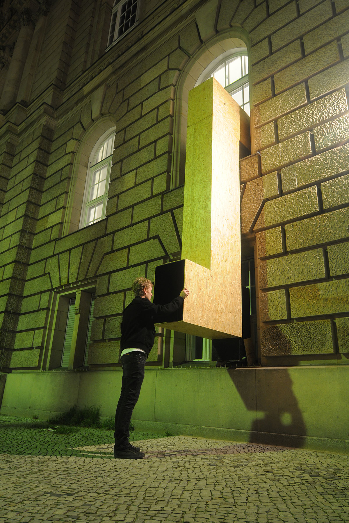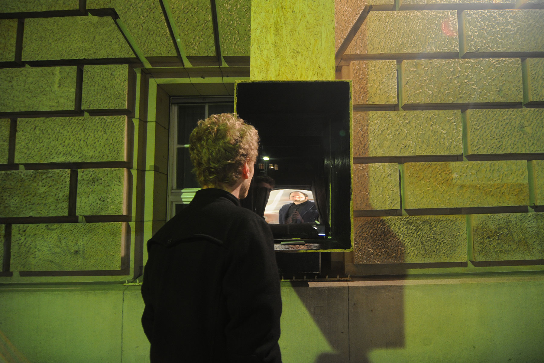 Durch ein an der Fassade installiertes Periskop können sowohl ankommende Gäste als auch Passanten von der Straße aus einen direkten Einblick in die Räumlichkeiten des Salonabends bekommen.