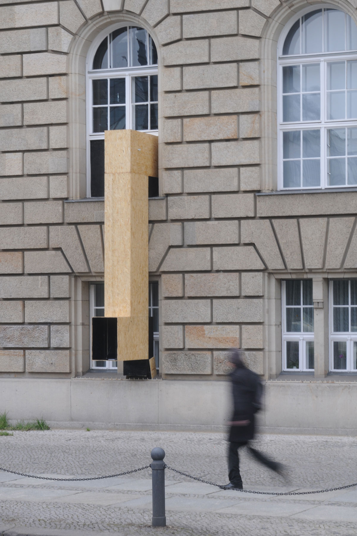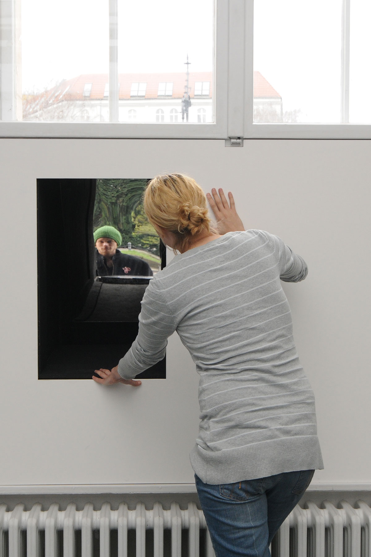 Über zwei Spiegel, die in dem rohrförmigen Aufbau stecken, werden Blicke und Reaktionen von oben nach unten und umgekehrt transportiert. Bei fortschreitender Dunkelheit verwandelt sich die untere Öffnung in einen Leuchtkasten, als Sinnbild dafür, die Arbeit des Leo Baeck Institutes nach außen zu tragen.