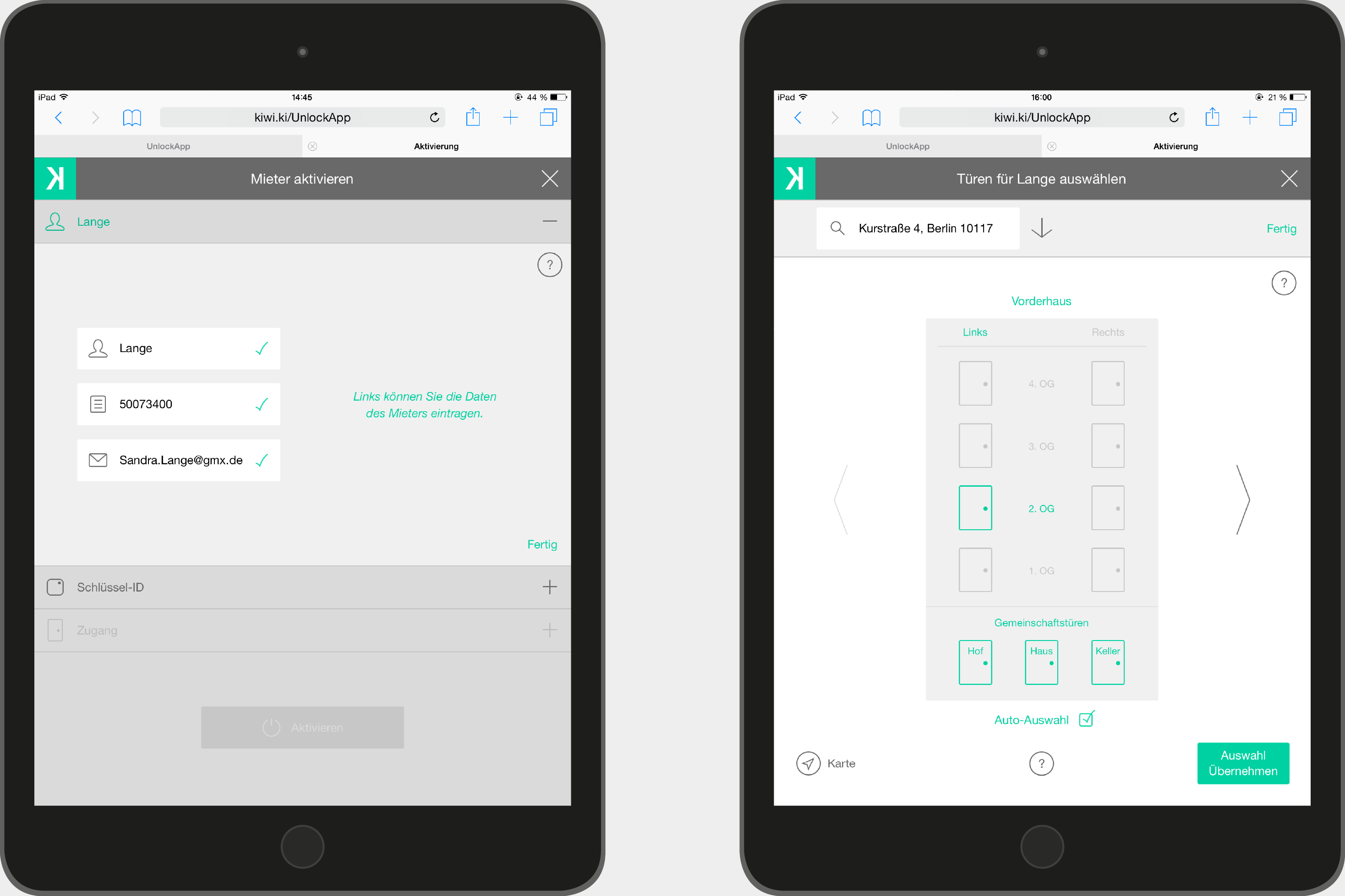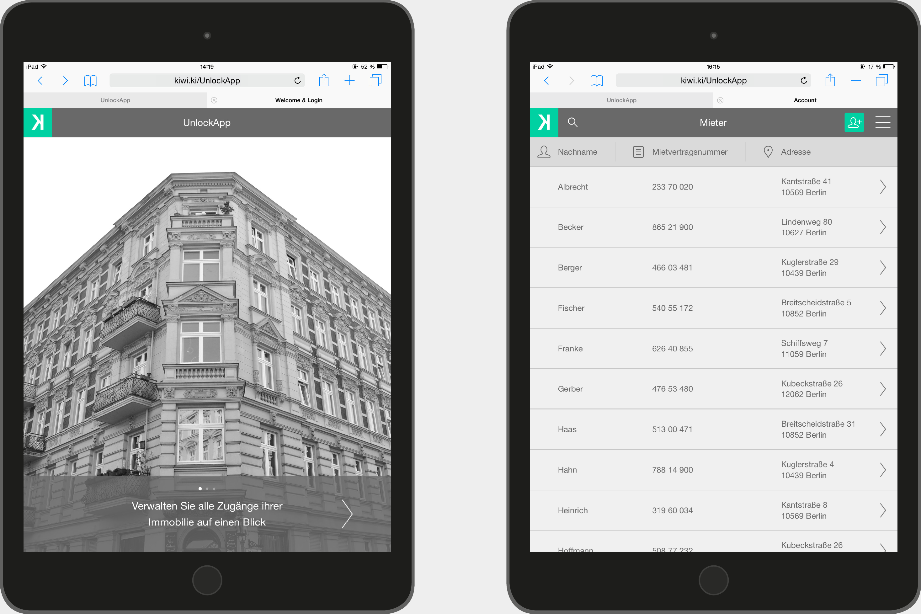 Mit der UnlockApp lassen sich zum Beispiel bei Wohnungsübergaben Mieter-Zugänge für das KIWI-System aktivieren und verwalten. Ein solcher Zugang beinhaltet Nutzerdaten, wie den Namen des Mieters und die Schlüssel-ID seines Transponders, sowie die Türen, zu denen er Zugang erhalten soll. Mit der Schnittstelle haben Hausverwaltungen die Möglichkeit, ihre Türen mit allen Zugängen zentral zu verwalten. Bei Verlust eines Transponders können einzelne Komponenten nachträglich gesperrt werden. Dies spart Versicherungskosten und Bearbeitungszeit. Der Service wird webbasiert angeboten und ist somit auf mobilen Endgeräten, wie dem Tablet-PC, erreichbar.