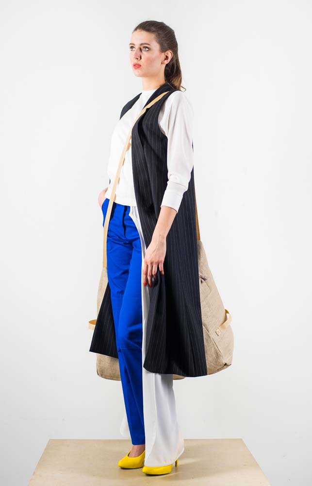 In meiner Kollektion kommen verschiedene Aspekte aus diversen Lebensbereichen zusammen und verschmelzen miteinander. Der klassische Frack, der Archetyp für strikten Dresscode wird „zerlegt“ und vermischt sich nach und nach mit dem Jogginganzug, dem „Blaumann“, dem Nachtemd, der Unterwäsche und dem klassischen Business-Anzug.