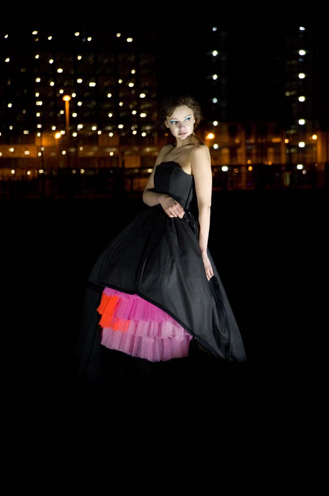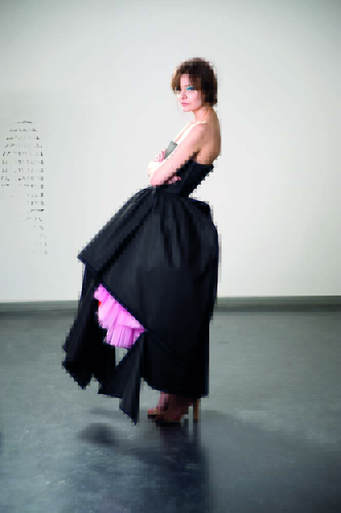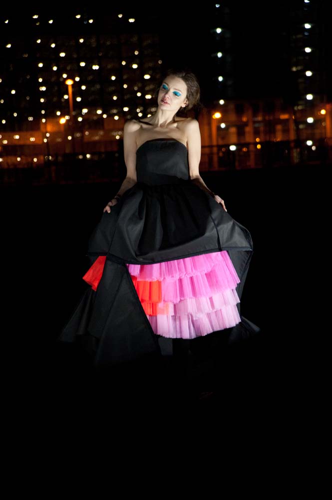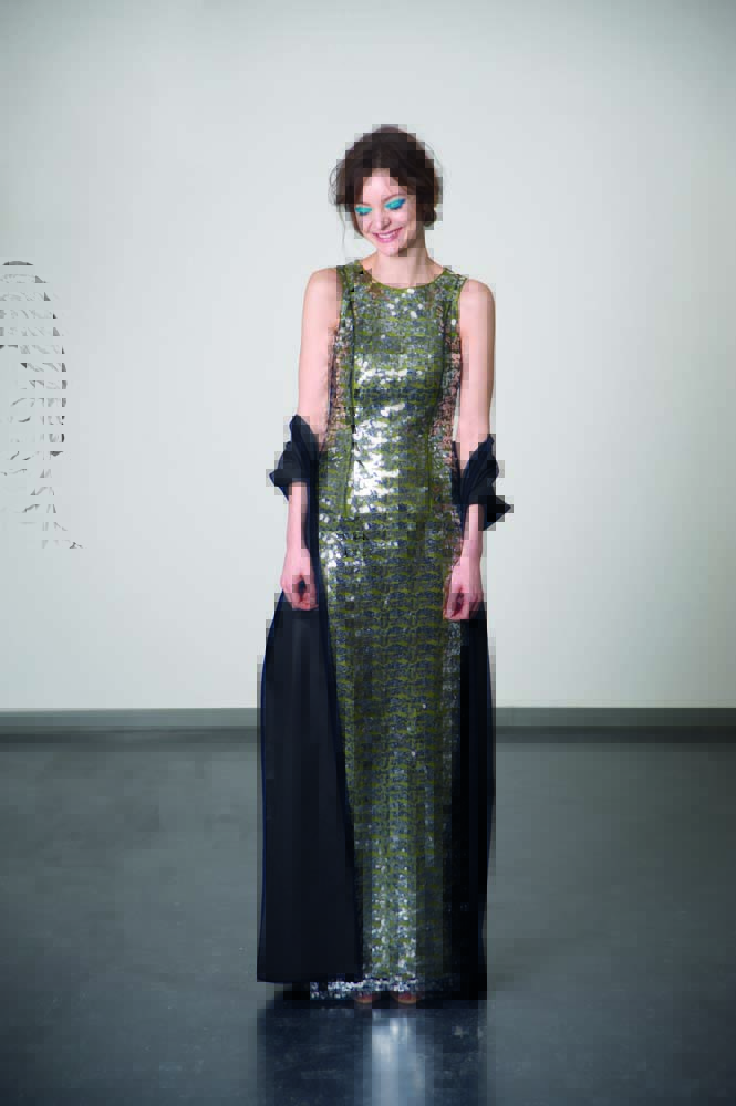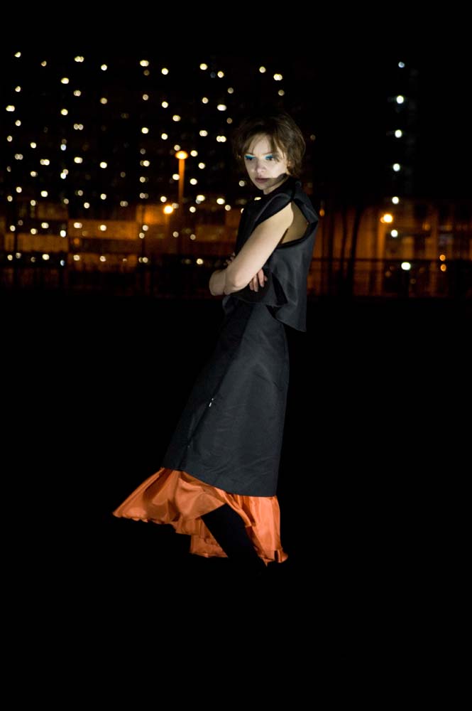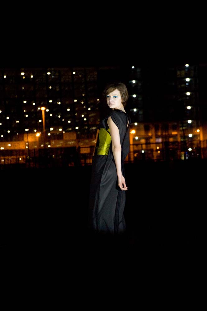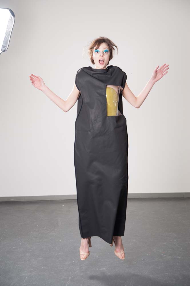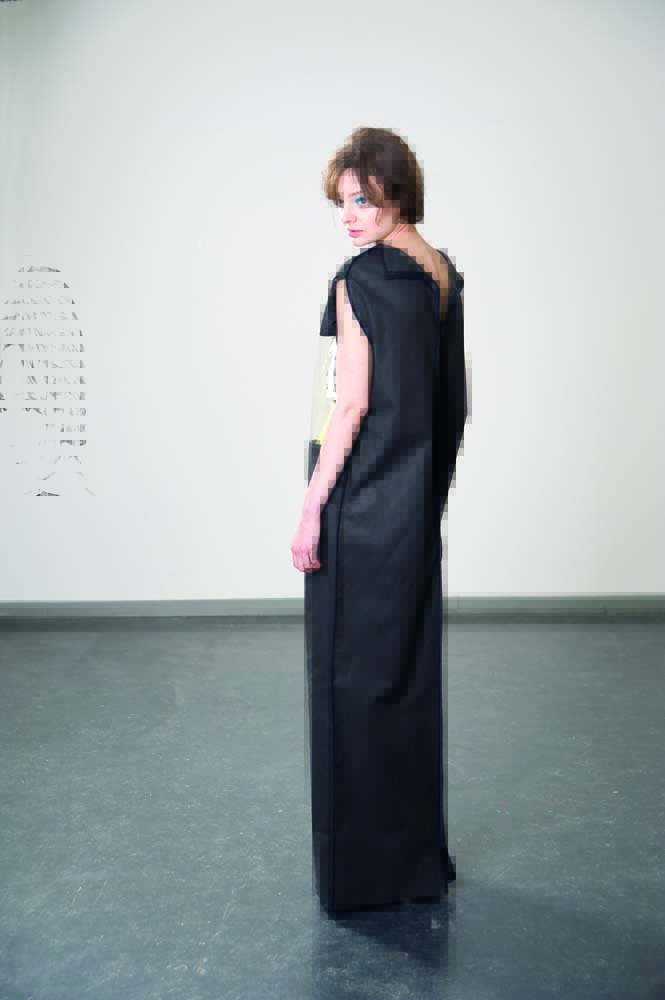 Erregt das Verdeckte Aufmerksamkeit? In Highlighting Covers geht es um Hüllen, die ihren Inhalt verbergen und gleichzeitig offenbaren. Motorradhüllen, Bauplanen und andere profane Alltagshüllen können komplexe Formen durch ihr Verdecken zu einer homogenen Fläche reduzieren. Die äußeren Kleider der Kollektion fungieren als Hülle weiterer Kleidungsstücke. In ihrer Verarbeitung und im Material wird der Kleidersack zitiert. Während die Silhouetten an eine weibliche Formsprache erinnern wird Weiblichkeit und Neutralität, Intimität und Öffentlichkeit in den Outfits vereint.