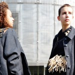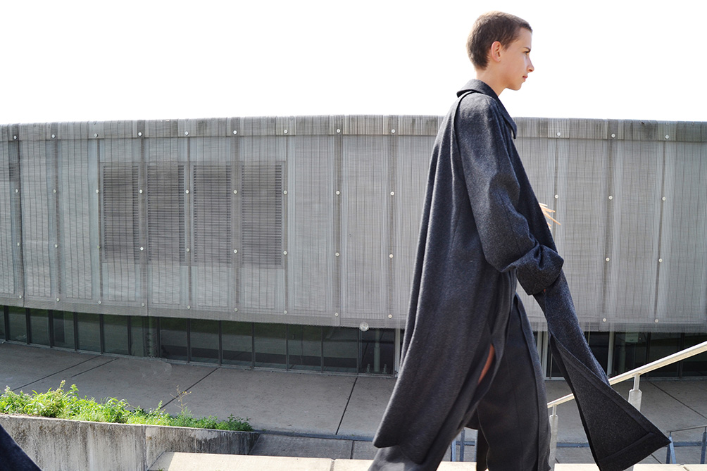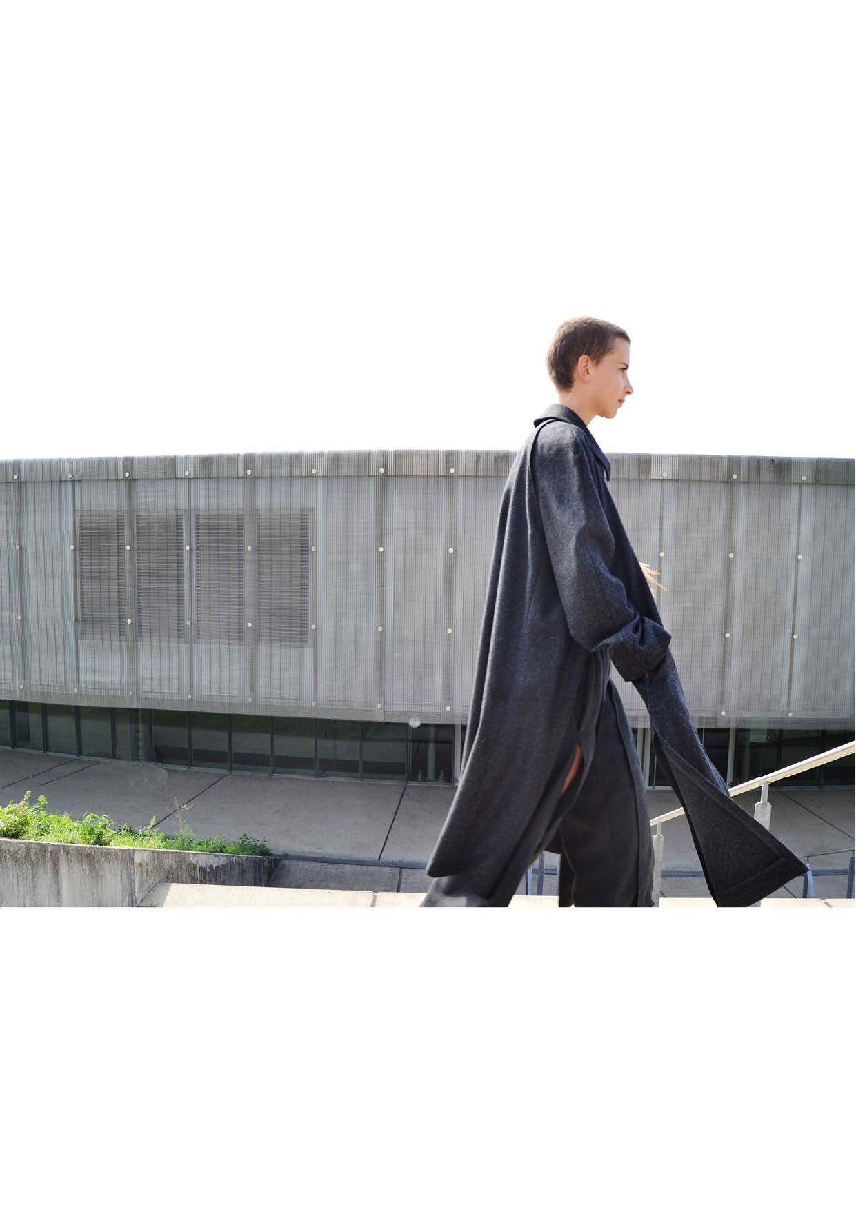 Kairos beschäftigt sich mit dem Rollkragenpullover, im besonderen mit dem Nonkonformismus, der ihm innewohnt. Zunächst getragen von Fischern der englischen Kanalinseln wird er in den 40er Jahren zum Erkennungsmerkmal der Existentialisten, der Bohème und der Avantgarde. Wichtige Momente sind der Bruch mit Konventionen und das Spontane, formelle Kleidung wird informell. Thema ist der Mann, der sich mit aller Konzentration einem Sachverhalt zuwendet, ihn beobachtet und reflektiert. Dieser Prozess schafft eine intensive Atmosphäre, das Warten auf etwas noch nicht Greifbares, eine Idee, eine Vision. Der Ausgangspunkt für die Silhouette ist der dreiteilige Herrenanzug mit Mantel. Großzügiges Volumen, Layering und grobe Wollqualitäten nehmen den Outfits das streng Formelle. ! Grob- und Feinstrick kontrastieren mit dichten Webstoffen. Der ‘sehr angezogene’ Look der Kollektion stellt Kopf und Hände in den Fokus – Denken und Handeln