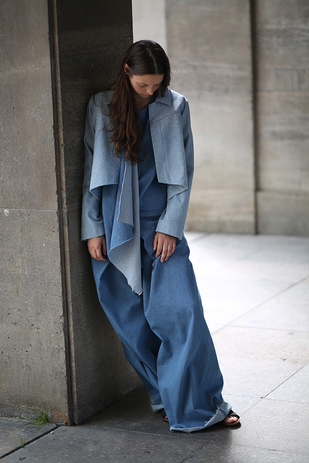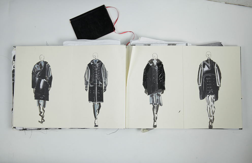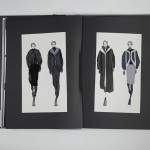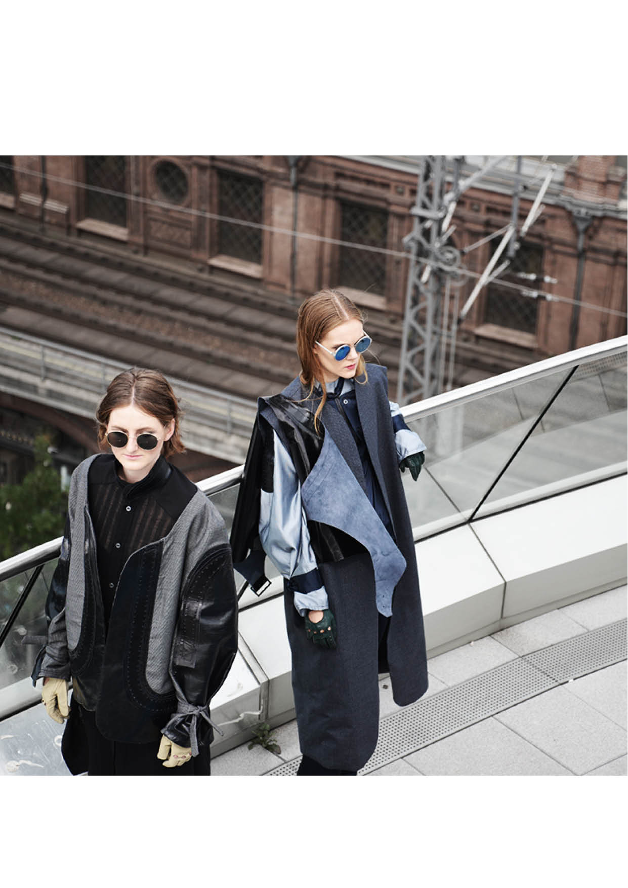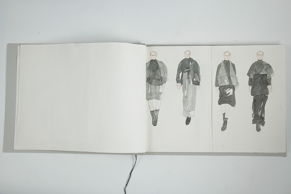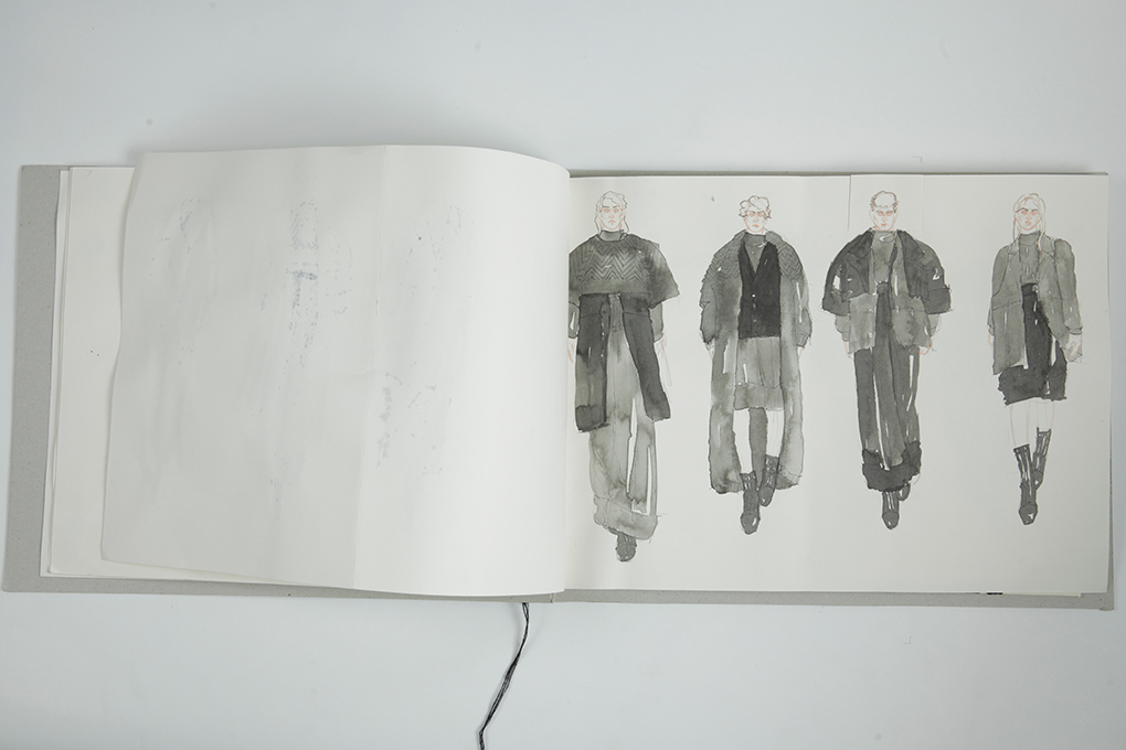 The Budapester is characterised by its special hole pattern (Lyra perforation) and the enormous quality. A shoe can be composed of up to 30 pattern pieces and each layer is assembled with highly precision. This explains the special quality of craftsmanship and the durability of up to 20 years. My grandfather inspired me to choose this men’s shoe – I’ve always looked up to him from when i was very little and admired his way of dressing and the importance he put on details for his outward appearance. That took me back in a time/generation (forties) where strict dress conventions determined the society. Wearing no vest with a suit was considerd a stylistic inconsistency. I was especially fascinated by the Gentlemen’s scene – a world that offers an amazing number of accessories and details and a way of life which is hard to find nowadays. The collection reflects the „being perfectly dressed“ and puts the focus on paying attention to every detail and to use each layer systematically. I used photographies of brogues by printing and drawing my designs upon them. This way I created my design concept. The question I asked myself was how can you set the processing and the quality of this shoe in a textile context? The starting point for the patterns was the three-piece suit and the man’s overcoat. Nevertheless, the silhouettes of the collection play with volume, and break out of the line of the classic boxy conventions. An important role is played by material and color contrasts, as well as the confrontation of the closed processing like the three-piece suit and the robust processing of Budapester.The processing of leather takes up the Lyra perforation of the shoe and can be found in details of the garments. Smooth goatskin and slightly textured wool are combined with flowing and transparent fabrics to create a clear contrast in the materiality.