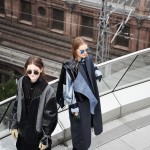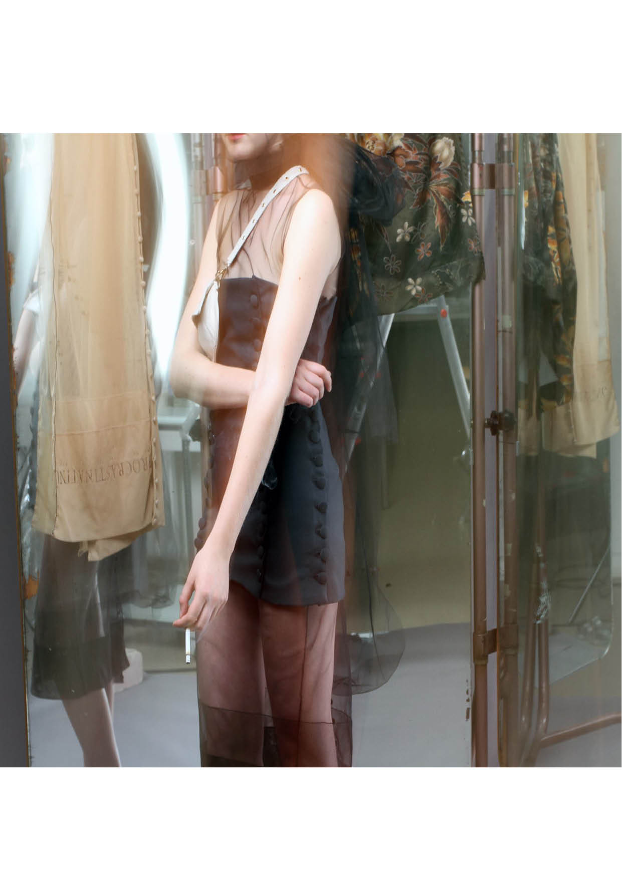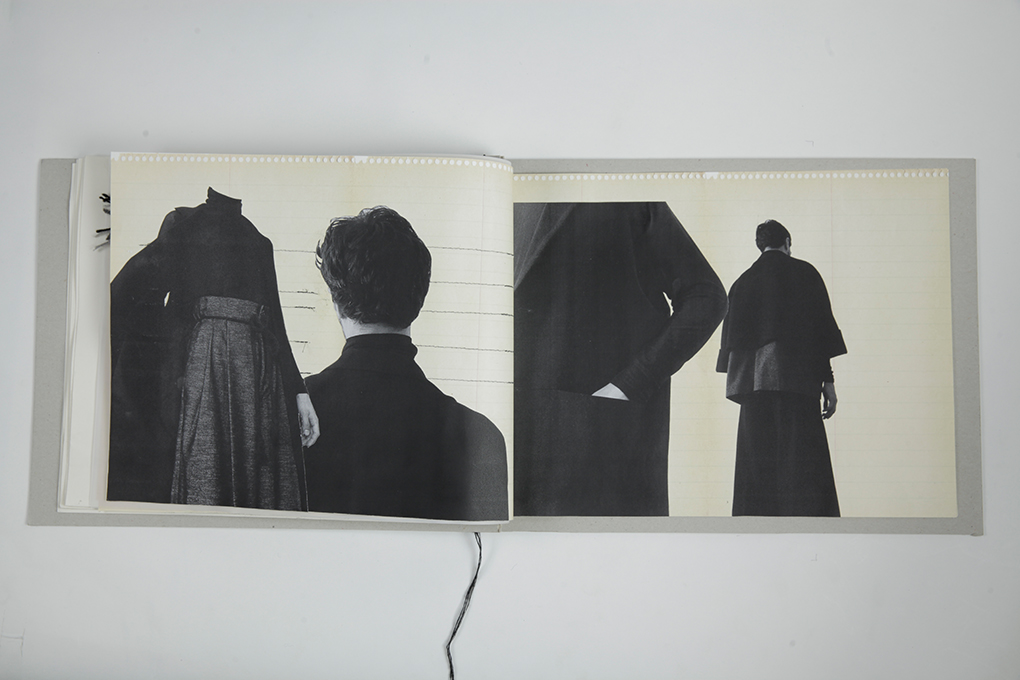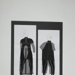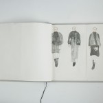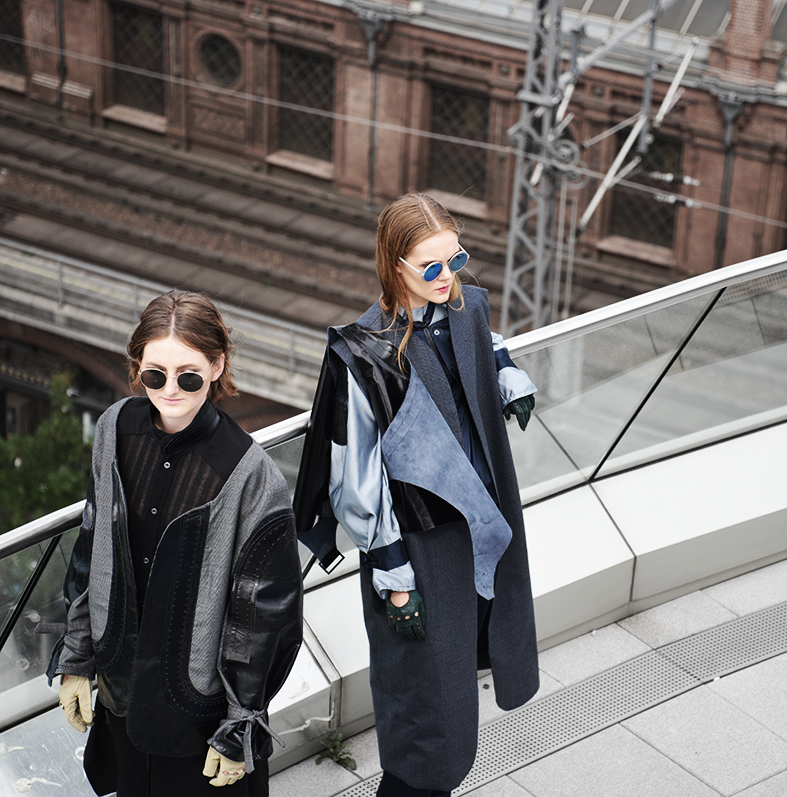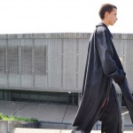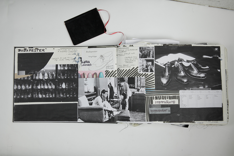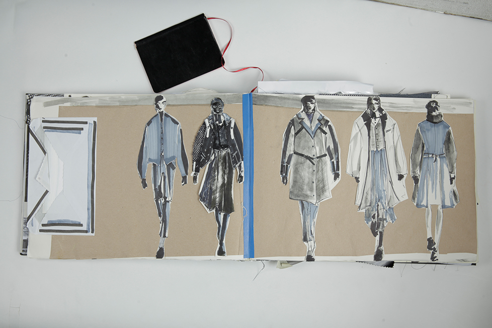 The Budapester is characterised by its special hole pattern (Lyra perforation) and the enormous quality. A shoe can be composed of up to 30 pattern pieces and each layer is assembled with highly precision. This explains the special quality of craftsmanship and the durability of up to 20 years. My grandfather inspired me to choose this men’s shoe – I’ve always looked up to him from when i was very little and admired his way of dressing and the importance he put on details for his outward appearance. That took me back in a time/generation (forties) where strict dress conventions determined the society. Wearing no vest with a suit was considerd a stylistic inconsistency. I was especially fascinated by the Gentlemen’s scene – a world that offers an amazing number of accessories and details and a way of life which is hard to find nowadays. The collection reflects the „being perfectly dressed“ and puts the focus on paying attention to every detail and to use each layer systematically. I used photographies of brogues by printing and drawing my designs upon them. This way I created my design concept. The question I asked myself was how can you set the processing and the quality of this shoe in a textile context? The starting point for the patterns was the three-piece suit and the man’s overcoat. Nevertheless, the silhouettes of the collection play with volume, and break out of the line of the classic boxy conventions. An important role is played by material and color contrasts, as well as the confrontation of the closed processing like the three-piece suit and the robust processing of Budapester.The processing of leather takes up the Lyra perforation of the shoe and can be found in details of the garments. Smooth goatskin and slightly textured wool are combined with flowing and transparent fabrics to create a clear contrast in the materiality.