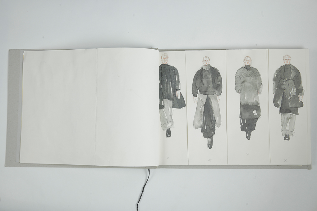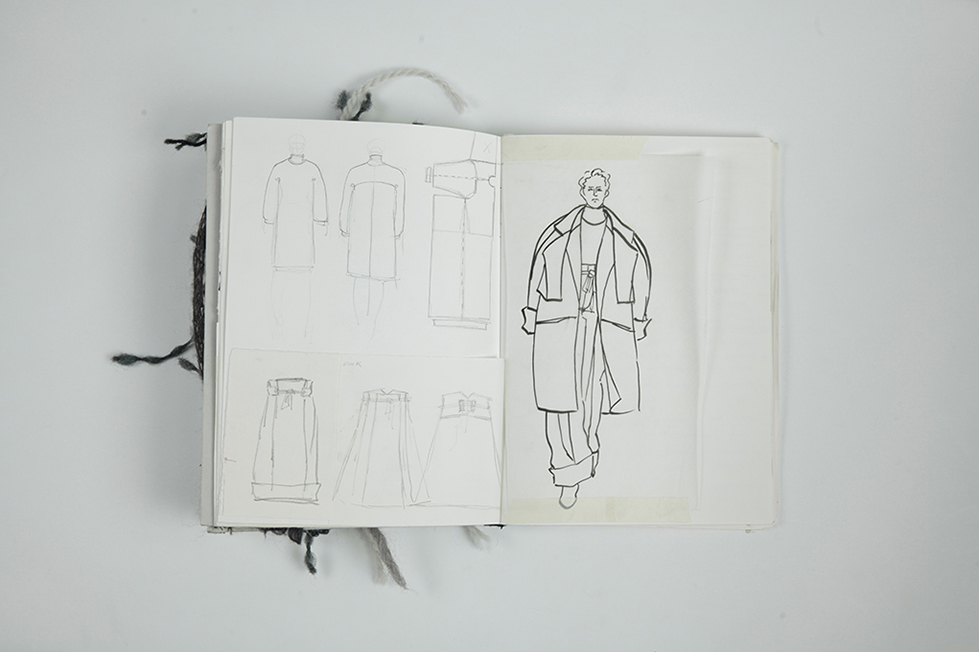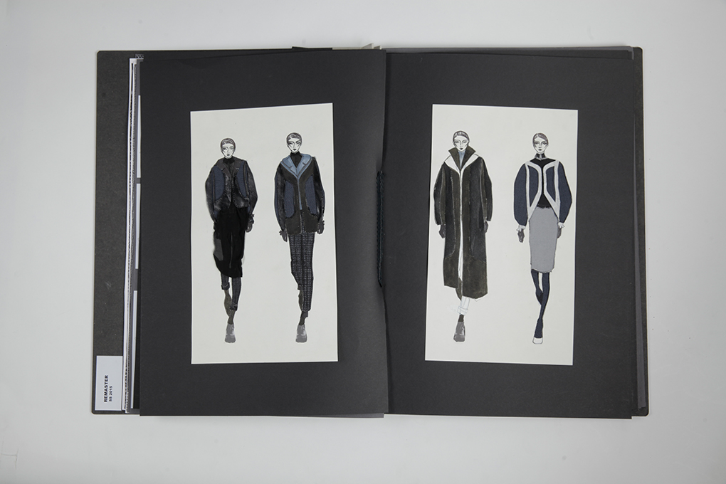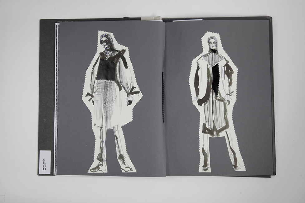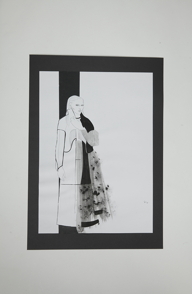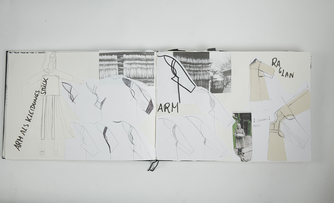 The project „Remaster“ starts with the choice of a classic piece of clothing, which is important to me personal. I chose the „Hubertusmantel“ of my father, it is a special kind of coat, which is worn by many Austrian men on special occasions. The coat is formal and made out of loden. By reconstructing the piece of cloth I found out that it has a total different processing than normal coat constructions. The sleeves are finished with lining as a separate piece of clothing, as well as the corpus. The armhole has a open construction, because the coat has it’s origin in hunting clothes, the arm construction was created to guarantee mobility to shoot. I started to work with this mobility, by giving the wearer the possibility of moving. That fact was the starting point of my collection of two sewn outfits and drawn collection of 20 looks. Two important inspirations for „remaster“ are the photo box of my family with pictures of my working relatives on the farm and the research of this specific coat and sleeve construction. Important for my design was home, tradition, handicraft and generations. Most people leave home, but we all take values, moments and family backgrounds with us. This makes every person special. By showing my stock, I try to combine the feeling of where I come from with the fact that the world is open to me. With the use of a crafting technique with straw and a modern design I remastered my personal classic in my collection.