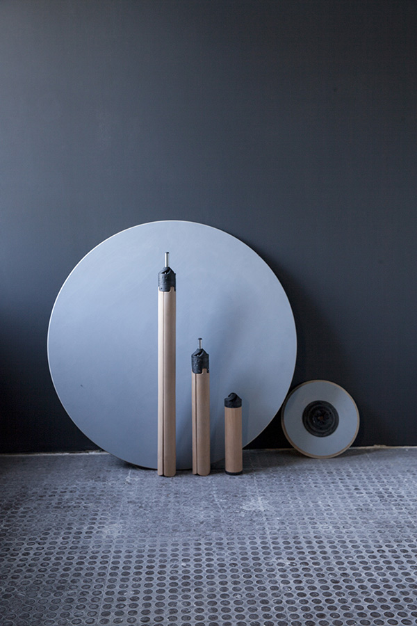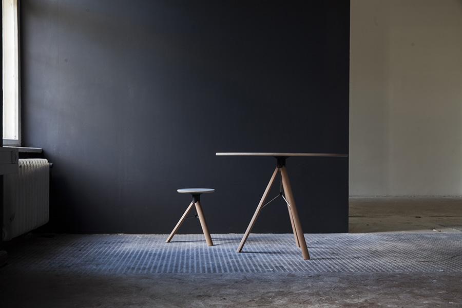 Major Tom is a modular system. The key component is a conical steep-thread that connects the modular elements quick and easy. This connection is secured by a simple mechanism. The mounting modules are foldable tripods which form a cylinder when closed and thereby only require a minimum amount of space. Besides building a table or a chair there is no limit to modularity.