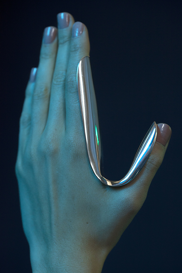 In meiner Abschlussarbeit Zwischen Körper und Raum konzentriere ich mich auf die visuelle und taktile Wahrnehmung. Die Objekte sind vorrangig für die Erfahrung und Benutzung des Trägers gestaltet. Durch Aktivierung, Fokussierung, Erweiterung oder Blockierung eines Sinnes werden wir uns unserer Selbst bewusster. Die am Körper getragenen Objekte werden zu einer Pufferzone. Es entsteht eine Distanz zwischen der Person und dem seinen Körper umgebenden Raum – jenem Raum, der mit anderen Menschen geteilt wird. Als Erweiterungen des menschlichen Körpers führen die drei Objekte – durch Interaktion mit Anderen, zu einer neuen Wahrnehmung von Raum und Körper.