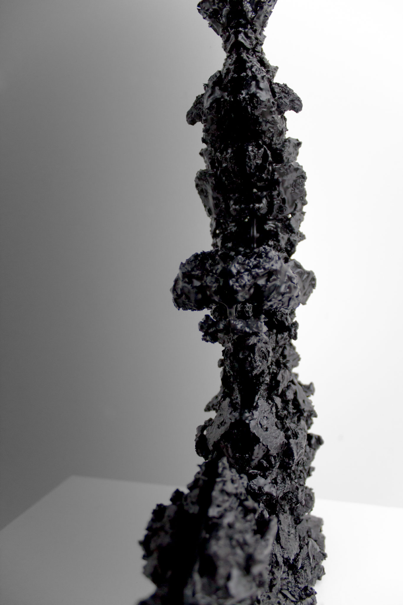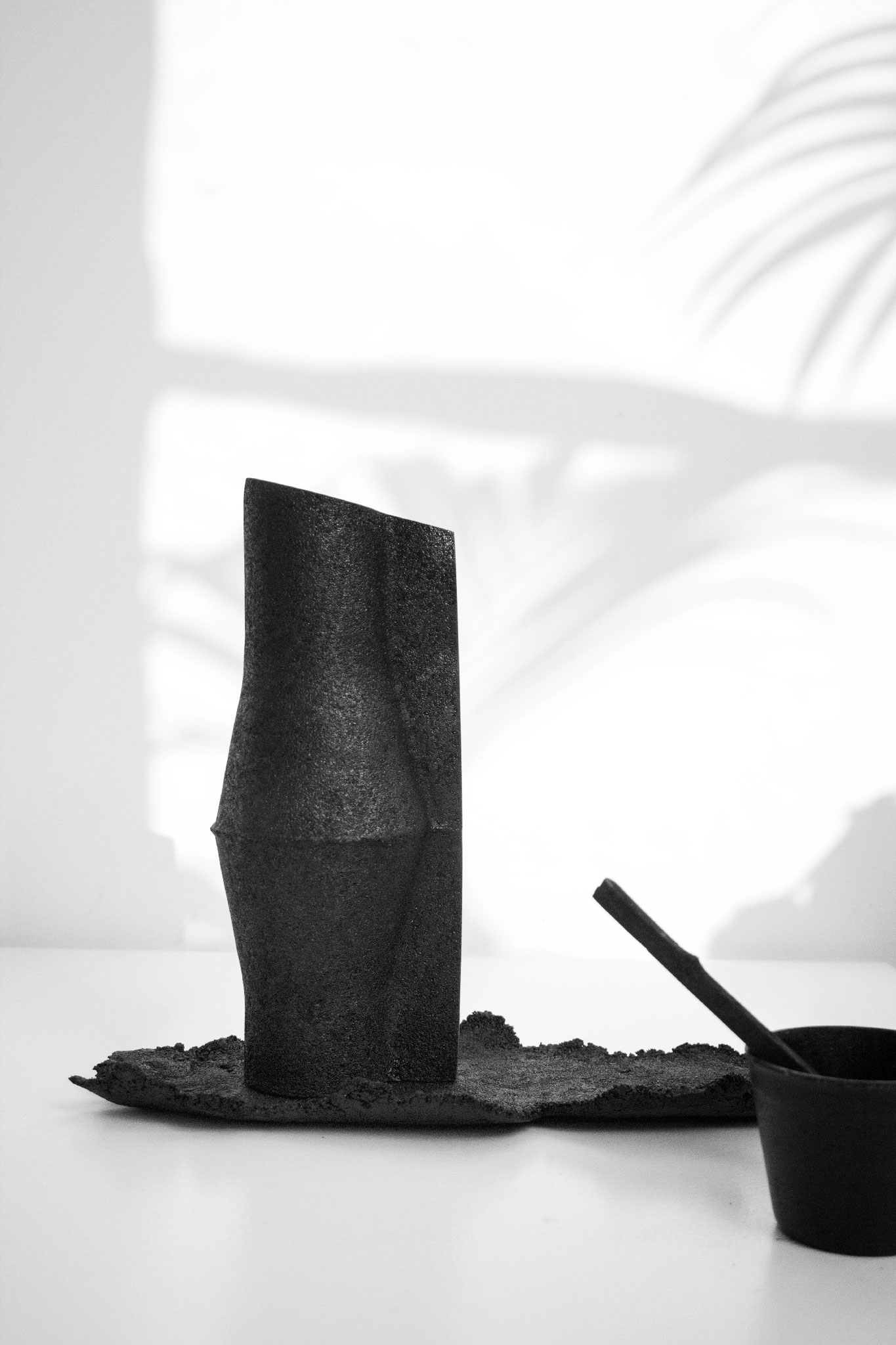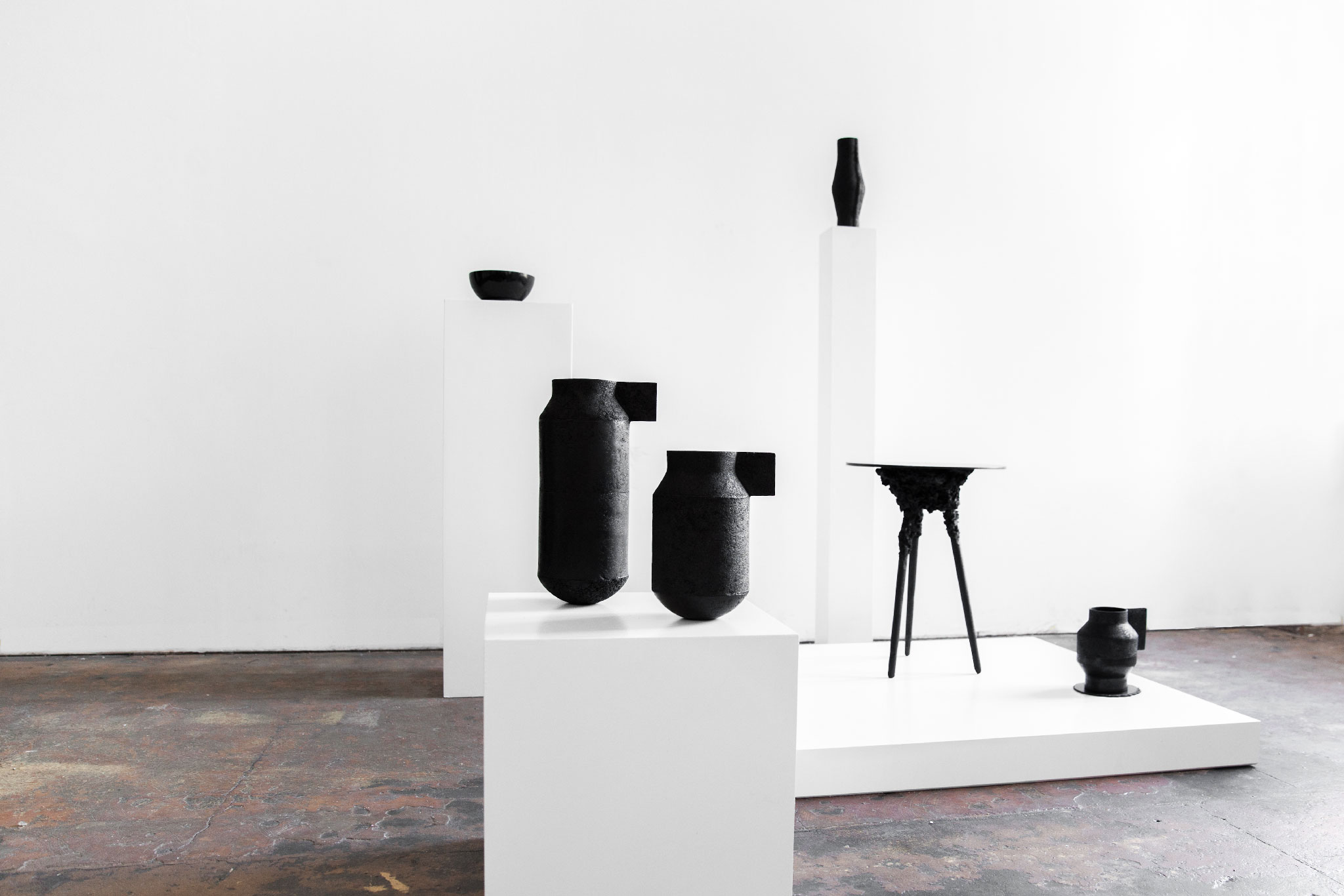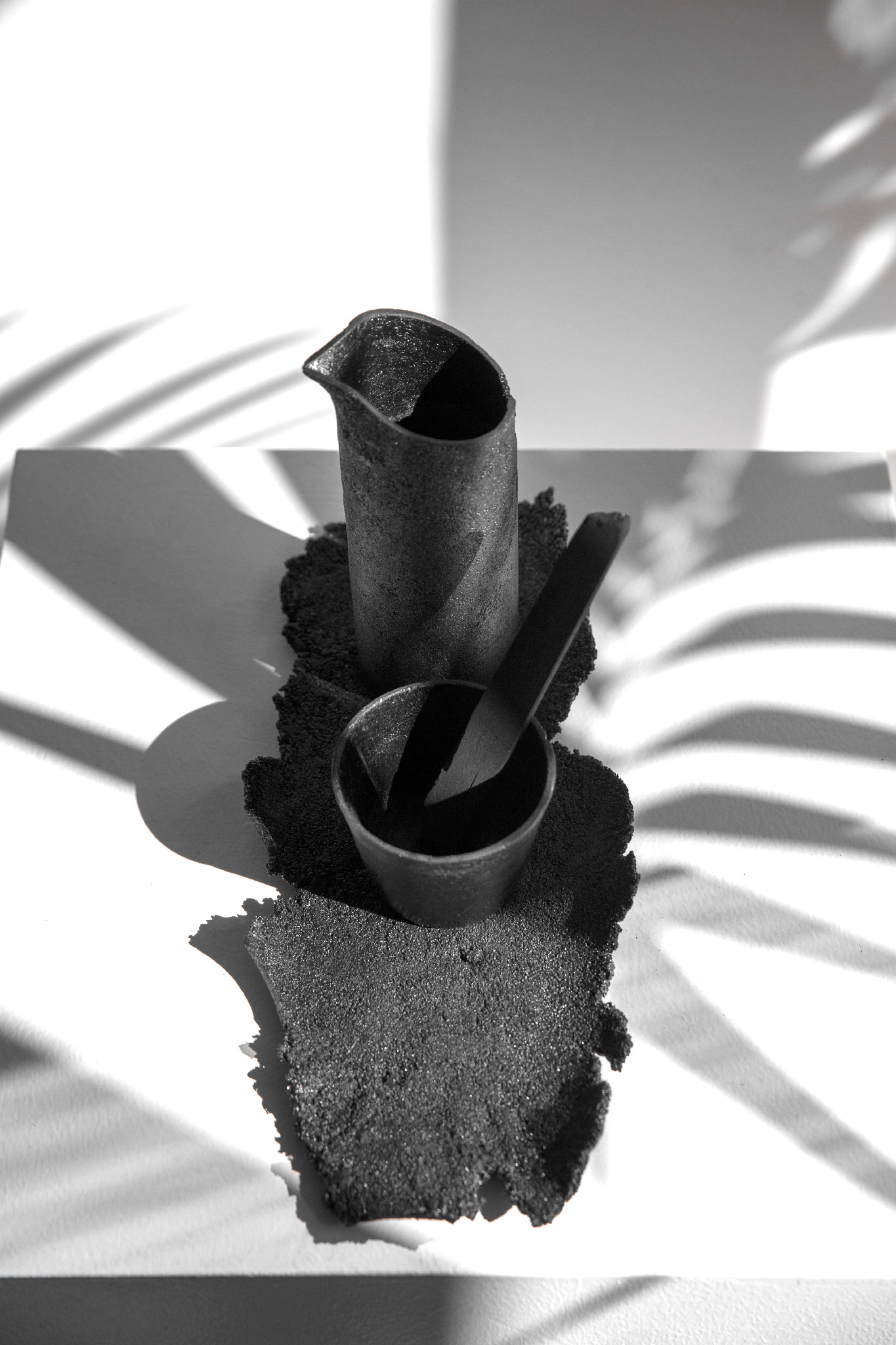 Die von uns behandelten Materialien sind Stoffe, über die wir nicht mehr Bescheid wissen; wofür sie gut waren, wie sie sich anfühlen, welcher Geruch an ihnen haftet oder wie schwer sie in der Hand liegen. Als Urahnen der petrochemisch erzeugten Materialien legen sie Fragen frei; zum Verschwinden, dem was existiert und wie wir leben möchten. Ein einfaches thermoplastisches Komposit aus Schellack und Bambuskohle, den Rohstoffen einer längst vergangenen vorindustriellen Gesellschaft. Erhitzt, geformt, transformiert – verwandeln sich die Materialien in die von uns angestoßenen Prozesse. Sie werden biegsam, verflüssigen sich – nehmen einen anderen Aggregatzustand an. Die Objekte geraten in Bewegung oder ins Schweben. Die Stoffe sind verdichtet, aber nicht unveränderlich. Im selbst definierten break-and-remake Prozess können sie sich im nächsten Schritt wieder verflüssigen und erneut in eine andere Form verwandeln. So wird der Erinnerungsraum zum Vorstellungsraum. Im spekulativen Sinn verschwimmen so die klaren Grenzen des Gebrauchs. So sollen die Objekte als Prototypen dienen, als Benutzerhandbücher einer Erinnerung im (Rück-)Blick auf eine andere mögliche Wirklichkeit.