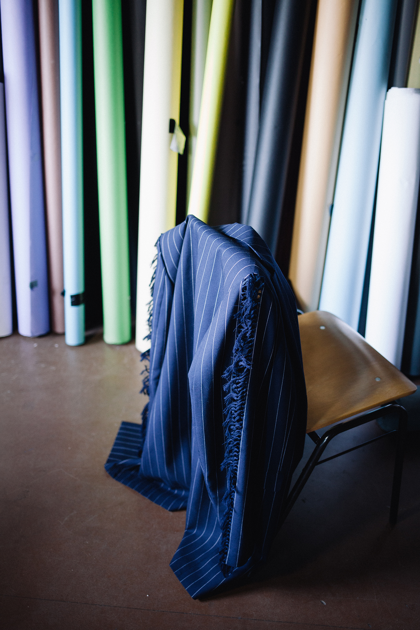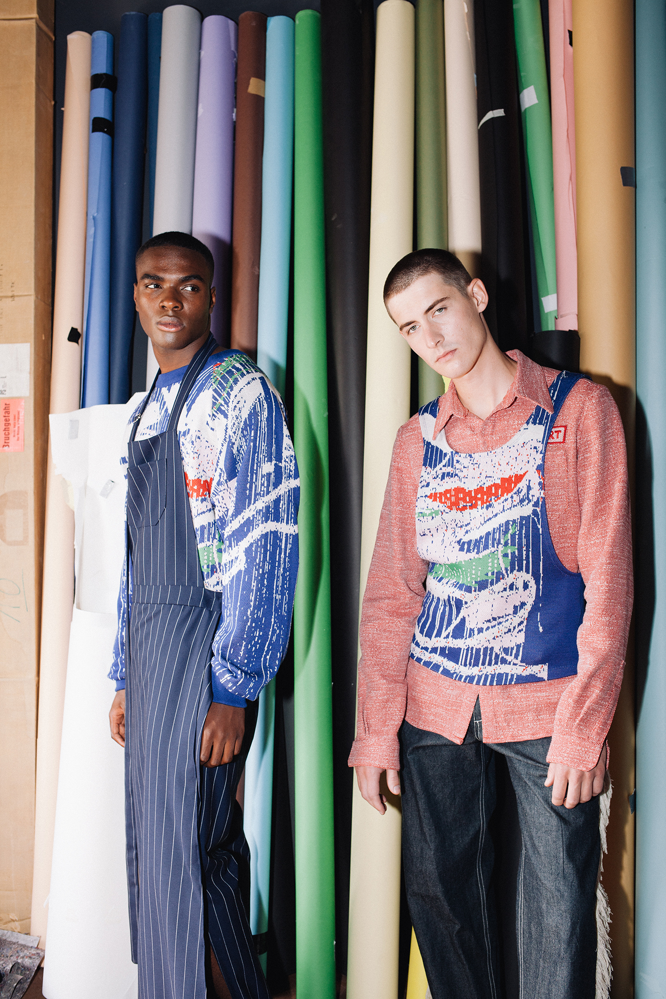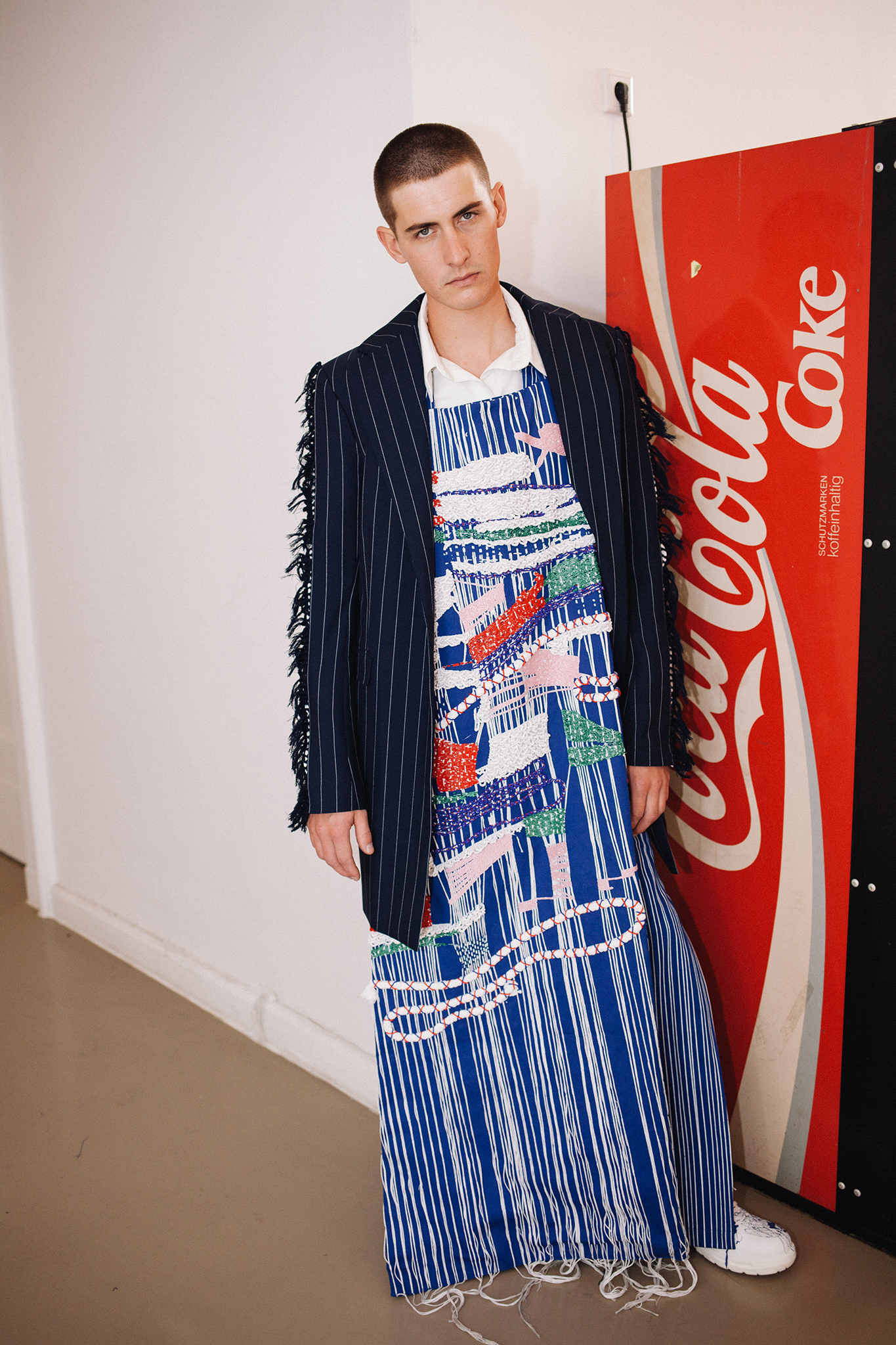 Dieses Spannungsfeld in dem sich das Thema „Work“ einordnet, ist Ausgangspunkt für den gestalterischen Schwerpunkt und die Umsetzung der Kollektion. Arbeit ist einer der größten Zwänge und zugleich ein Privileg. Sie kann ebenso für Armut wie für Luxus stehen. Begriffe wie Improvisation und Arbeitsprozess werden als Gestaltungsprinzipien aufgegriffen. Im Bekleidungskontext bildete Arbeitsbekleidung ein Ausgangspunkt, der wiederum einen genaueren Blick auf Bekleidung als bloße, zweckmäßige Schutzhülle wirft. Verschleiß und Versehrtheit können ebenfalls als Gestaltungsprinzipien genannt werden. Entstanden ist eine Kollektion, die sowohl in ihren Silhouetten, als auch in ihrer Materialität die Kontraste und die Vielschichtigkeit des Themas „Work“ aufzeigt. Dabei wurde ein besonderer Fokus auf die Materialität gelegt. Prozesshaft entstehendes und vielschichtiges Material soll den Kontrast von Handwerk und Industrie, von Einfachheit und Luxus in seiner Haptik, Anfertigungsweise und der Kombination von verschiedenen Materialitäten verdeutlichen. Insbesondere in Bezug auf Arbeitsbekleidung lassen sich die Veränderungen der Arbeitswelt deutlich machen, denn sie transportiert sowohl soziokulturelle Vorstellungen von Männlichkeit als auch die Bedeutung von Zeit. Doch sie könnte in Zukunft nur noch eine Art Relikt darstellen und im Sinne von vergangener Zeit, manuellen Tätigkeiten und der fortschreitenden Automatisierung und Digitalisierung der Arbeit, als Zeichen von „Zeit“, „Arbeit“ und „Tradition“ gesehen werden.