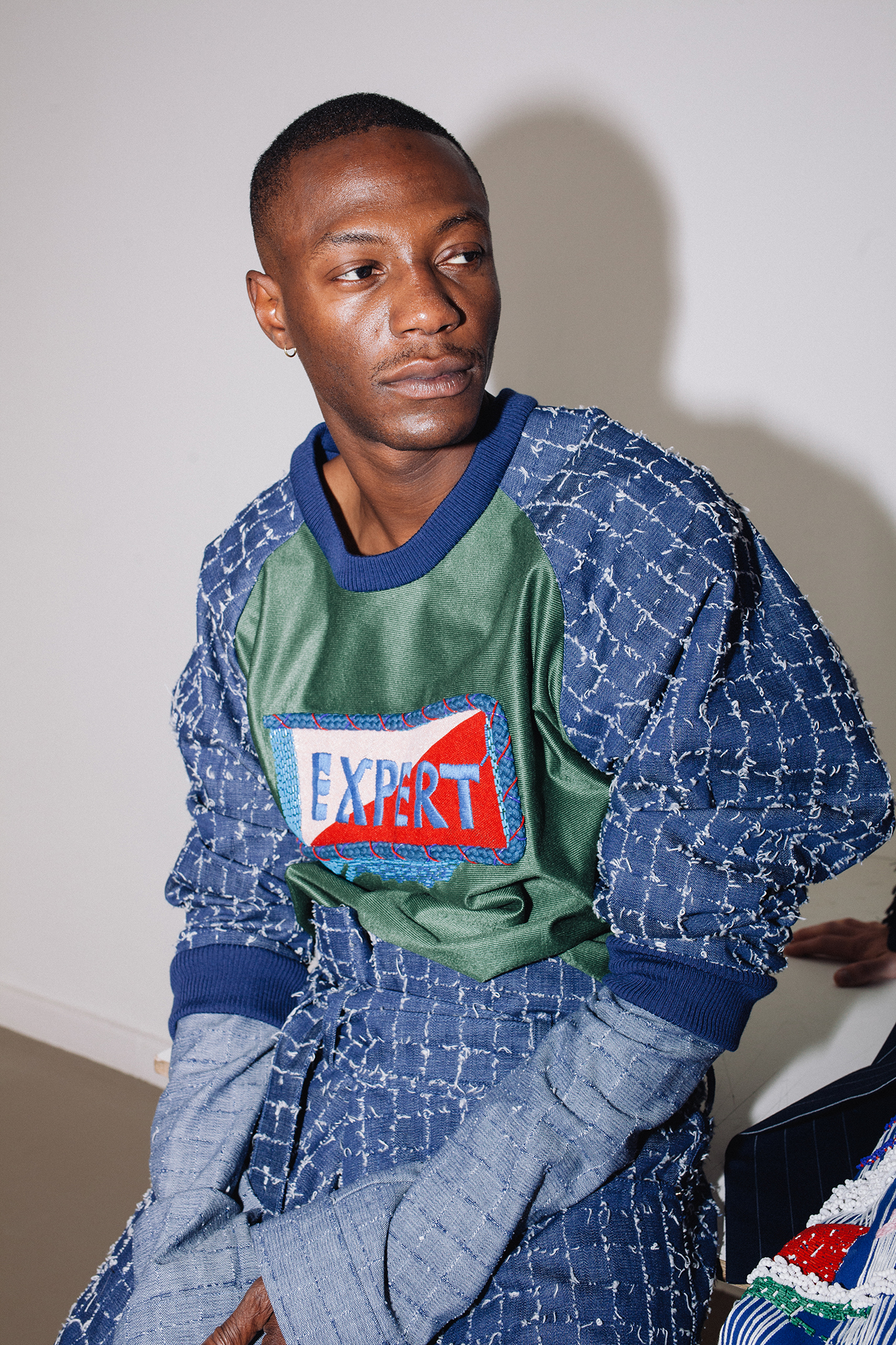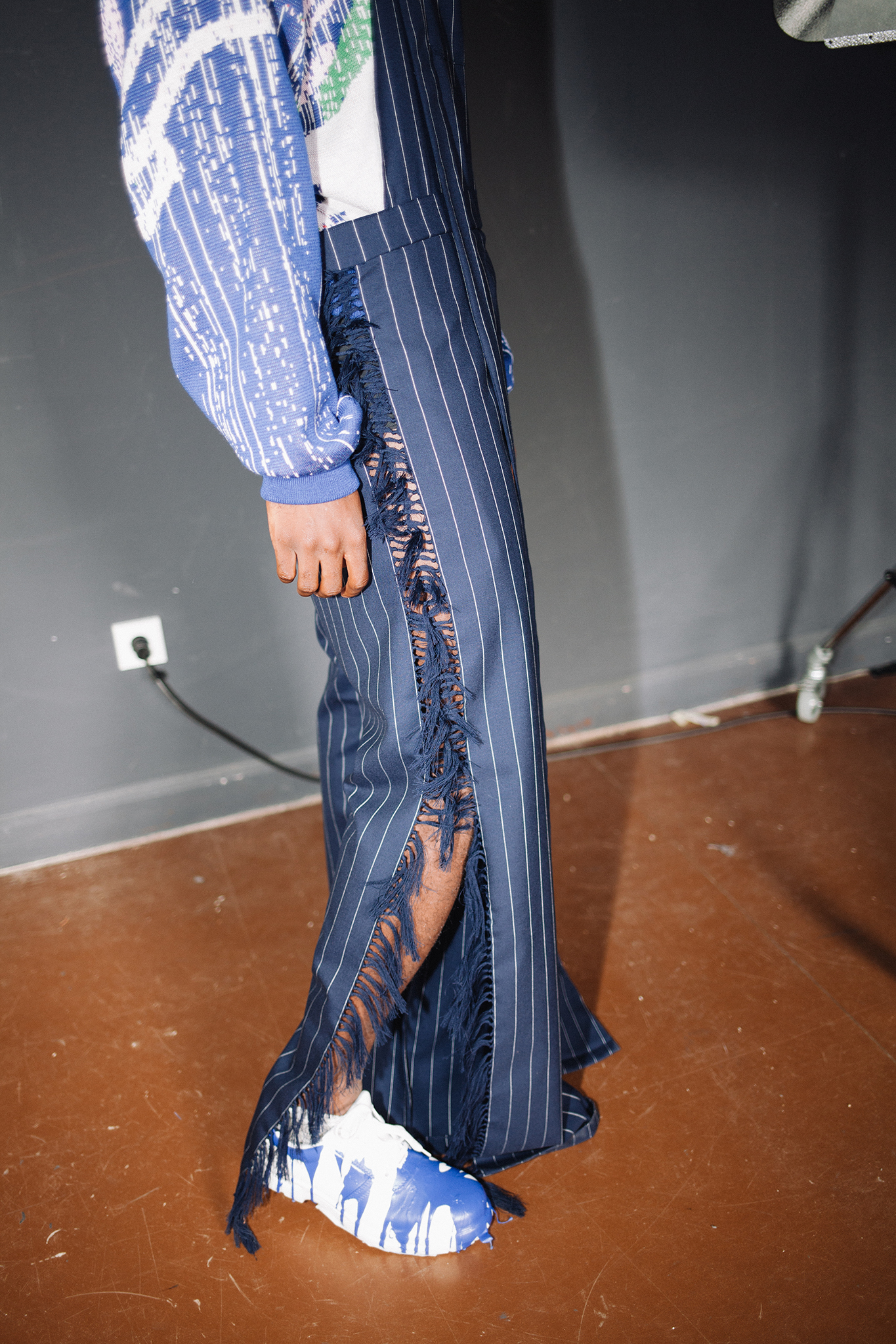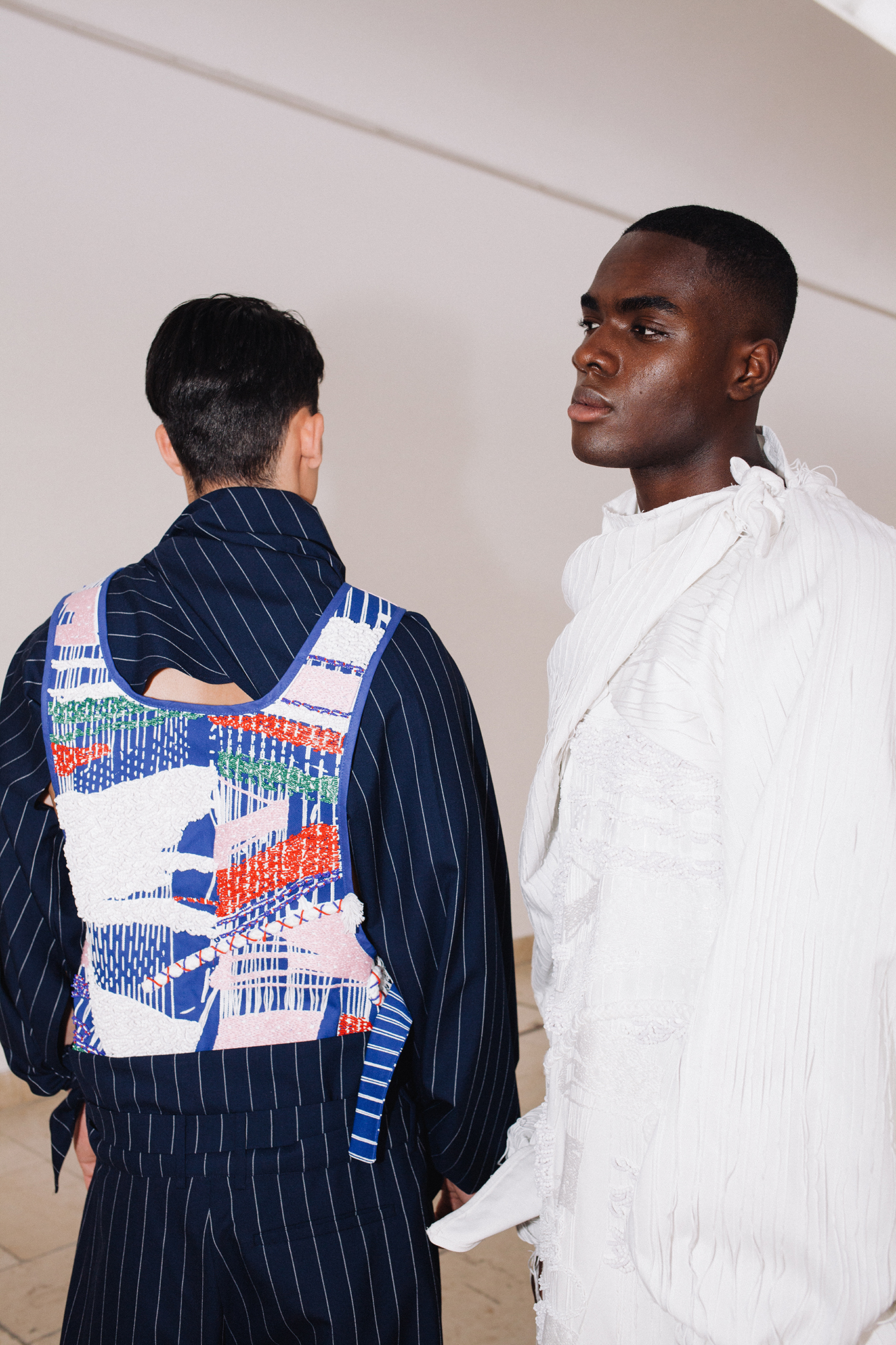 Dieses Spannungsfeld in dem sich das Thema „Work“ einordnet, ist Ausgangspunkt für den gestalterischen Schwerpunkt und die Umsetzung der Kollektion. Arbeit ist einer der größten Zwänge und zugleich ein Privileg. Sie kann ebenso für Armut wie für Luxus stehen. Begriffe wie Improvisation und Arbeitsprozess werden als Gestaltungsprinzipien aufgegriffen. Im Bekleidungskontext bildete Arbeitsbekleidung ein Ausgangspunkt, der wiederum einen genaueren Blick auf Bekleidung als bloße, zweckmäßige Schutzhülle wirft. Verschleiß und Versehrtheit können ebenfalls als Gestaltungsprinzipien genannt werden. Entstanden ist eine Kollektion, die sowohl in ihren Silhouetten, als auch in ihrer Materialität die Kontraste und die Vielschichtigkeit des Themas „Work“ aufzeigt. Dabei wurde ein besonderer Fokus auf die Materialität gelegt. Prozesshaft entstehendes und vielschichtiges Material soll den Kontrast von Handwerk und Industrie, von Einfachheit und Luxus in seiner Haptik, Anfertigungsweise und der Kombination von verschiedenen Materialitäten verdeutlichen. Insbesondere in Bezug auf Arbeitsbekleidung lassen sich die Veränderungen der Arbeitswelt deutlich machen, denn sie transportiert sowohl soziokulturelle Vorstellungen von Männlichkeit als auch die Bedeutung von Zeit. Doch sie könnte in Zukunft nur noch eine Art Relikt darstellen und im Sinne von vergangener Zeit, manuellen Tätigkeiten und der fortschreitenden Automatisierung und Digitalisierung der Arbeit, als Zeichen von „Zeit“, „Arbeit“ und „Tradition“ gesehen werden.
