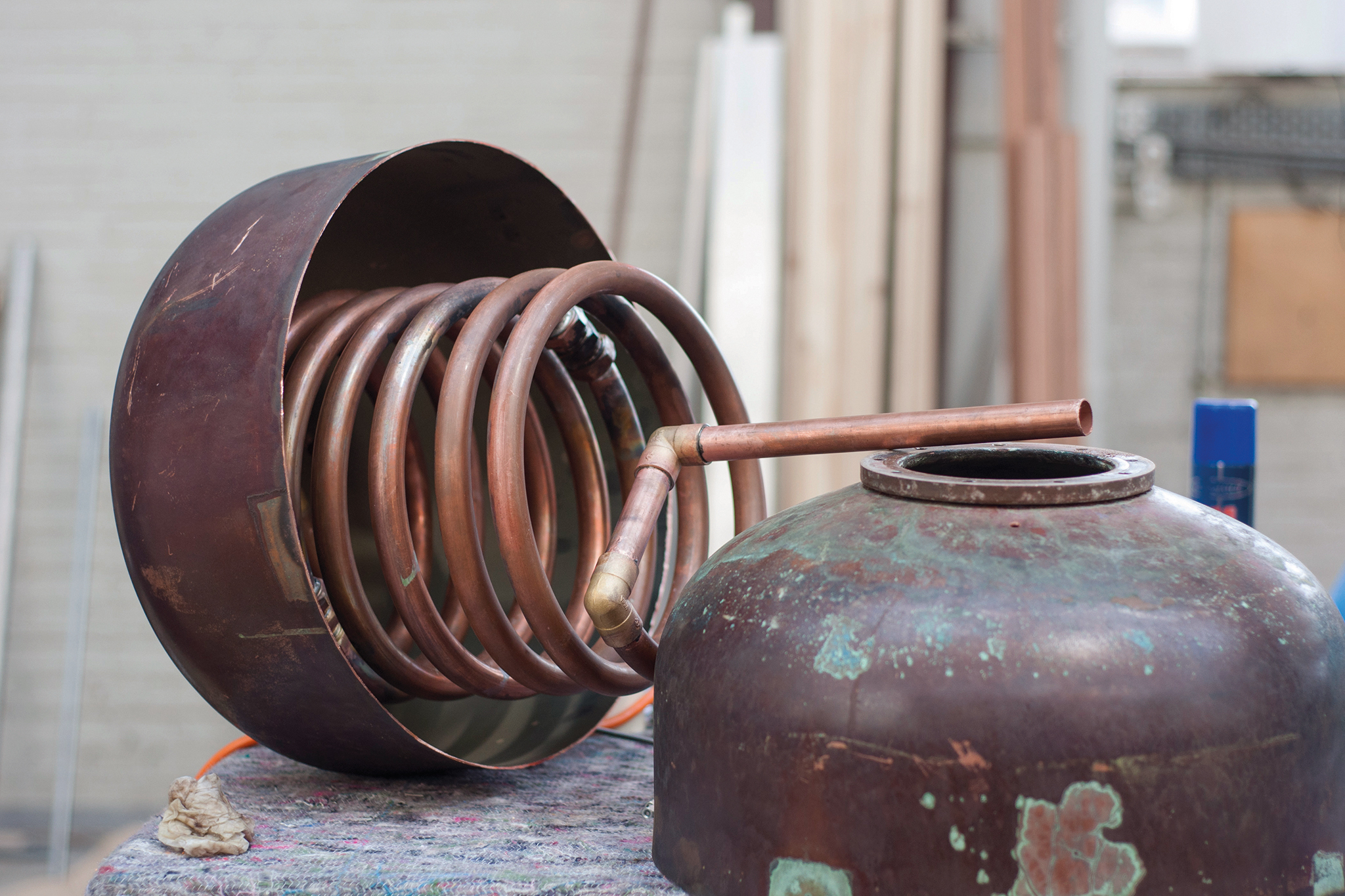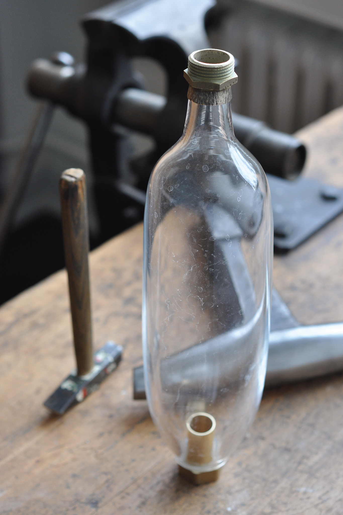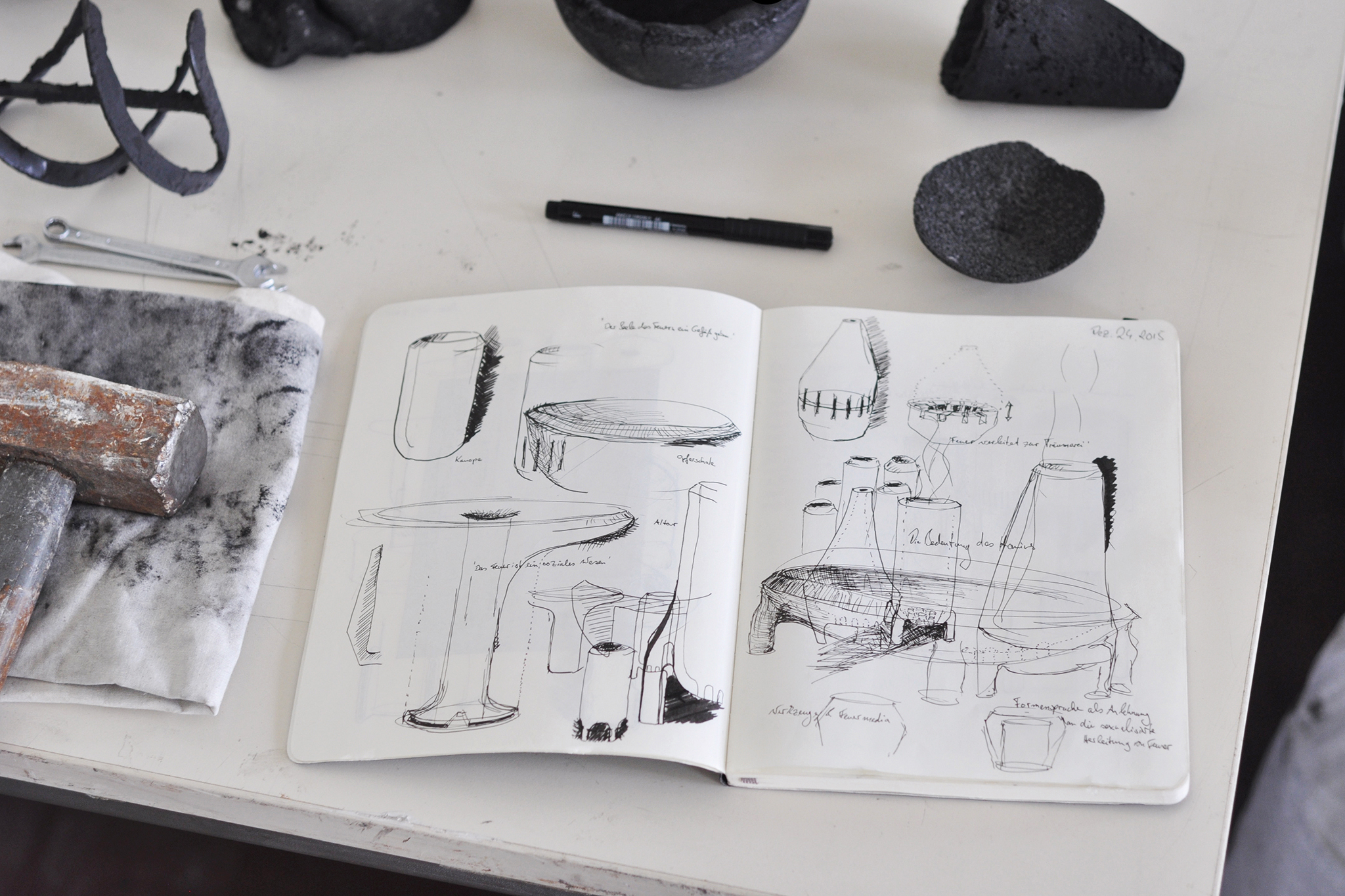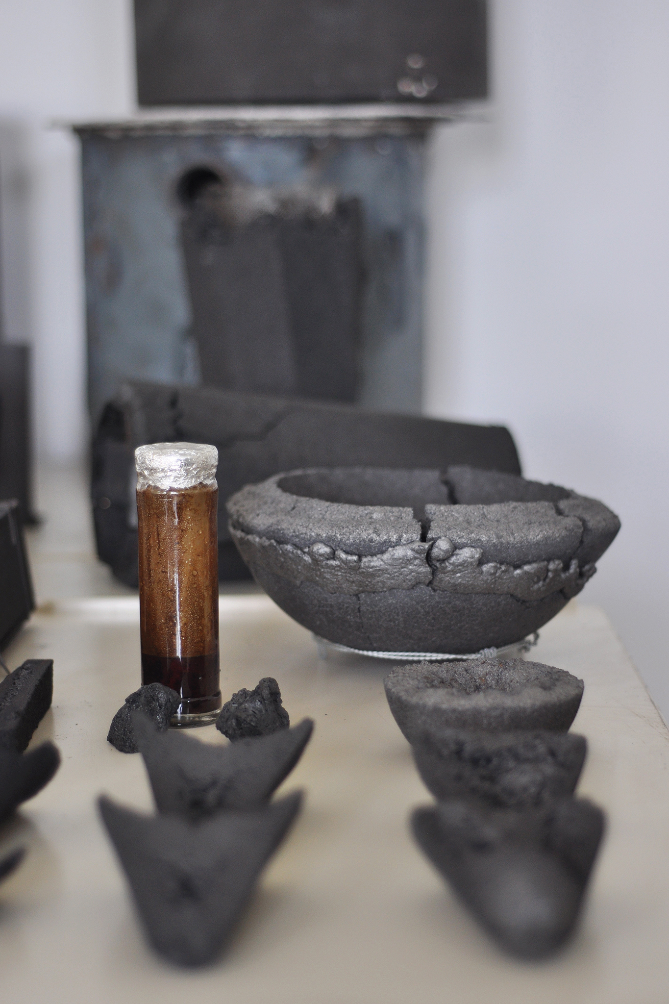 Diesen Prozess wollte er in seinem Projekt nicht nur intellektuell untersuchen, sondern handwerklich-ästhetisch umsetzen. In ersten Entwürfen entwickelte er seine eigene Miniatur-Kokerei. Er ging dabei von einem Keramikofen als Basis aus. Im Zentrum und Kern des Ofens steckte die Retorte. Sie beinhaltet die Kohle, schirmt sie ab von Sauerstoff und schützt sie so vor dem Verbrennen. Zwei mundgeblasene Glaskolben fangen den bei der Destillation entstehenden Teer und andere Flüssigkeiten auf. Ein großer, mit Wasser gefüllter Kupferbehälter funktioniert als Kühlelement. Gase, die nicht verflüssigt werden, werden über ein besonderes Rohr ausgeleitet und bei ihrem Austritt verbrannt.