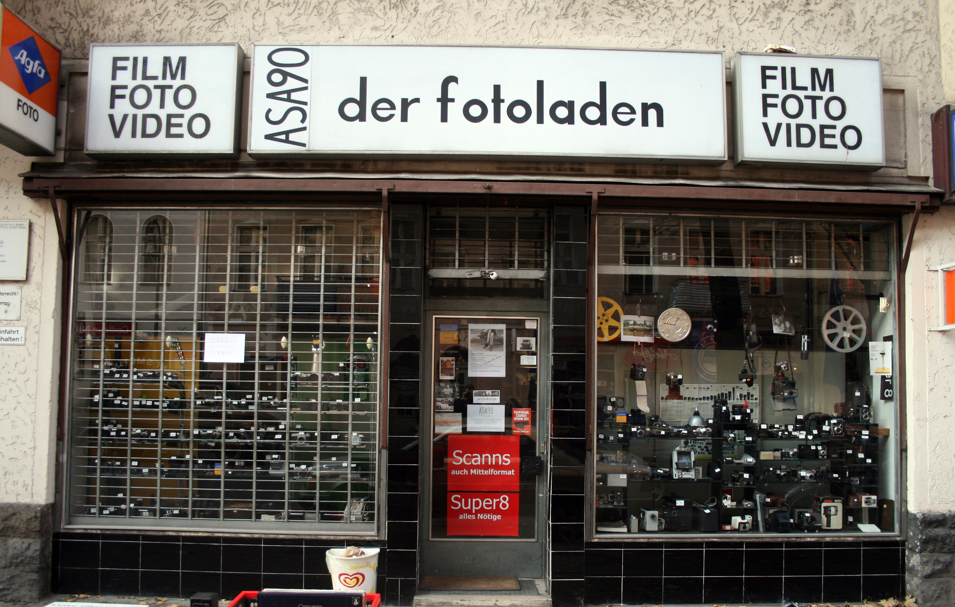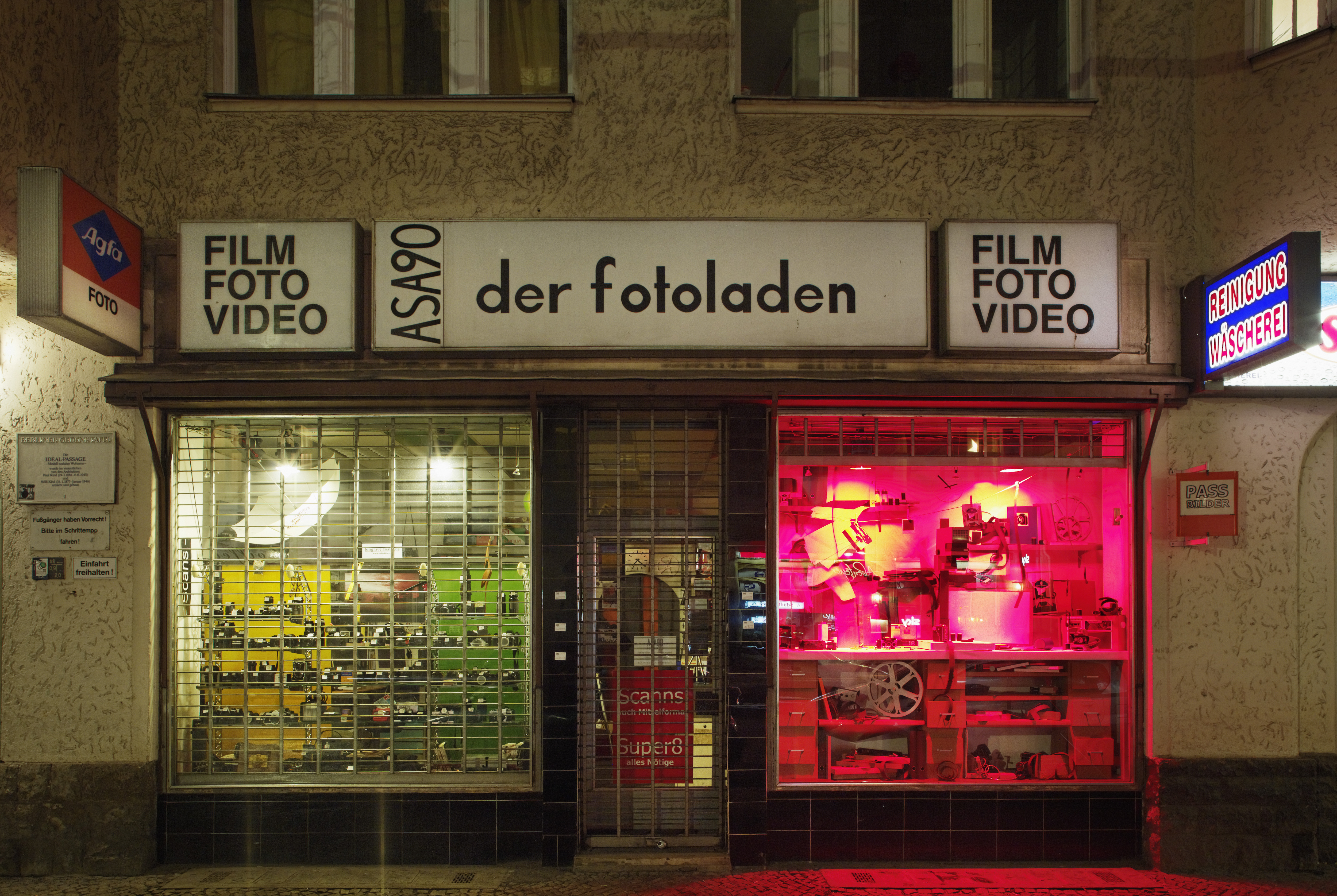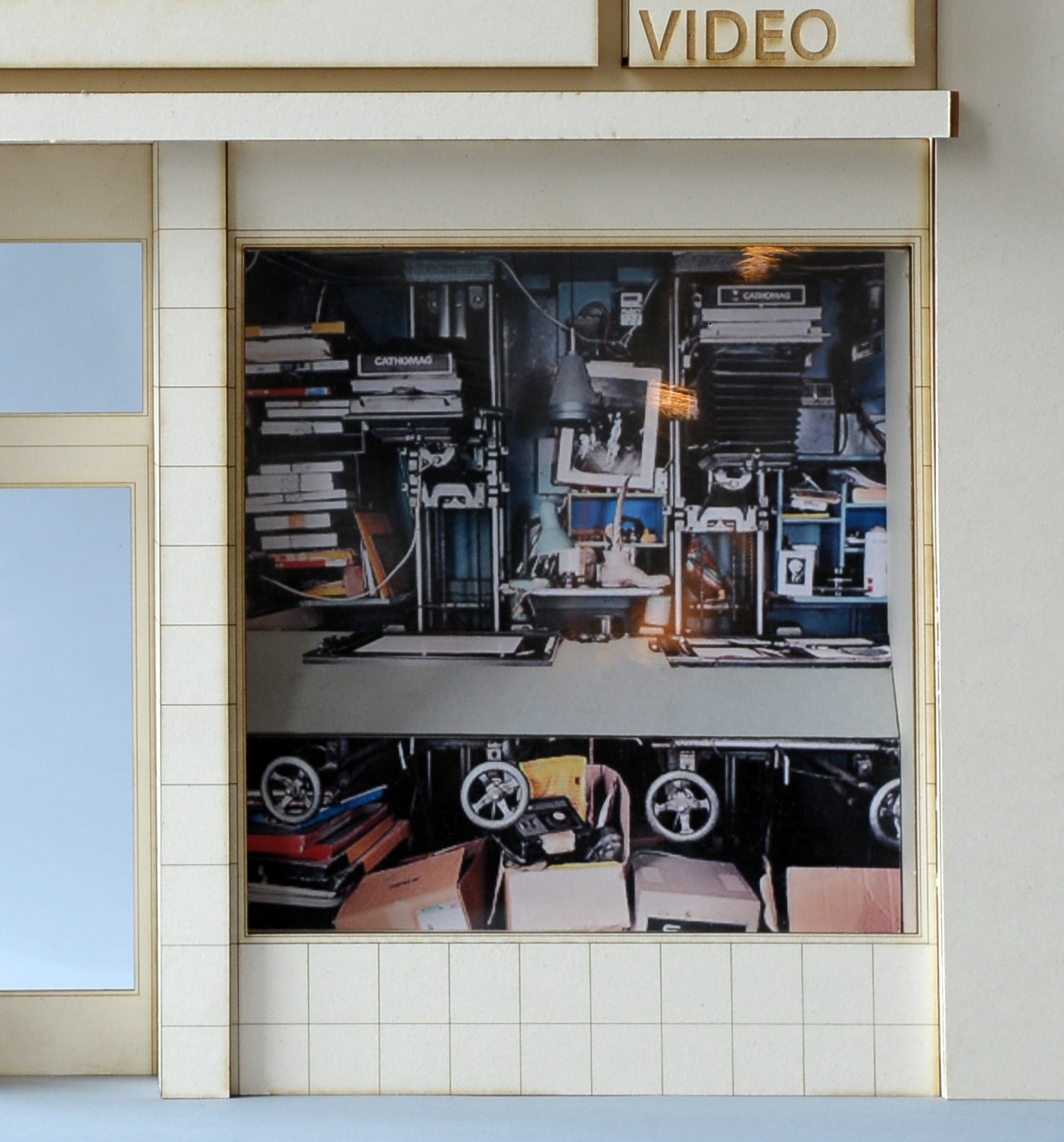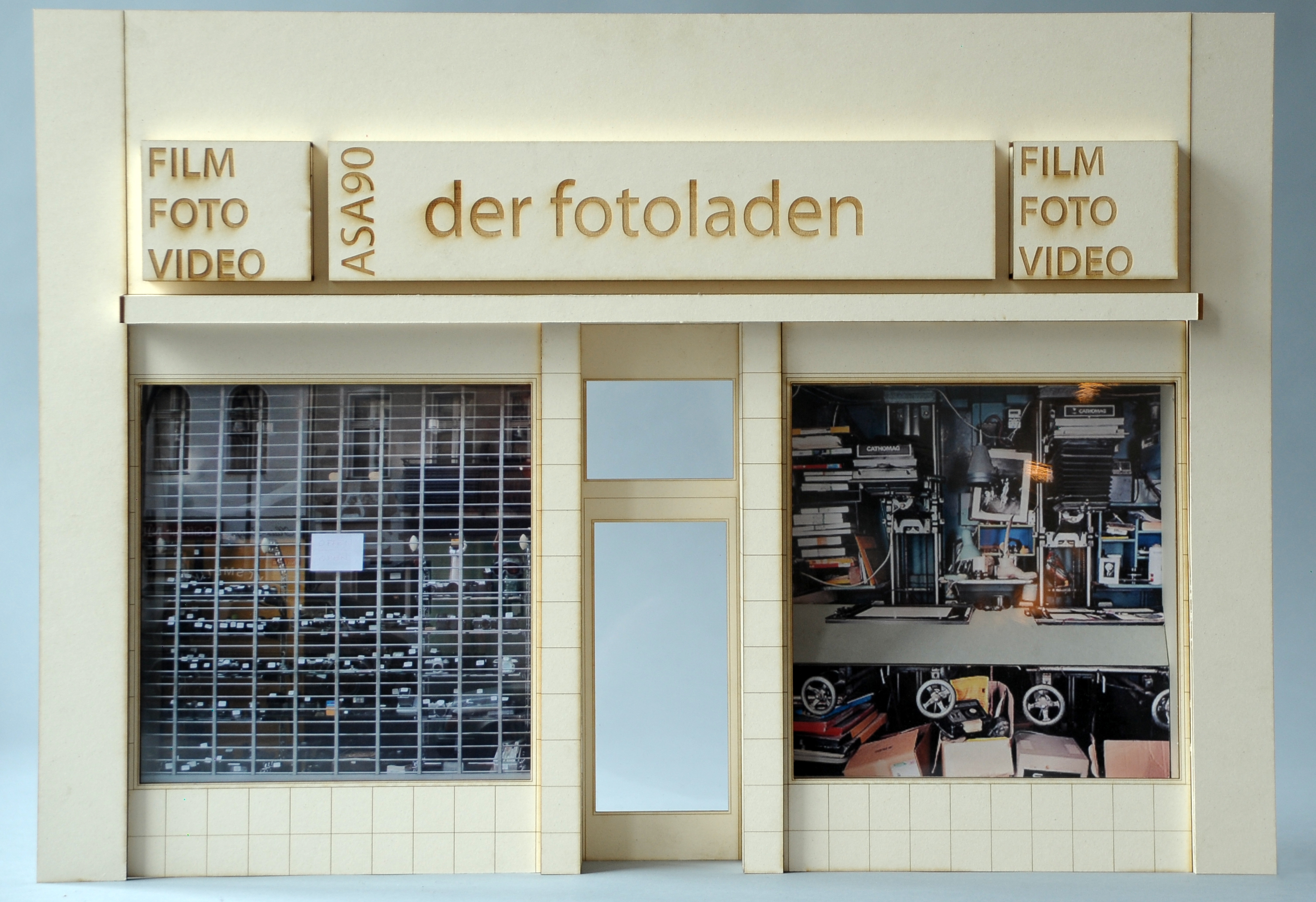 Meist verweilen Passanten minutenlang vor den Unmengen an Kameras, Objektiven und anderen Schätzen, welche sich im Schaufenster zu einer schwarzen Wand auftürmen. Als Ausgangspunkt für die Installation einer Dunkelkammer aus Pappe in das Schaufenster war das Angebot an analogen Kameras und die Tatsache, etwas, was eigentlich stets im Dunkeln sein muss,in das Schaufenster zu bringen und für Jedermann sichtbar zu machen. Damit die einzelnen, sehr fein gearbeiteten Kameras in der Fülle der Objekte nicht untergehen, besteht die Dunkelkammer nur aus Papier und Pappe, die durch ihren plakativen Charakter die Kameras hervorhebt und in Szene setzt.