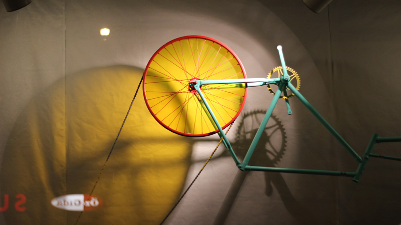 Nun spannen sich Fahrradrahmen hoch wie Torbögen, meterlange Fahrradketten umfassen Felgen und treiben Laufräder, Scheiben und Dynamos an – ein riesiges Mobile ist in die Schaufenster eingezogen und setzt dem regen Treiben auf der Hauptstrasse seine eigene Dynamik entgegen.