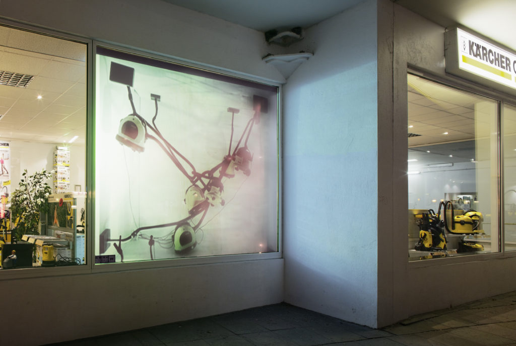 Die 8-minütige Schaufensterprojektion zeigt 22 einzelne Installationen aus Staubsaugern. Der Ablauf ist jedes Mal ähnlich, das Ergebnis immer verschieden: Die Staubsauger werden einzeln im Raum festgesaugt und nach und nach verbunden.
