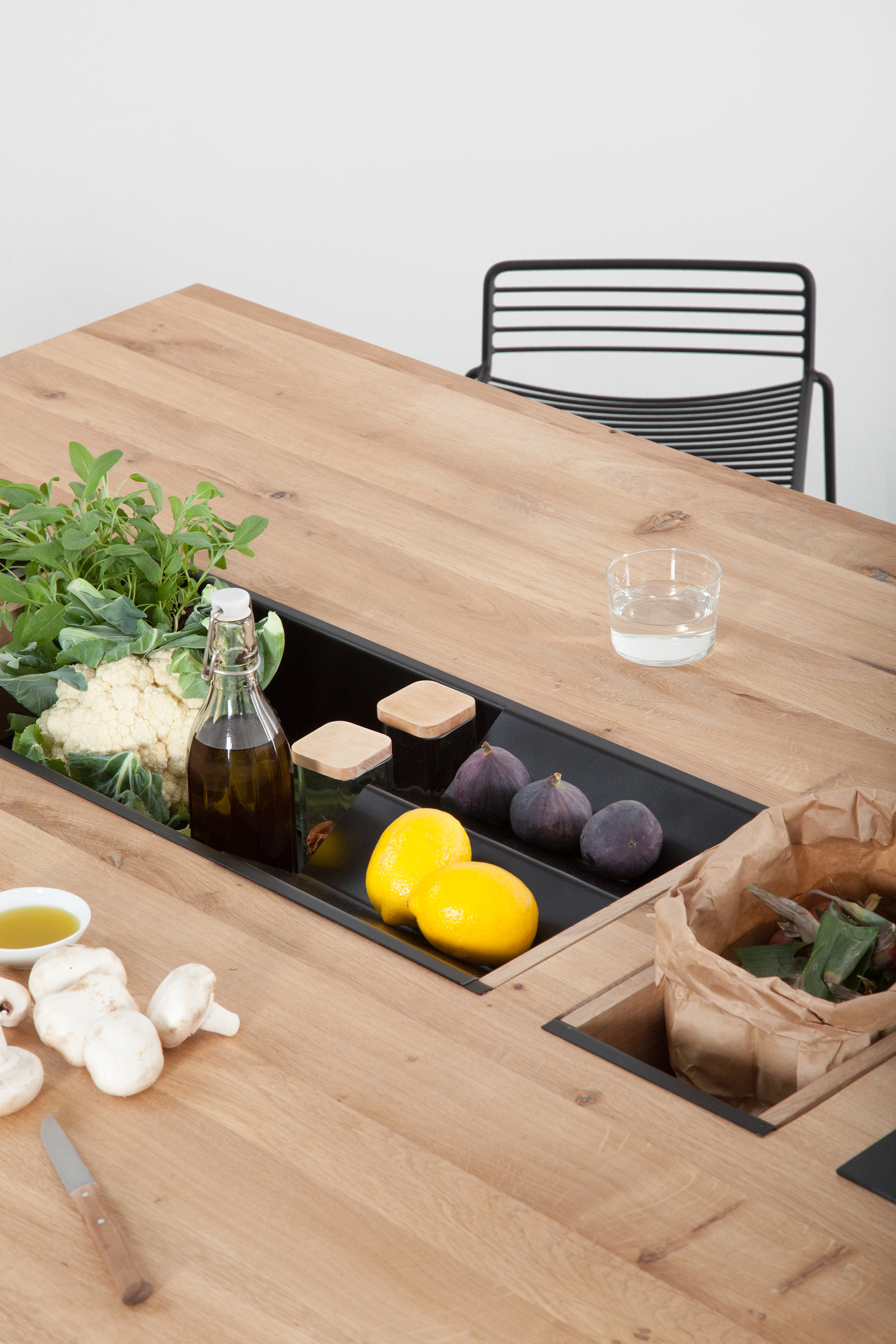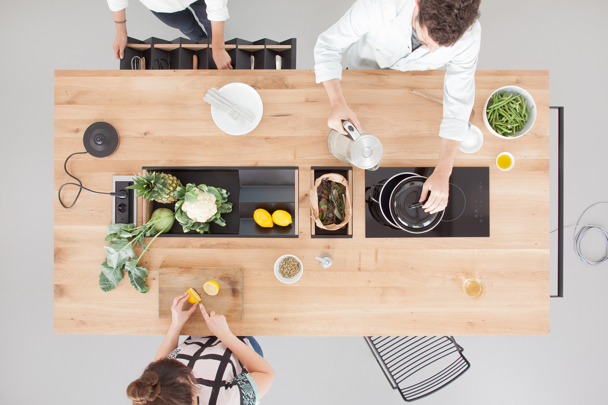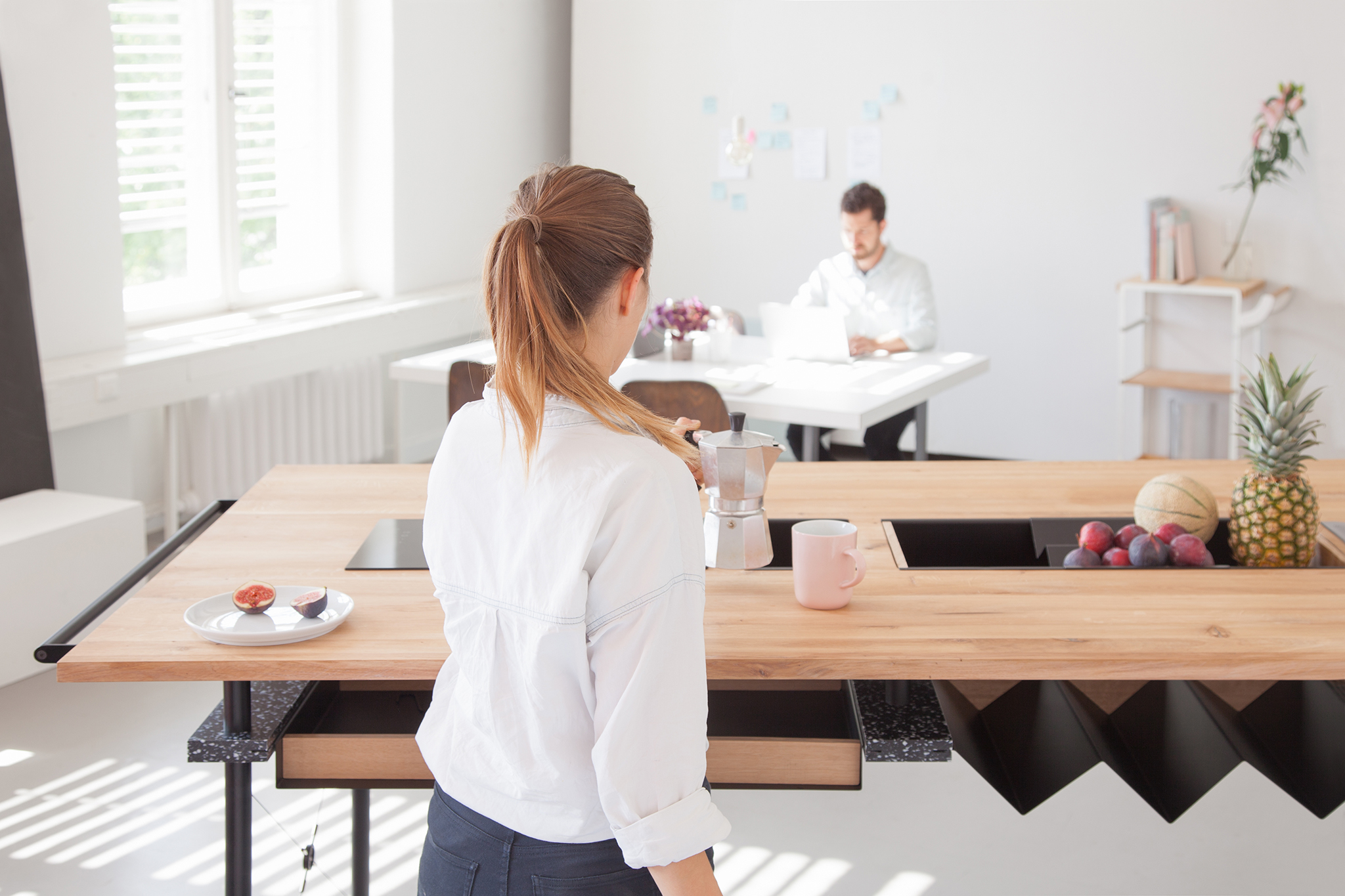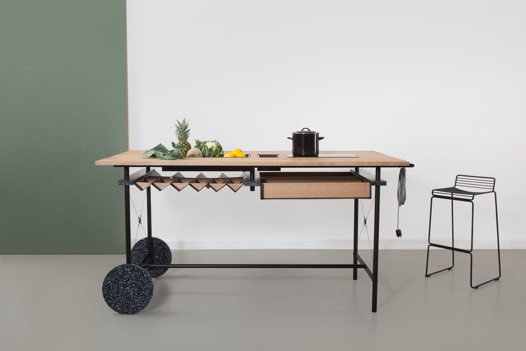 Der Tisch als Insel in der Mitte des Raumes funktioniert als zentraler Treffpunkt für die Mitarbeiter. An einem Ort wie dem Coworking space, geprägt von temporärer Nutzung, garantieren zwei Räder die notwendige Flexibilität, denTisch bei Bedarf verstellen zu können. Damit der Tisch zum Kochplatz wird, ist in die Tischplatte ein Induktionskochfeld, eine Steckdose und Fächer für Stauraum eingelassen. Zusätzlicher Stauraum für Geschirr und Kochutensilien bieten die vier großen Schubladen aus gefalztem Metallblech unter der Tischplatte. Wenn der Tisch temporär zum Arbeitsplatz umfunktioniert wird, deckt eine Metallplatte den Herd ab.