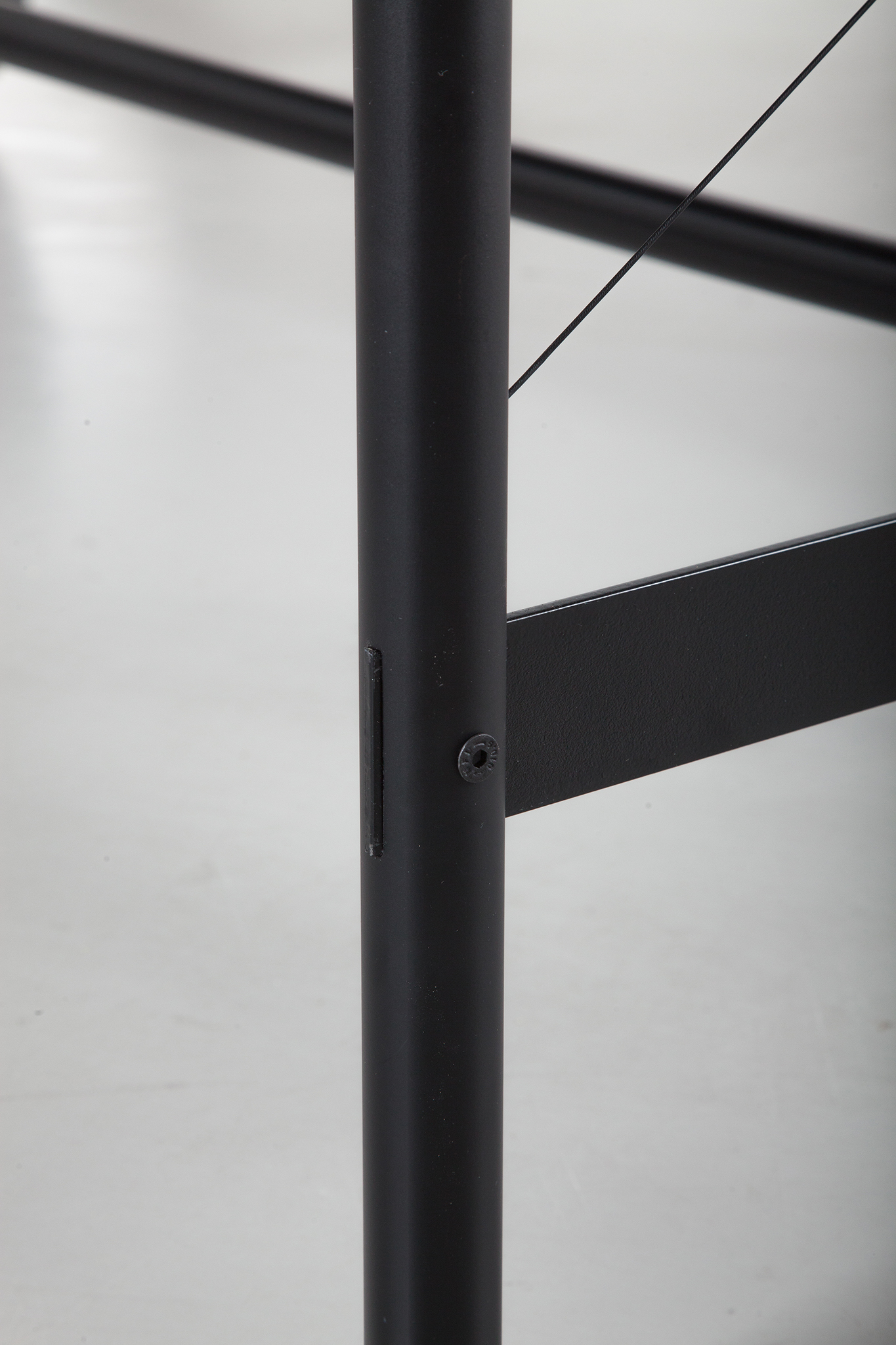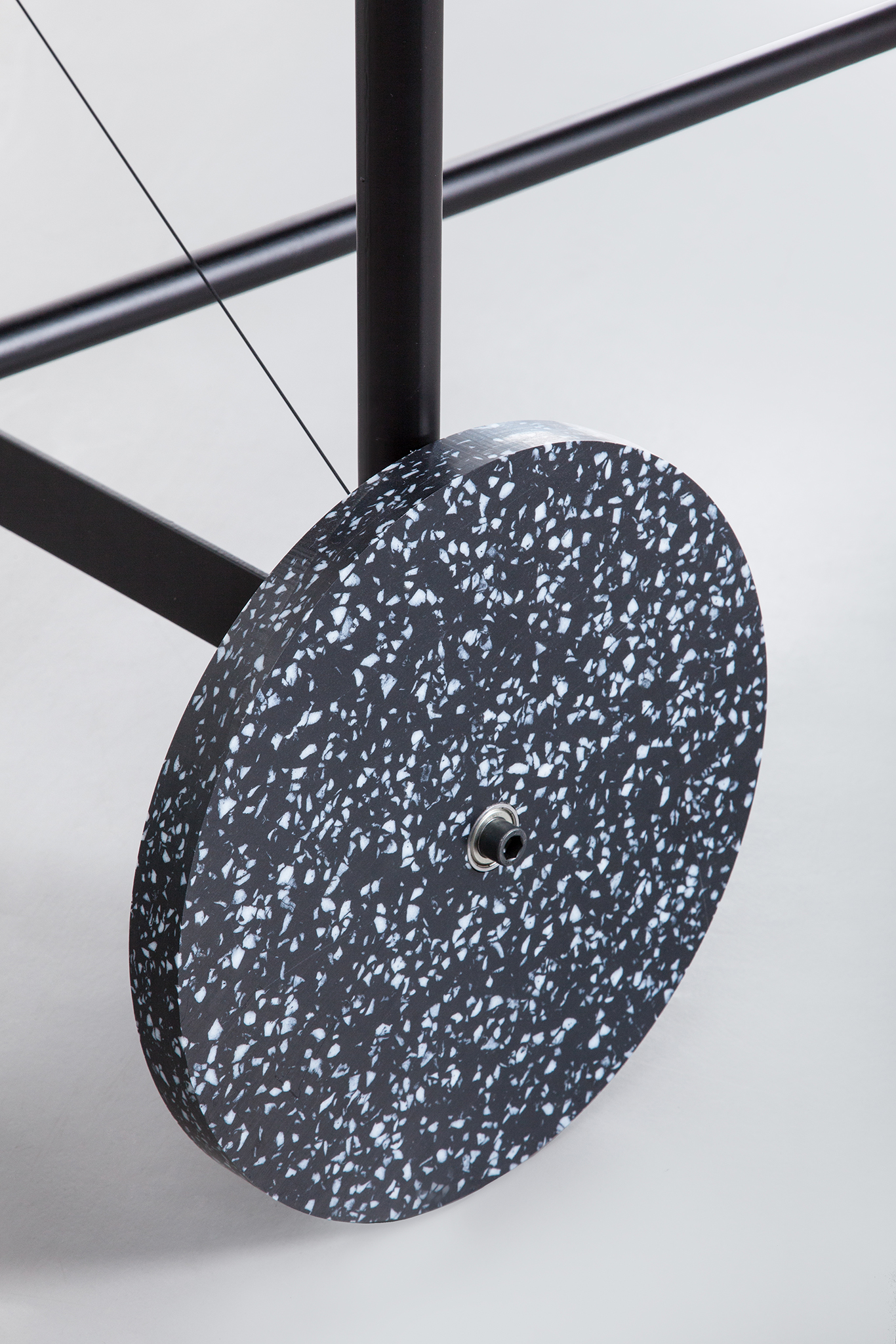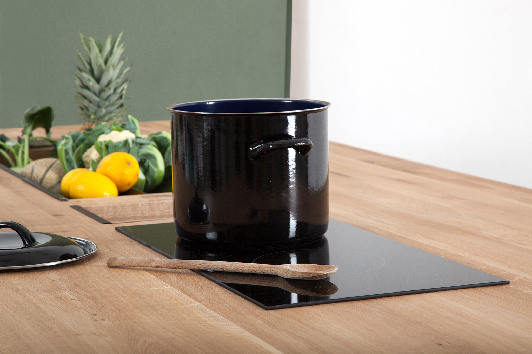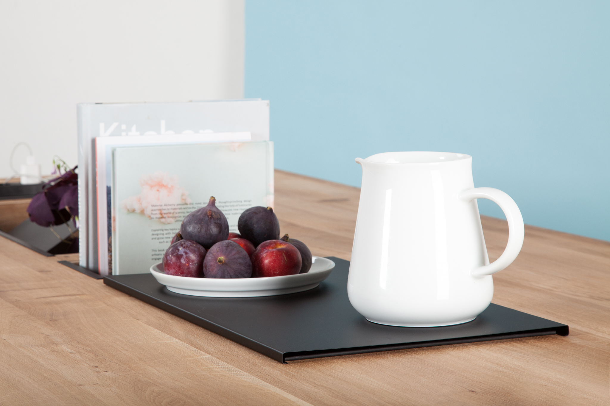 Der Tisch als Insel in der Mitte des Raumes funktioniert als zentraler Treffpunkt für die Mitarbeiter. An einem Ort wie dem Coworking space, geprägt von temporärer Nutzung, garantieren zwei Räder die notwendige Flexibilität, denTisch bei Bedarf verstellen zu können. Damit der Tisch zum Kochplatz wird, ist in die Tischplatte ein Induktionskochfeld, eine Steckdose und Fächer für Stauraum eingelassen. Zusätzlicher Stauraum für Geschirr und Kochutensilien bieten die vier großen Schubladen aus gefalztem Metallblech unter der Tischplatte. Wenn der Tisch temporär zum Arbeitsplatz umfunktioniert wird, deckt eine Metallplatte den Herd ab.