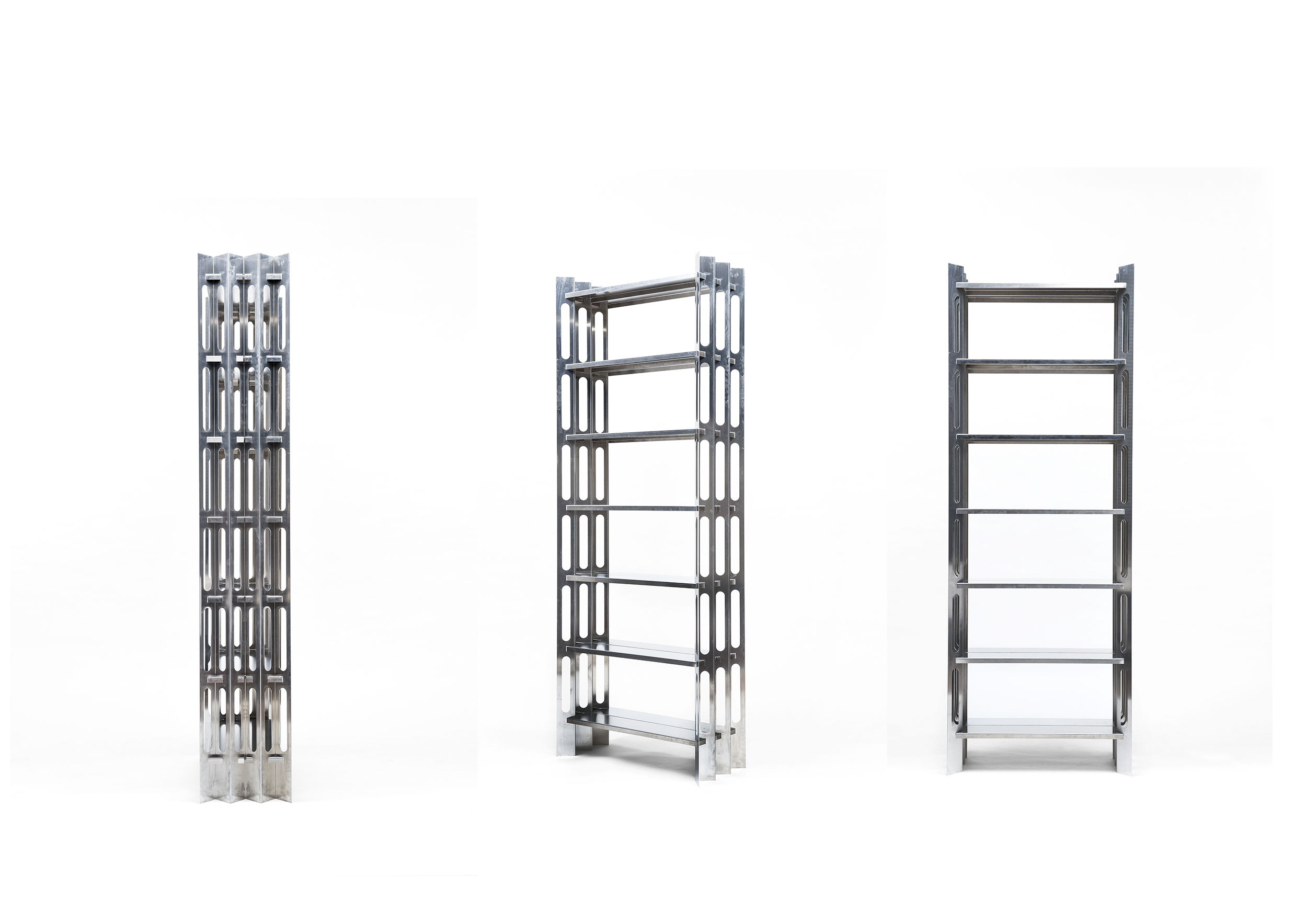 Die übliche Lieferzeit bei Möbeln beträgt acht Wochen. Wenn ich in sechs Wochen mindestens zehn Bestellungen habe, ist der Kleinserienfaktor erfüllt. Daraus ergibt sich ein Produktionspreis von unter 200€ inklusive Pulverbeschichtung und ermöglicht einen Verkaufspreis von unter 600€. Das ist im vergleichenden Wettbewerb ein absolutes Alleinstellungsmerkmal. Das Regal hat ein Eigengewicht von 45kg und kommt auf ein Gesamtmaß von 866mm Breite, 400mm Tiefe und 2400mm Höhe. Die Materialstärke liegt bei 1,5mm. Die Nutzlast beträgt 1,4t.