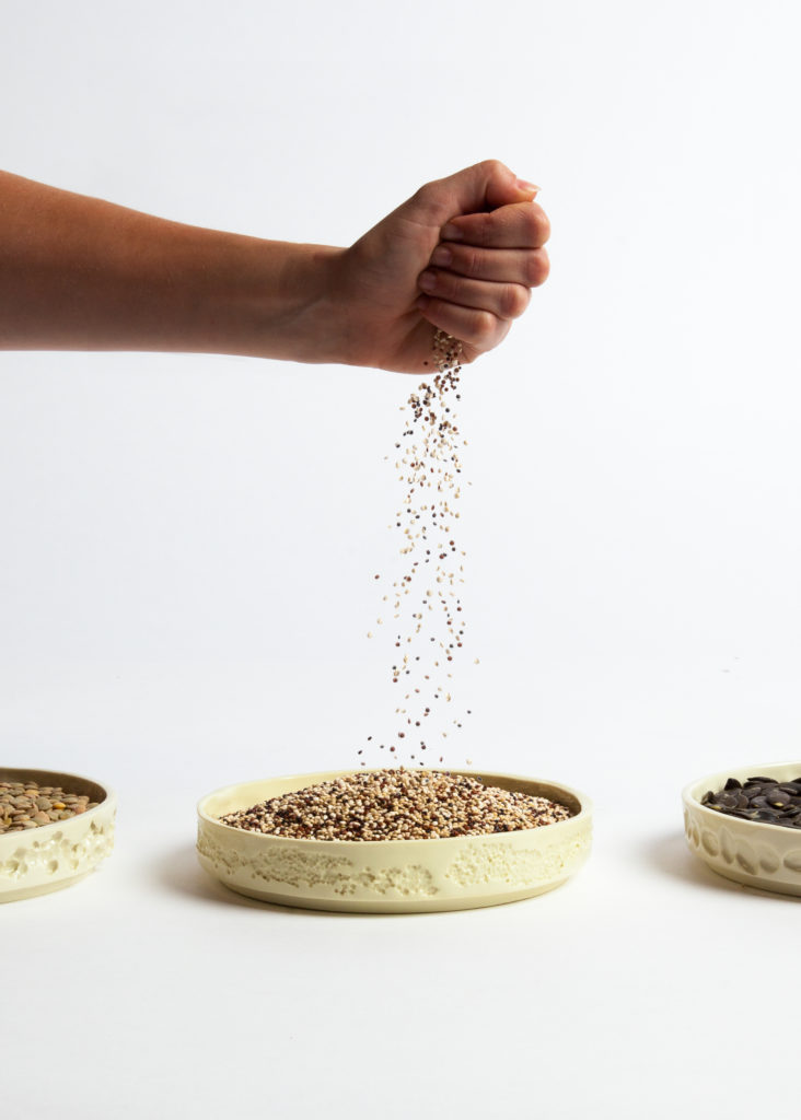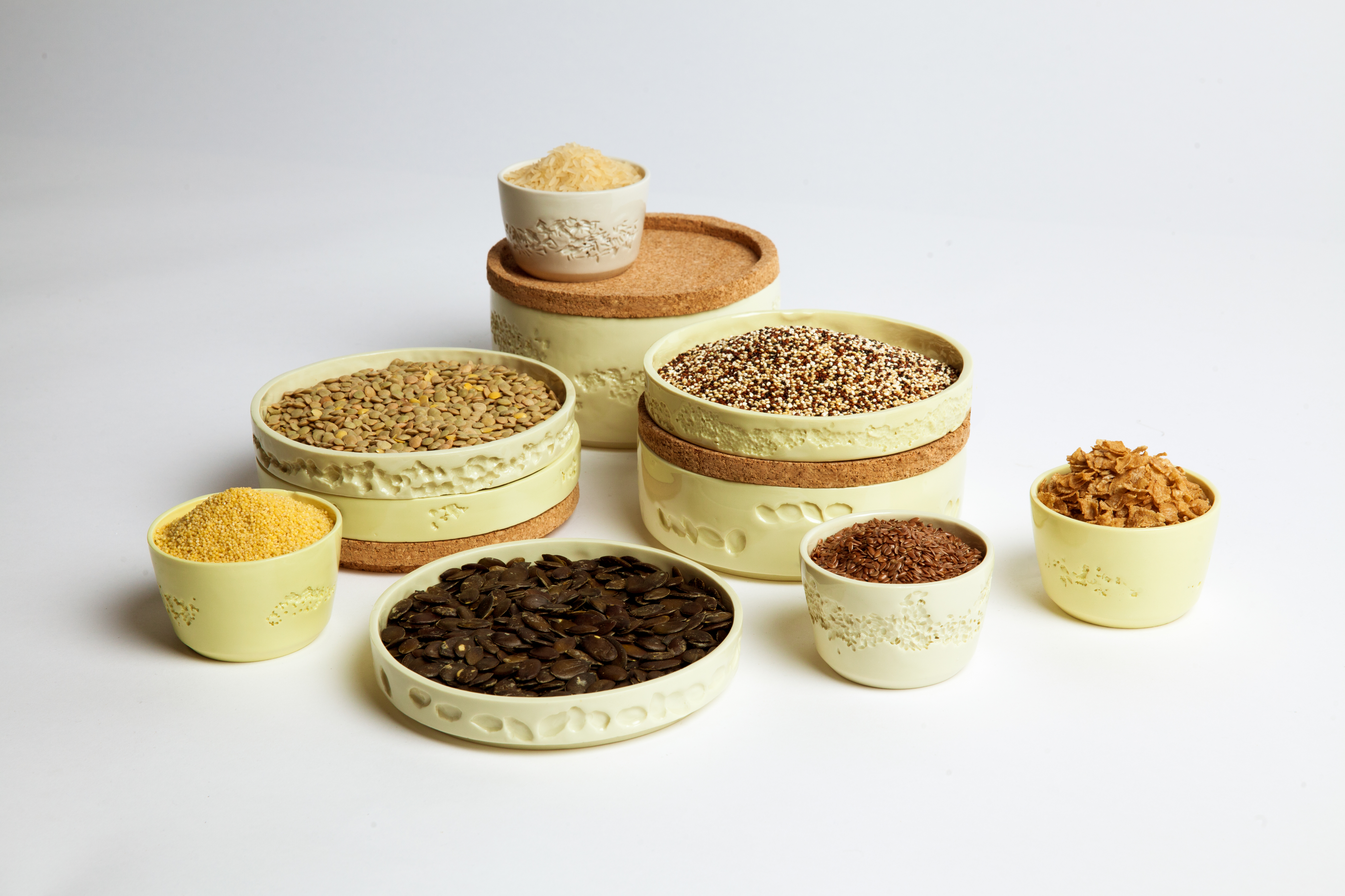 Trace is a collection of cups and bowls that show an individual pattern, a trace. The relief on the outer shell shows grains and seeds, that can be stored inside.