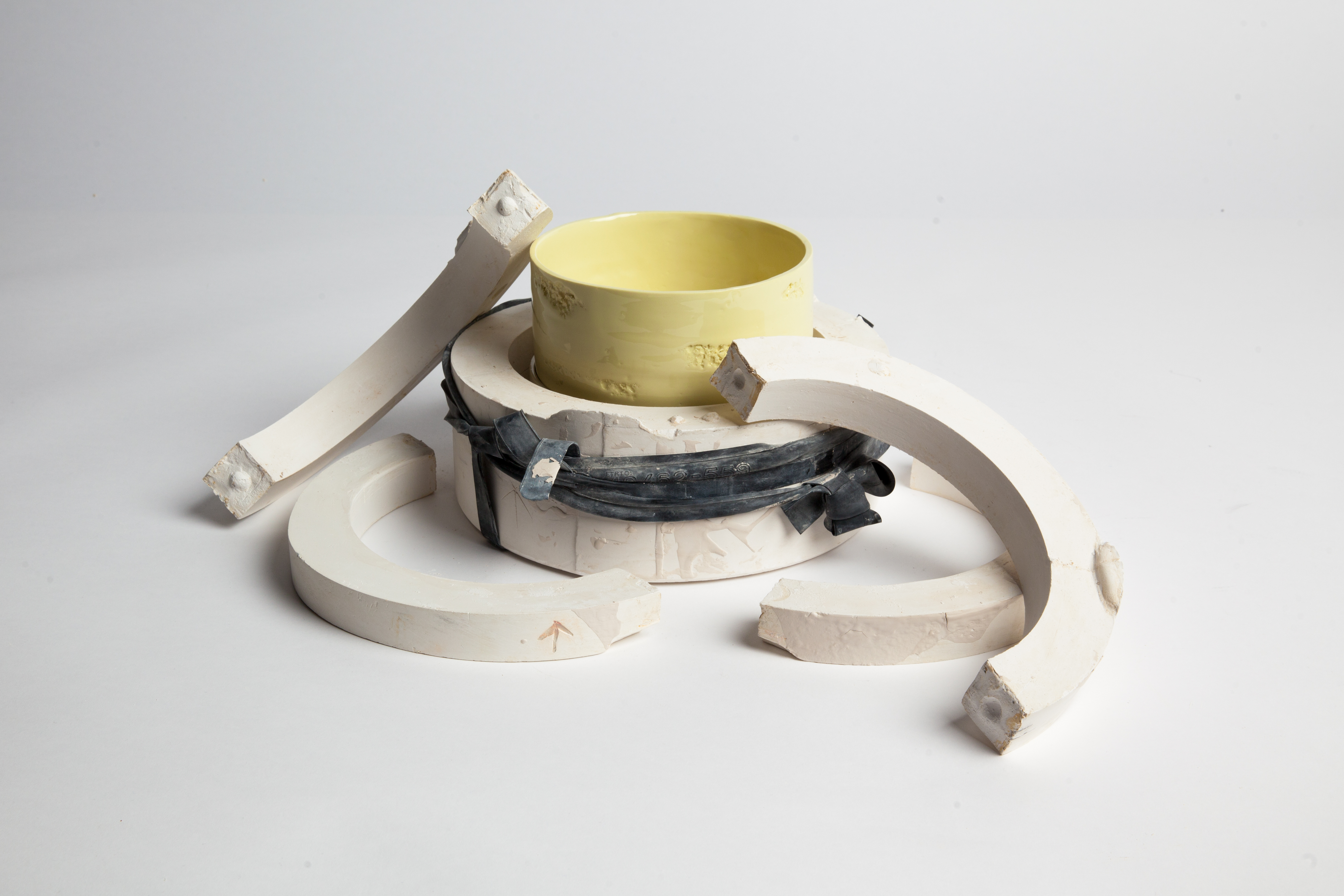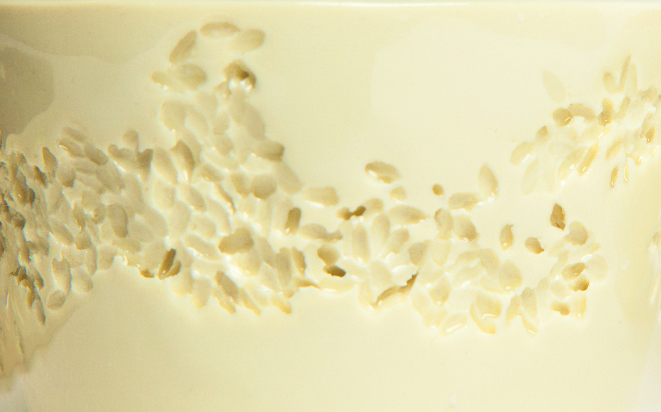 For the shape of the mould I decided for cups and stackable bowls for storing, accompanied by interlayers of cork. The cups show a form family were each outside shows a different structure. Each storing bowl reveals its content through the traces left by the burnt away seed or grain. The coloring of the collections fades from rich yellow to the classical porcelain white. Starting with a porcelain mass enriched with the maximum of pigments, the color fades gradually by adding non pigmented mass mould after mould until the mass completely lost the yellow pigments.